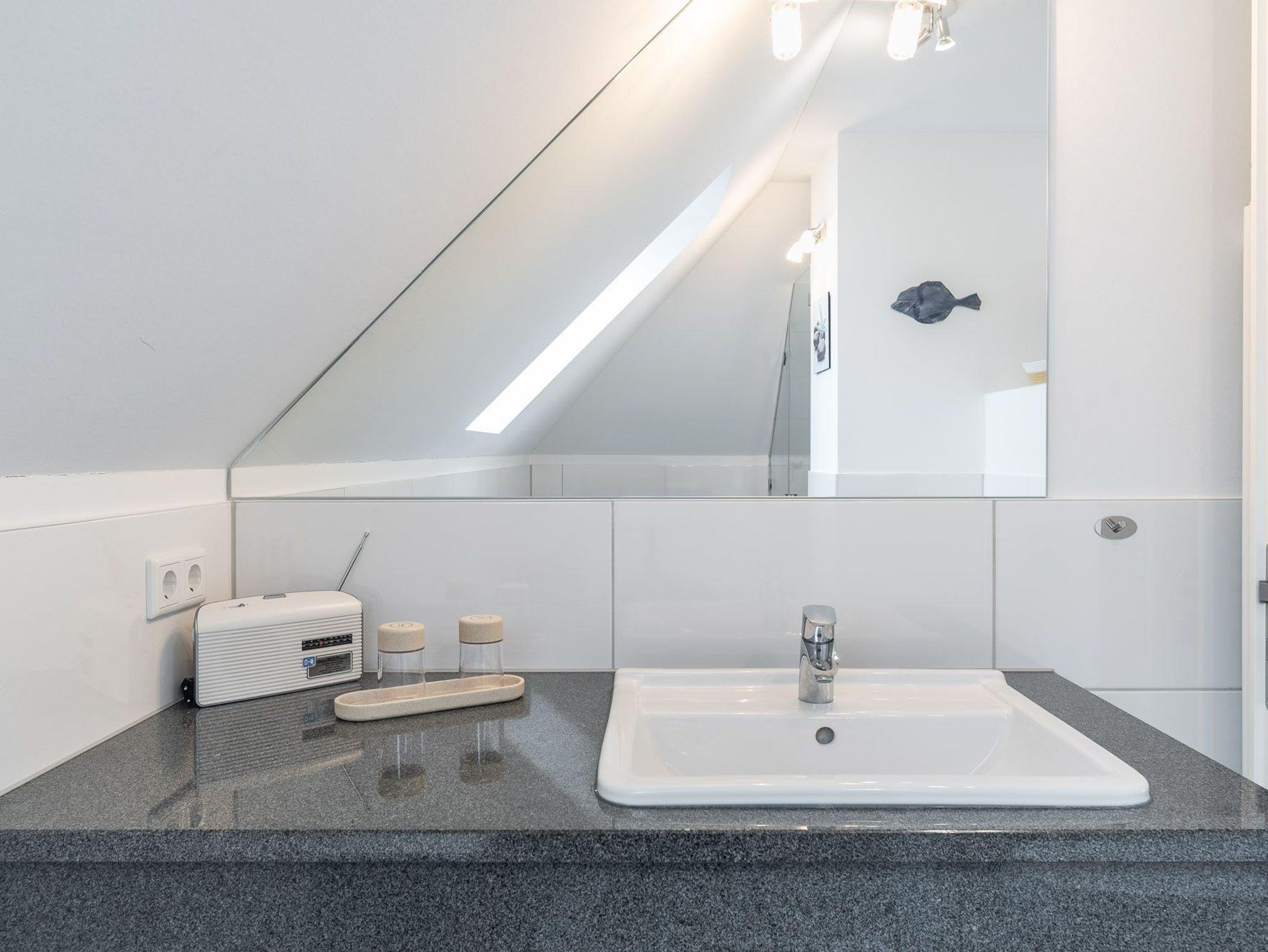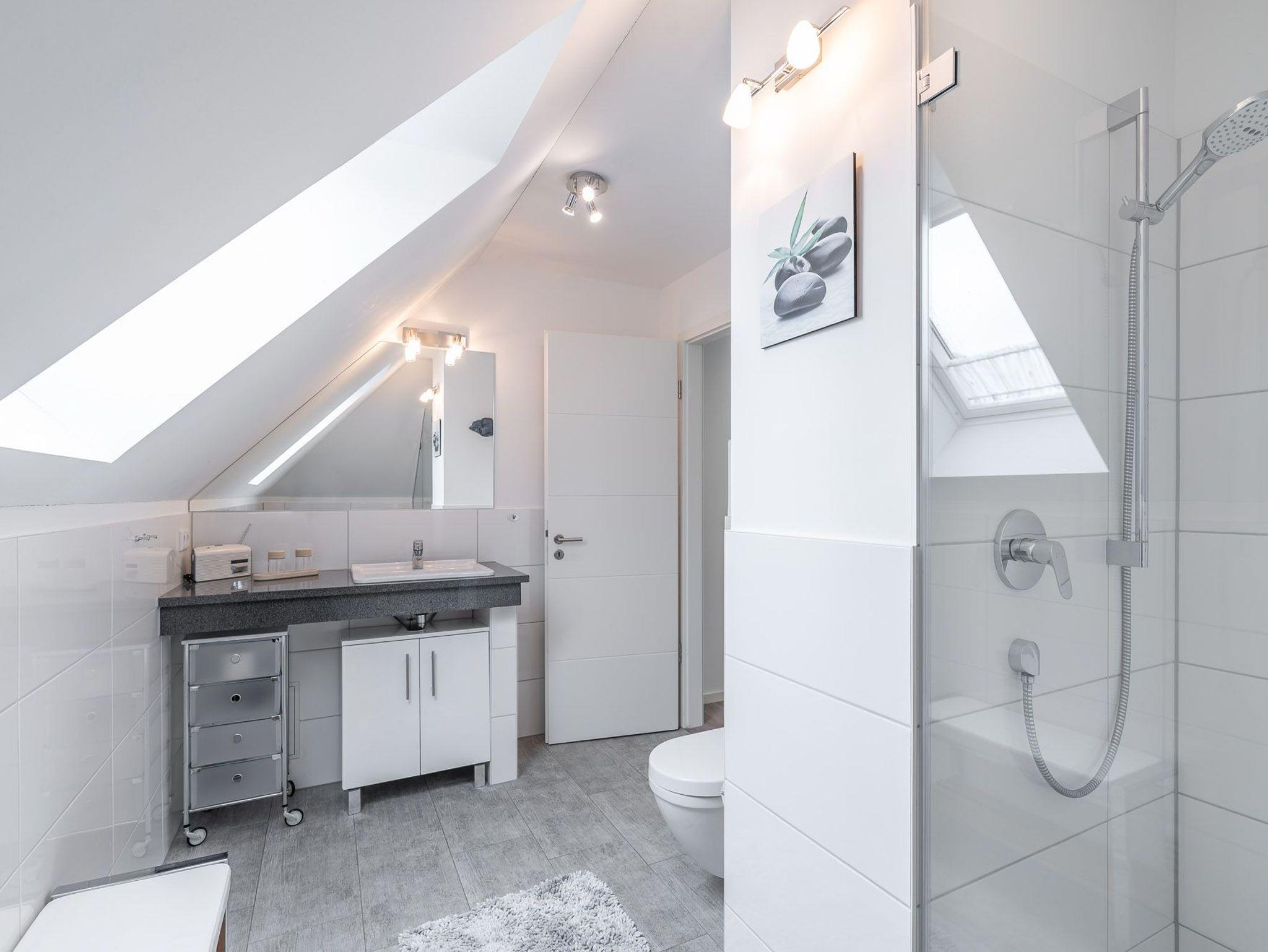 Das Bad mit Tageslicht verfügt über eine großzügige und ebenerdige Dusche, ein Fön ist vorhanden.