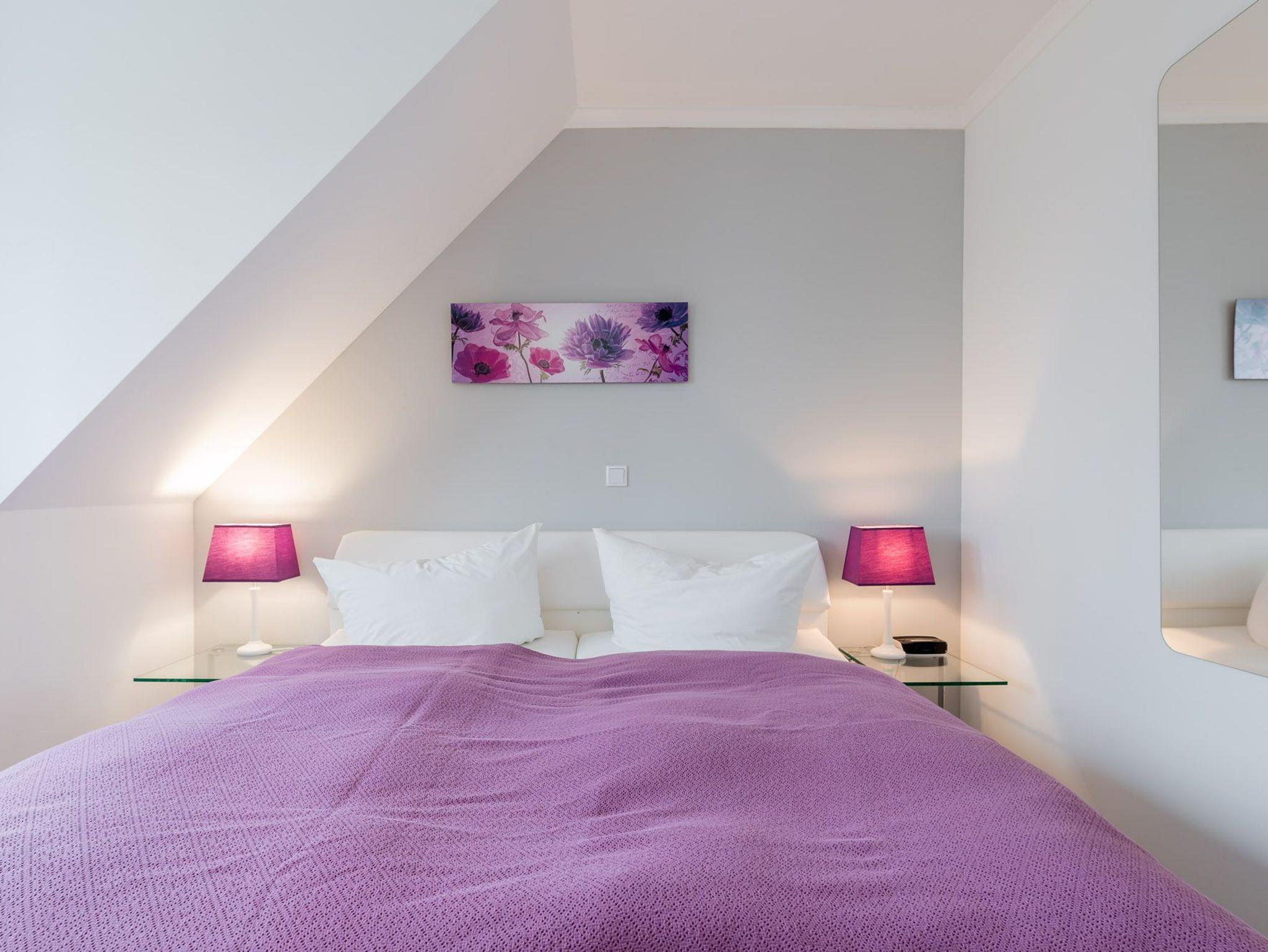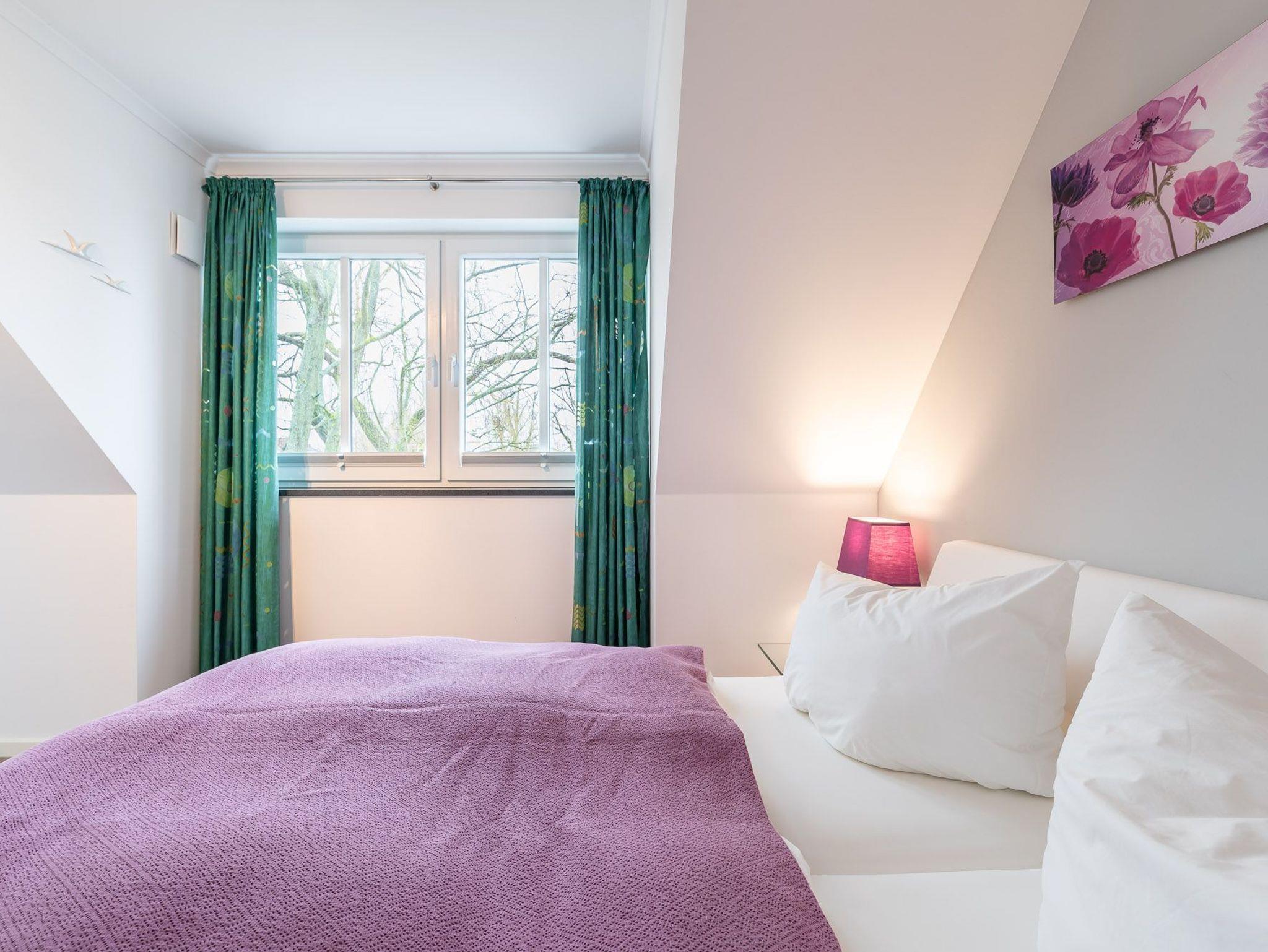 Das hochwertig ausgestattete Schlafzimmer mit Doppelbett, manuell verstellbarem Kopf- und Fußteil, Tonnentaschenfederkernmatratzen, sowie einem Kleiderschrank und Kommode liegt nach Norden.