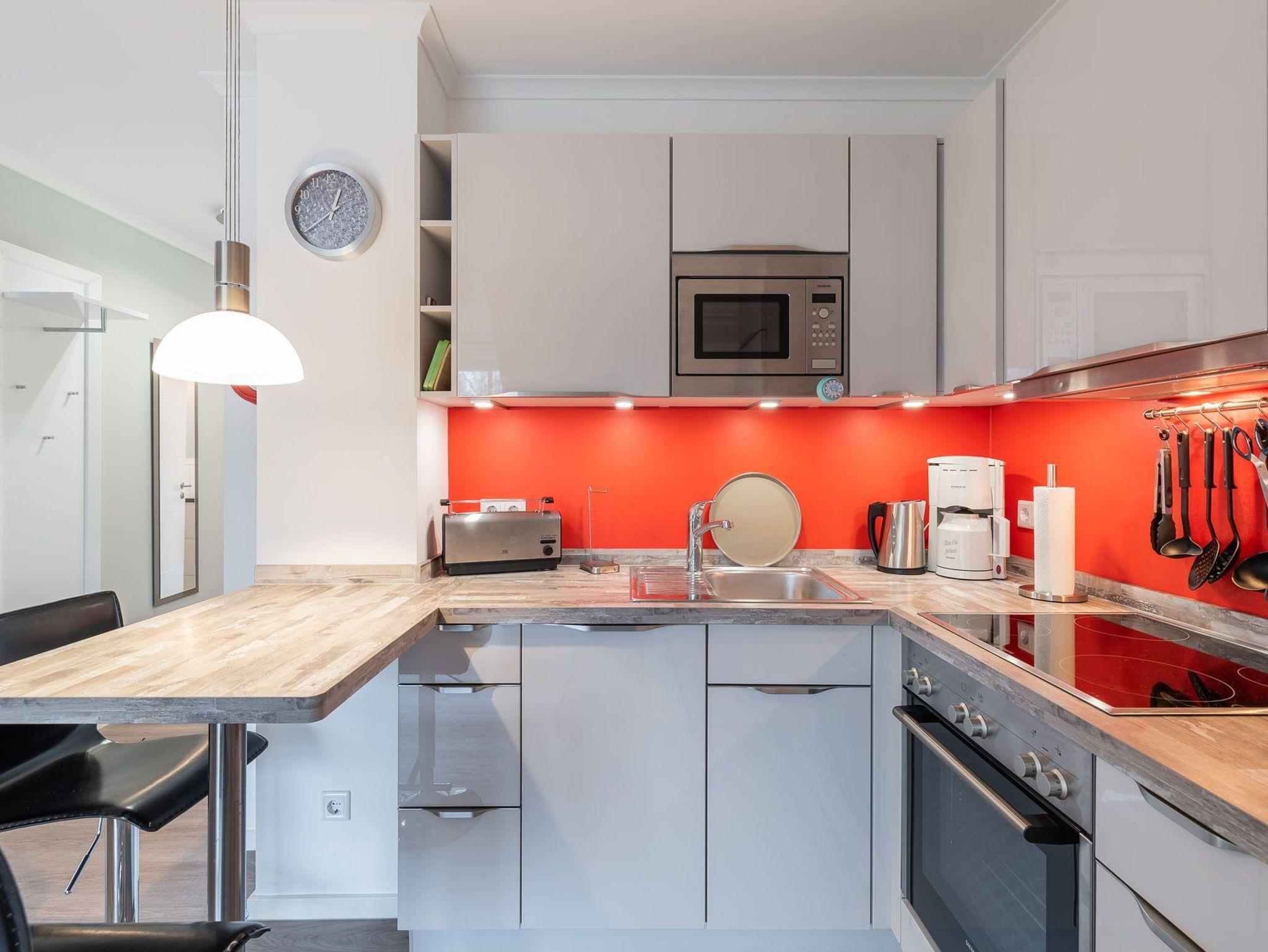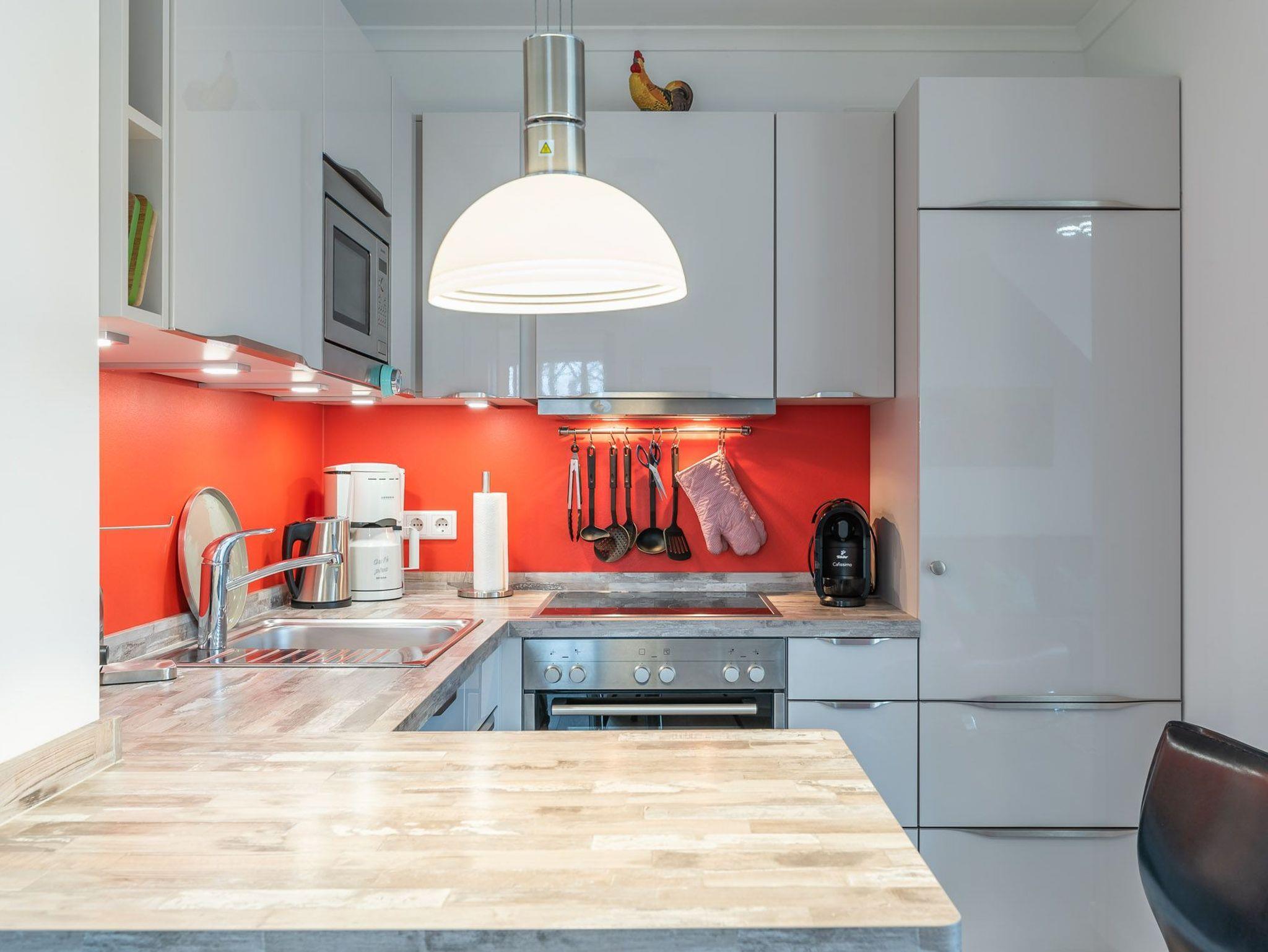 Die in den Wohnbereich integrierte Siemens Eck-Küche ist mit Mikrowelle, Edelstahlherd mit Glaskeramik-Kochfeld und Backofen, Kombi-Kühlschrank, Geschirrspüler, Toaster, Kaffeemaschine, Nespresso-Kapselmaschine, Wasserkocher, sowie einem Essplatz für 2 Personen ausgestattet.