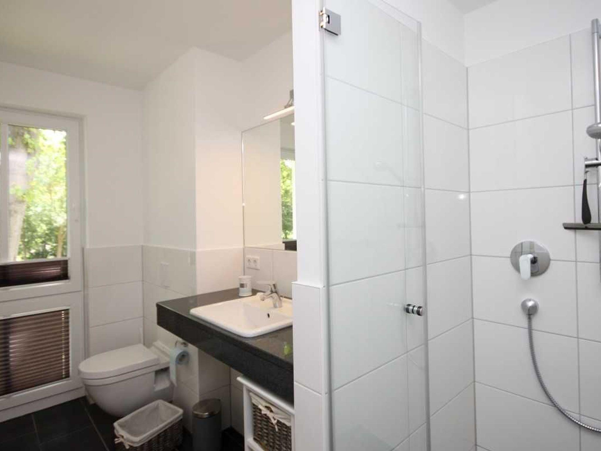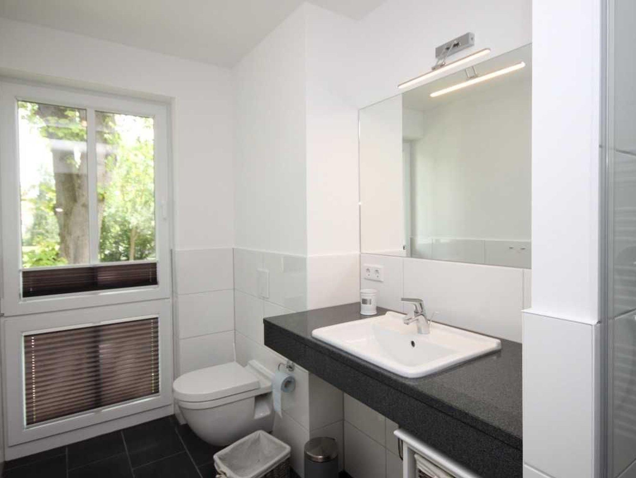 Das Bad mit Tageslicht ist mit einer bodengleichen Dusche, einem großen Waschtisch, einem großen Wandspiegel und einen Haartrockner ausgestattet.