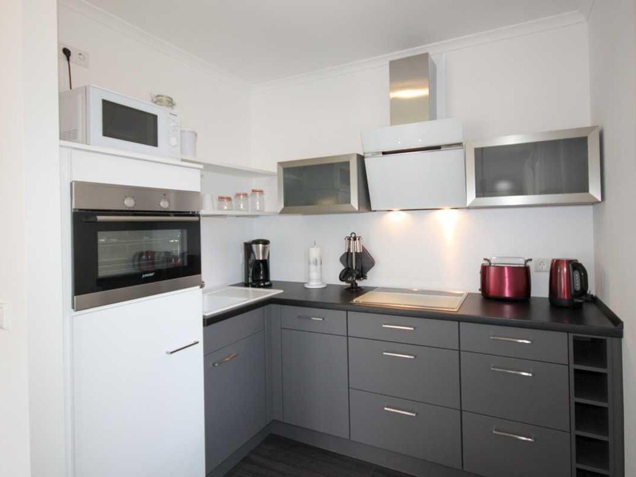 Die moderne Küche ist ausgestattet mit einem Cerankochfeld, Umluftbackofen, Geschirrspüler, Kühl-Gefrier-Kombination, Mikrowelle, Kaffeemaschine, Wasserkocher und Toaster.