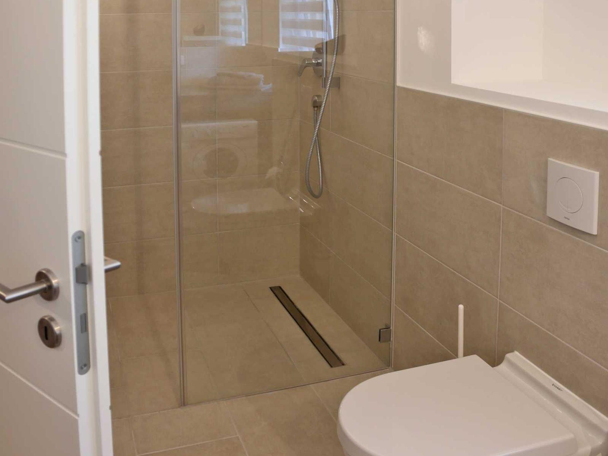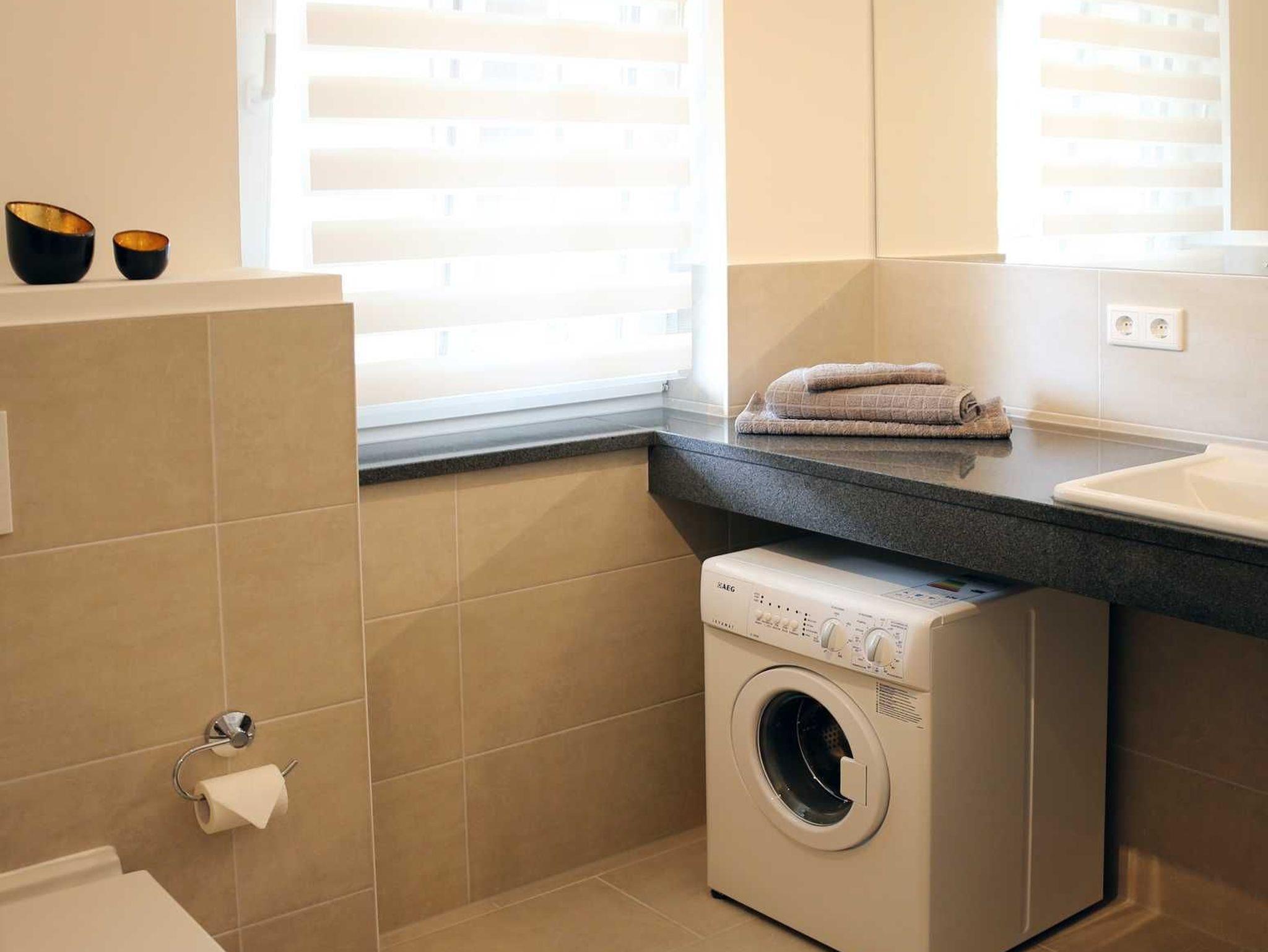 Das neben dem Kinderschlafzimmer liegende Bad verfügt neben den sanitären Anlagen (ebenerdige Dusche, Waschtisch, WC) über einen Haartrockner und eine kleine Waschmaschine, die Sie kostenlos nutzen können.