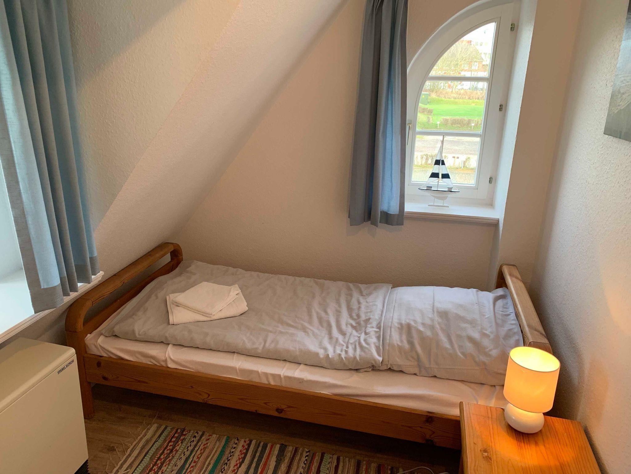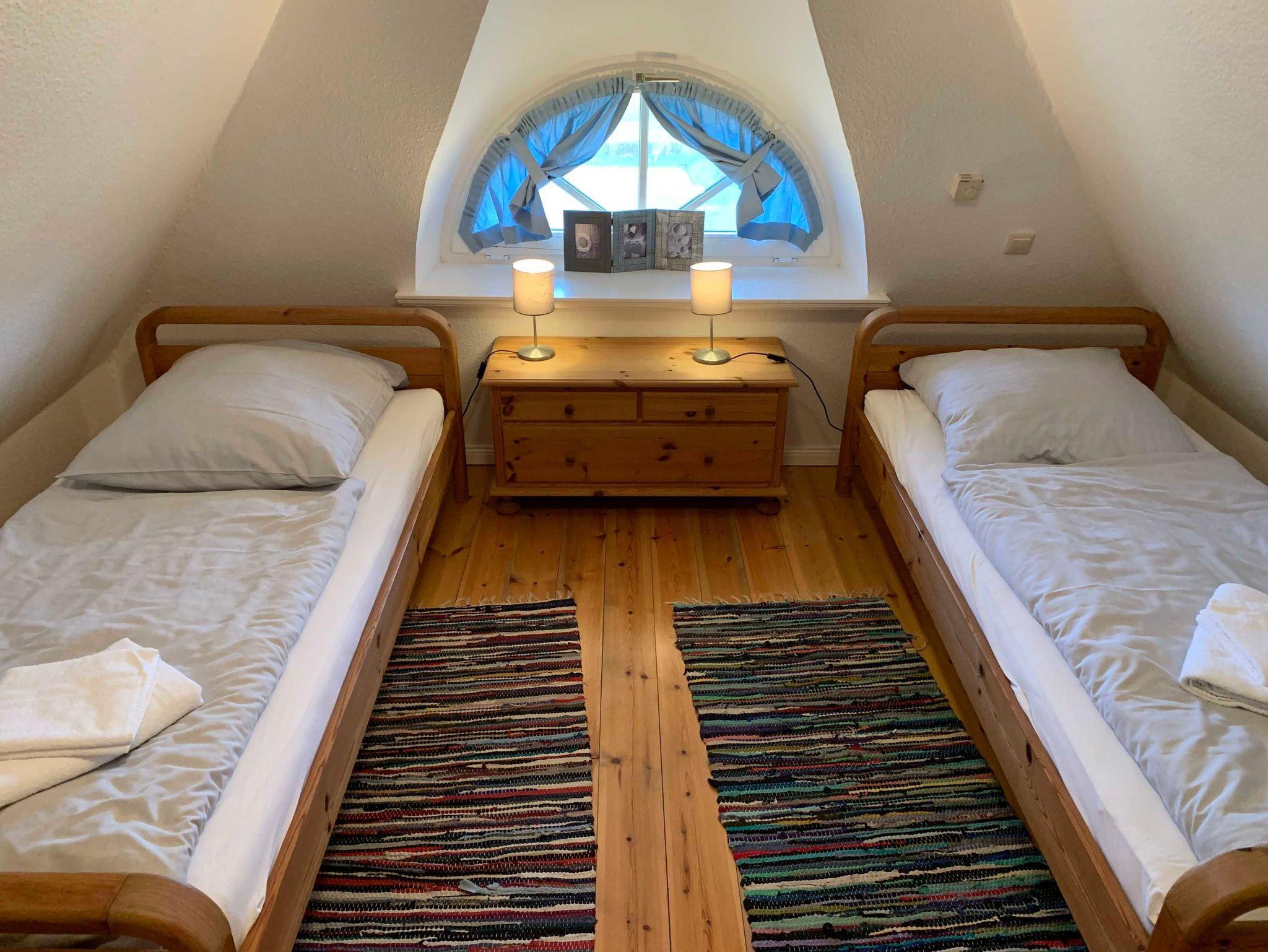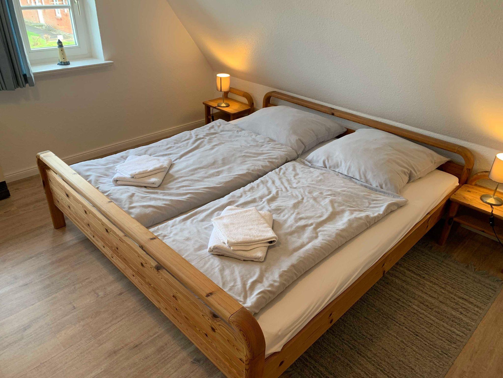 Der Friesenhof ist ein im typisch friesischen Stil erbautes Reetdachgebäude mit eigenständigen Hausteilen, gelegen im Kurzentrum Nordstrand. Der Hausteil ist ca. 90qm groß und ist für bis zu 6 Personen geeignet. Im Erdgeschoss befinden sich das geräumige Wohnzimmer mit Wohn- und Essbereich, die seperate komplett ausgestattet Einbauküche mit Spülmaschine, Mikrowelle usw. Vom Flur aus ist ein zusätzliches Gäste-WC zu erreichen, und vom Wohnzimmer aus geht es auf die möblierte zum Süden liegende Außenterrasse mit eigenem Strandkorb. Zwei Schlafzimmer, eines mit einem Doppelbett und ein weiteres mit zwei Einzelbetten, sowie Dusche/WC befinden sich im 1. Stock, ein drittes Schlafzimmer mit ebenfalls zwei Einzelbetten im oberen als Galerie ausgebauten Giebelzimmer.