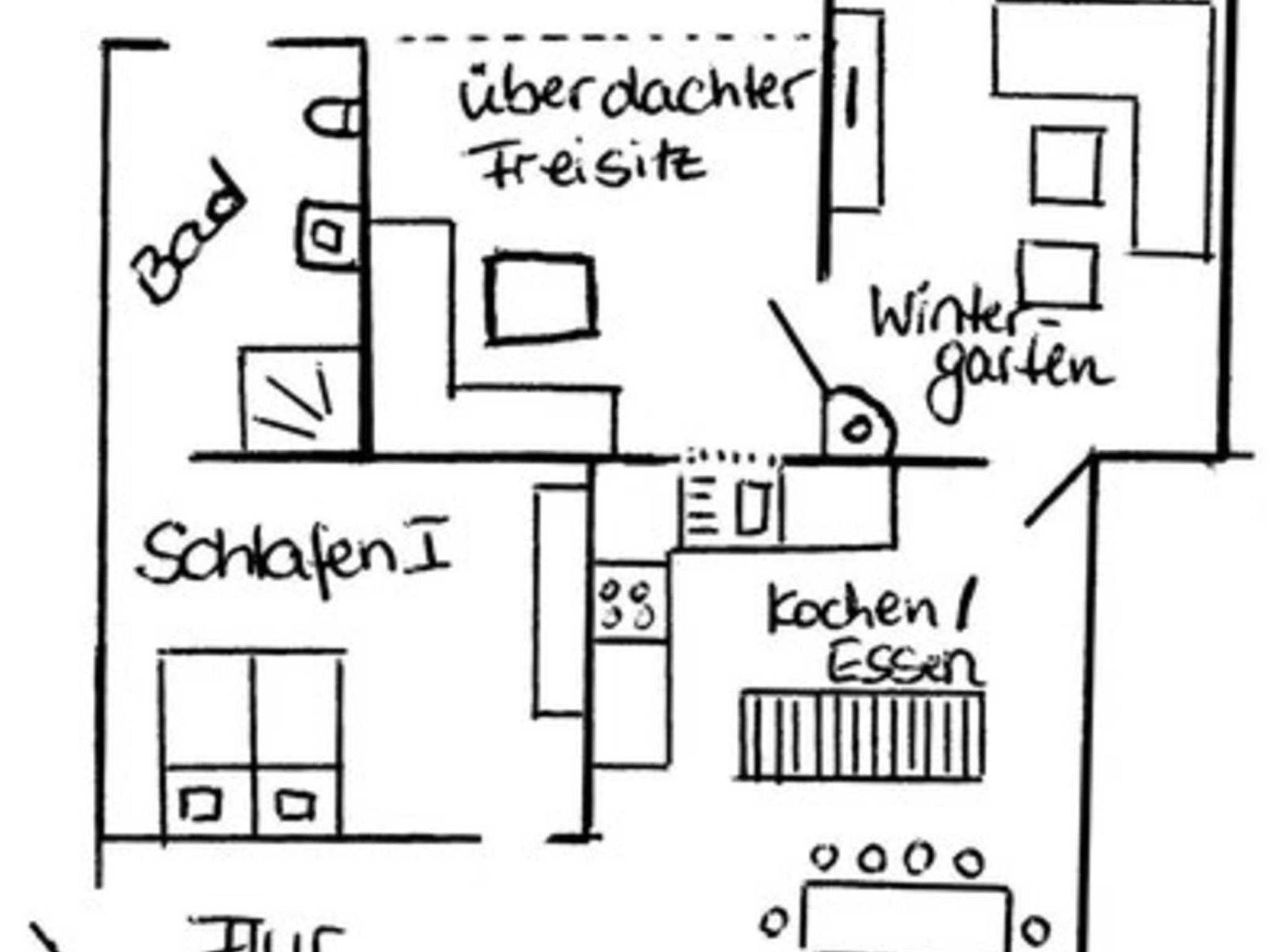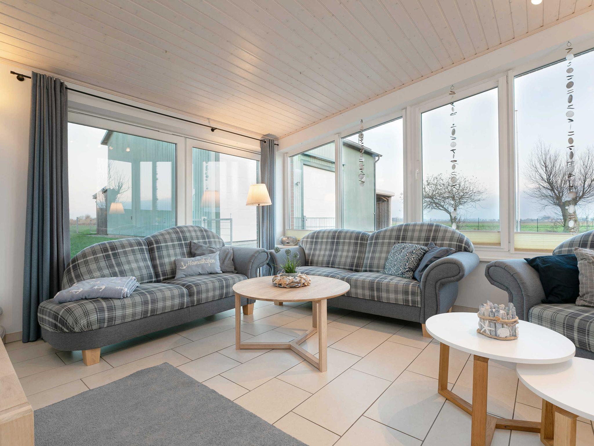 Von der Küche aus kannst Du es Dir auf blau/grau gehaltenen Polstermöbeln im Wintergarten gemütlich machen. Hier findest Du einen tollen Kaminofen,ein Flachbild TV und den direkten Zugang zum überdachten Freisitz mit einer großen Loungegarnitur. Das Erdgeschoss bietet außerdem ein barrierefreies Schlafzimmer (weiß/antik eingerichtet) mit angrenzendem ebenfalls barrierefreien modernem Duschbad.