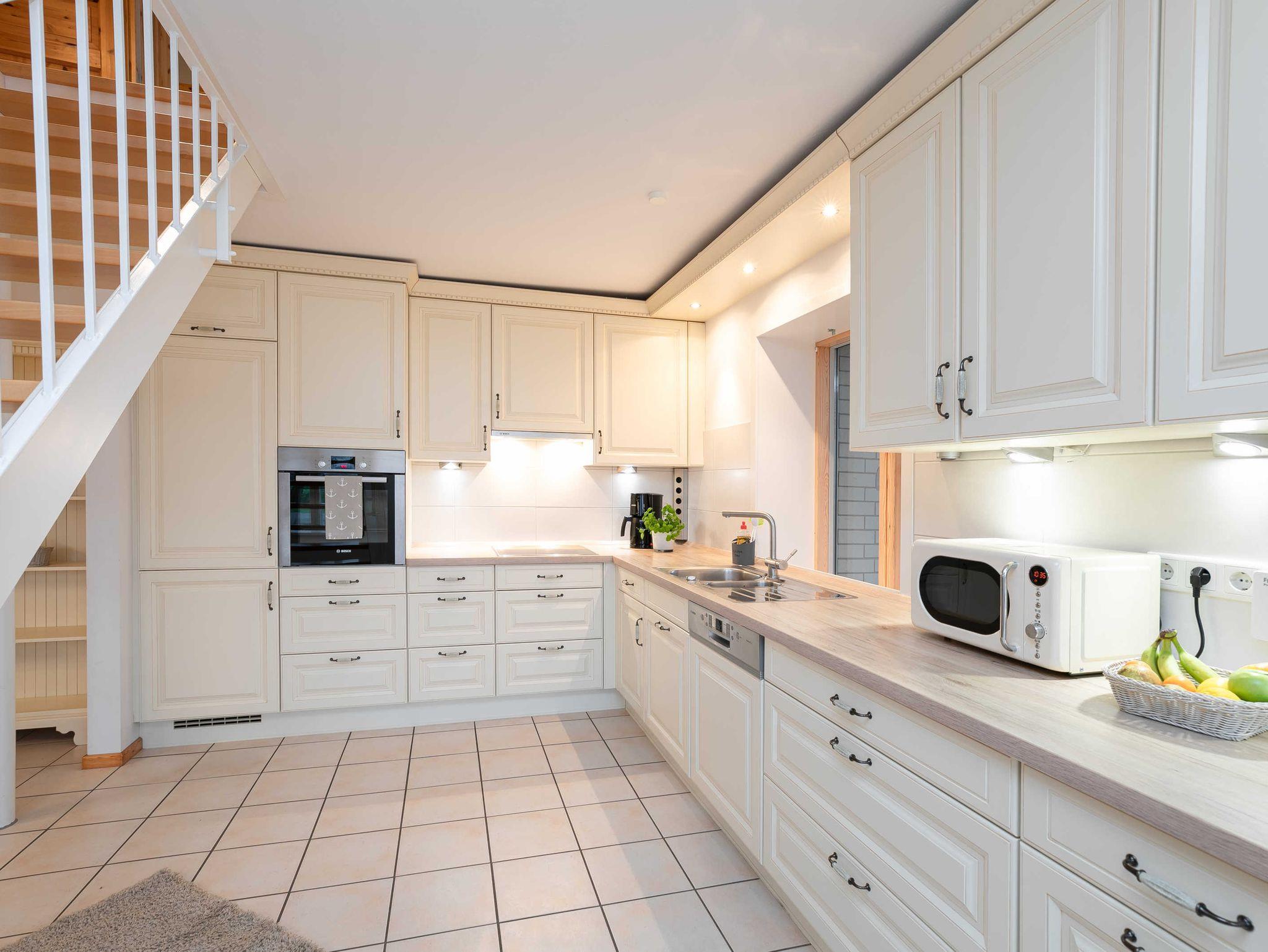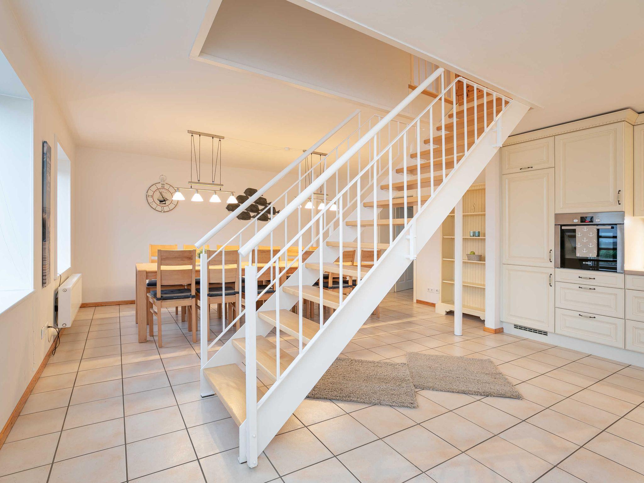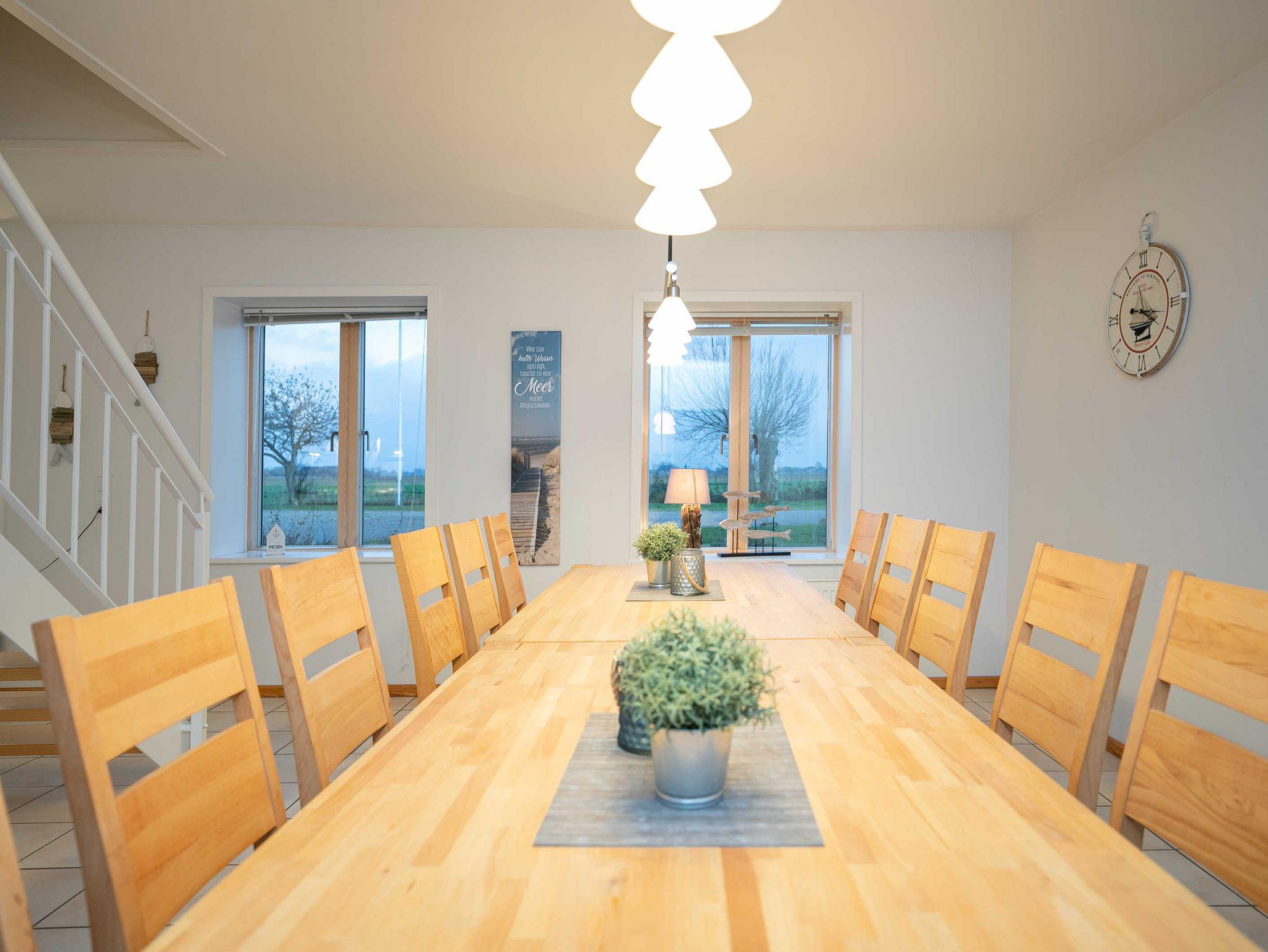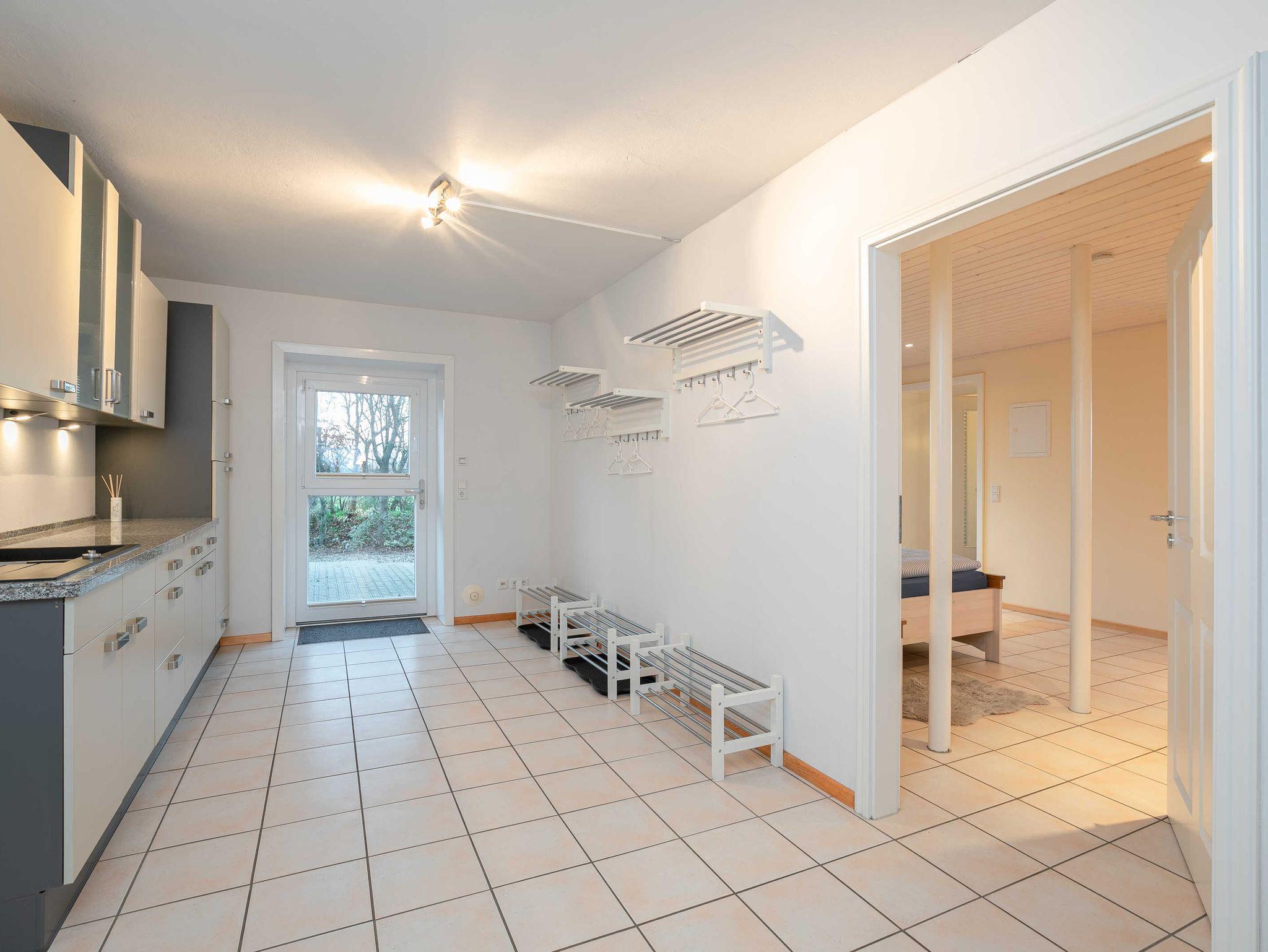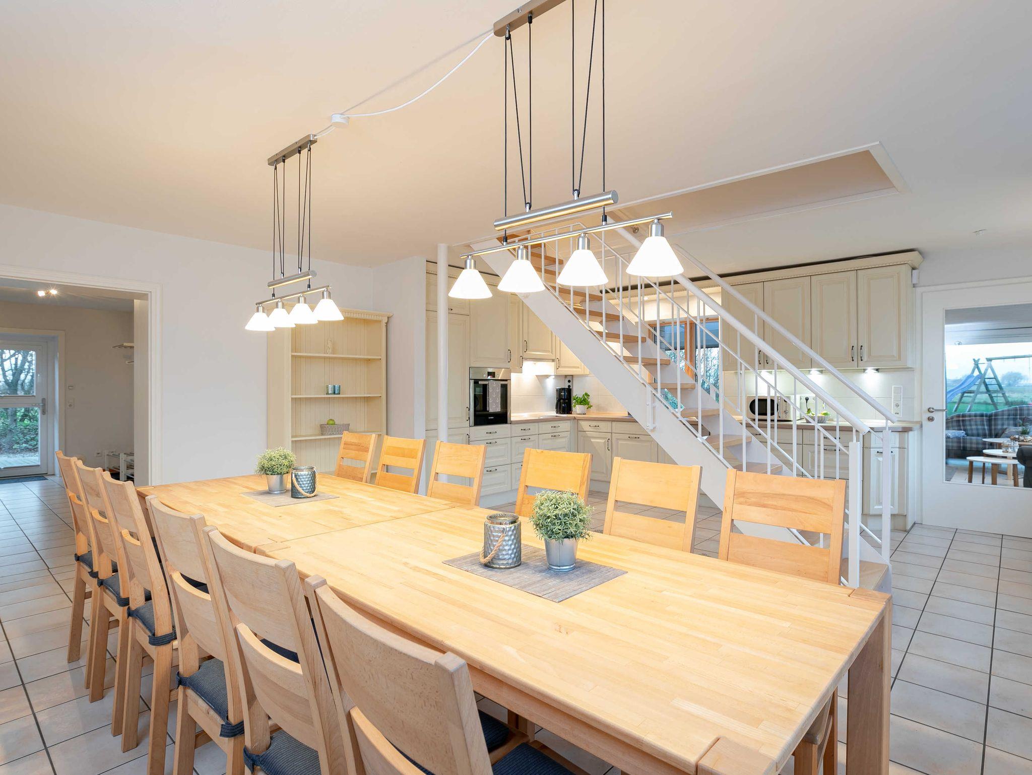 Du betrittst die Wohnung von der Westseite über den Eingangsflur/die Waschküche in die anschließend großzügige komplett ausgestattete Landhausküche, ausgestattet mit 2 massiven Esstischen und dazugehörigen Stühlen (Kernbuche) für 12 Personen.