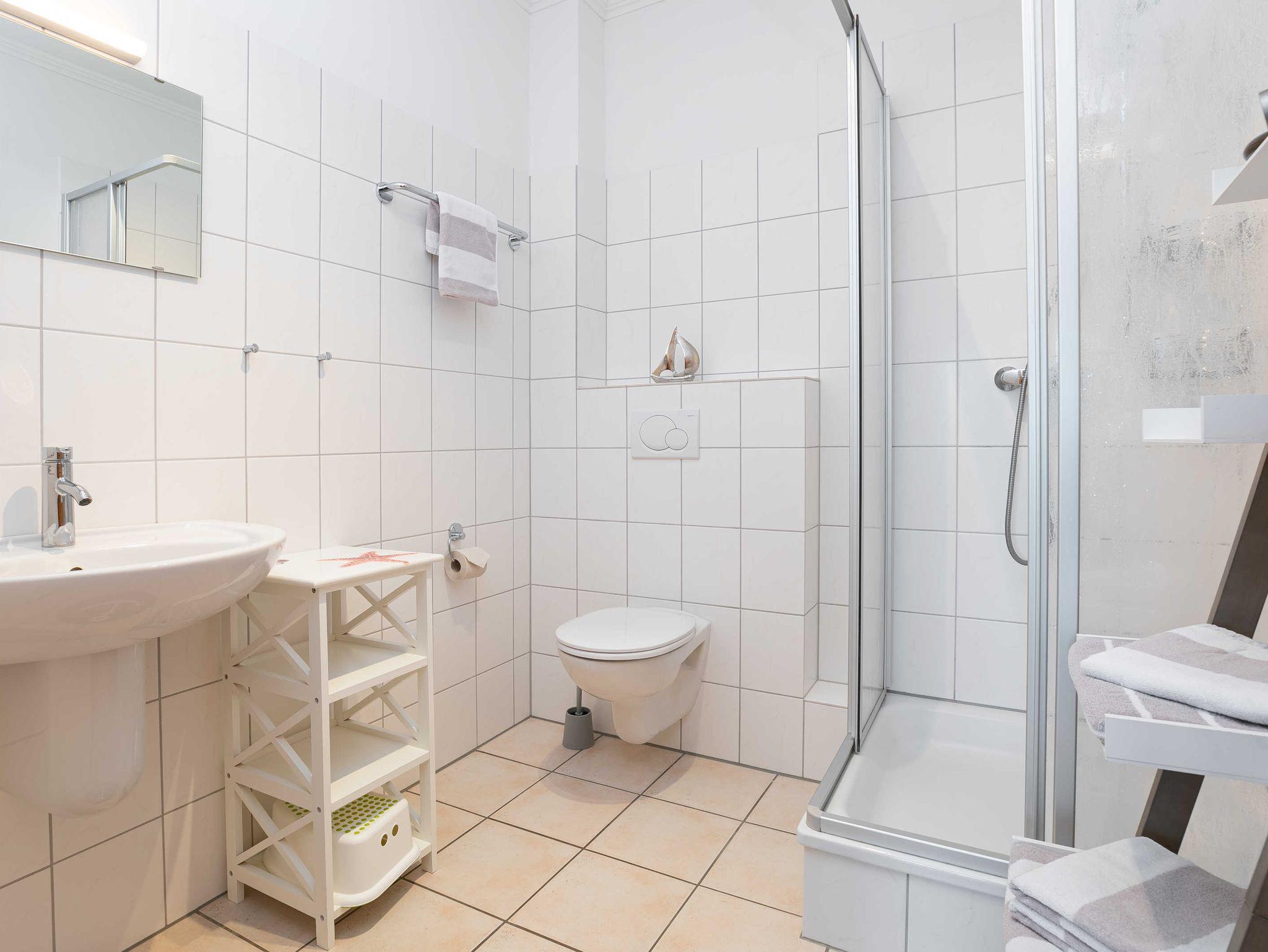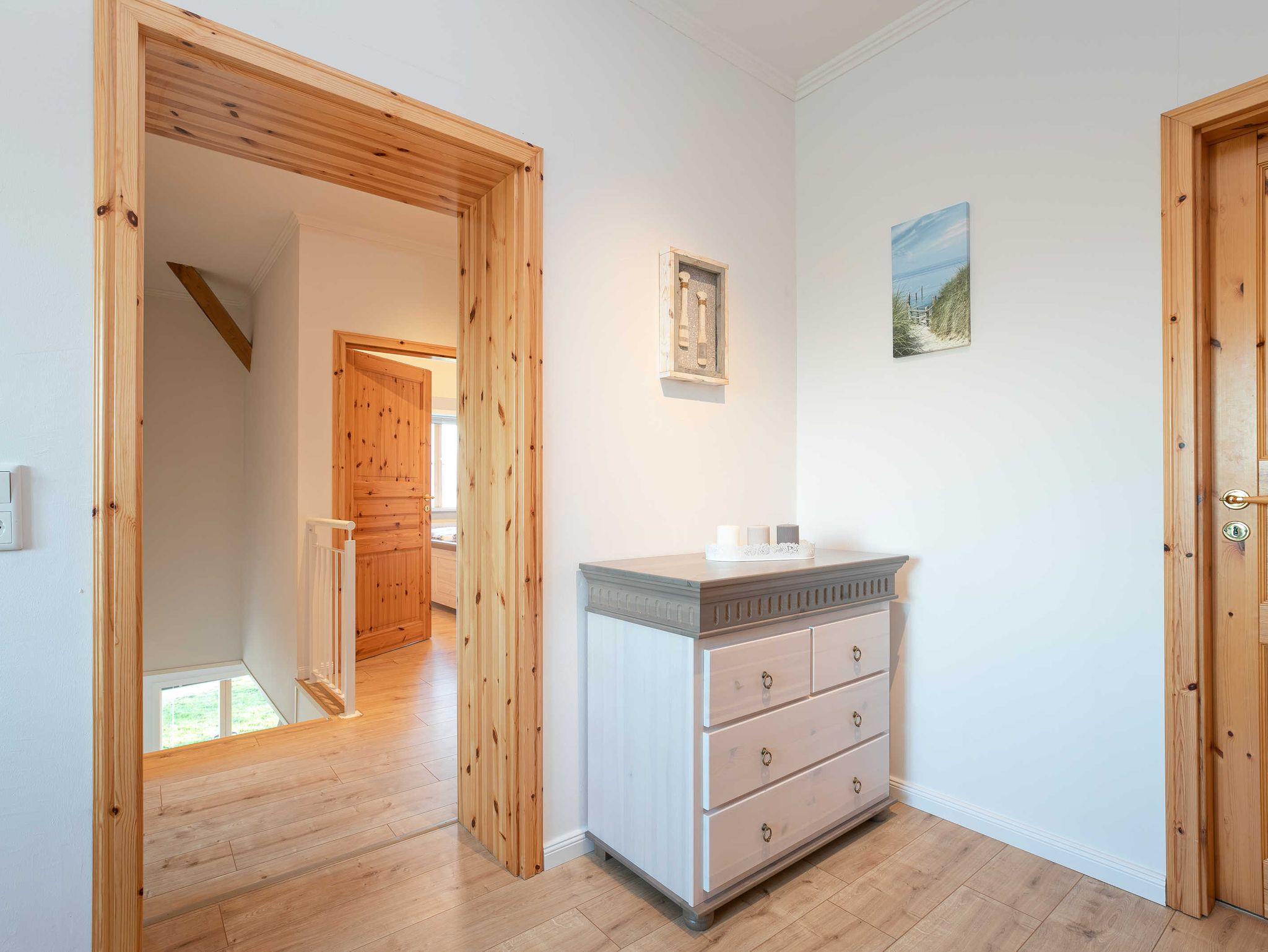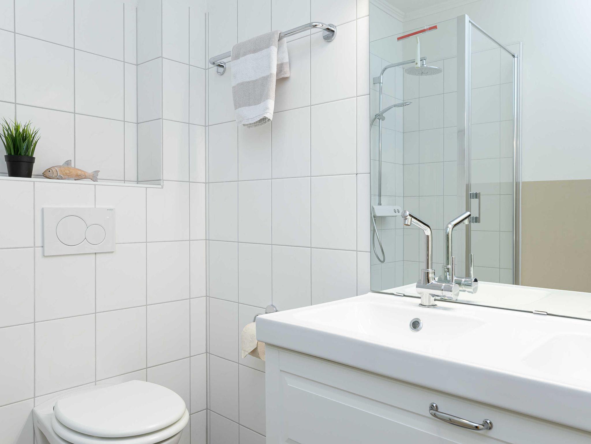 Hier ist alles im modernen Landhausstil in den Farben grau/weiß eingerichtet und mit maritimen Accessoires gestaltet.
