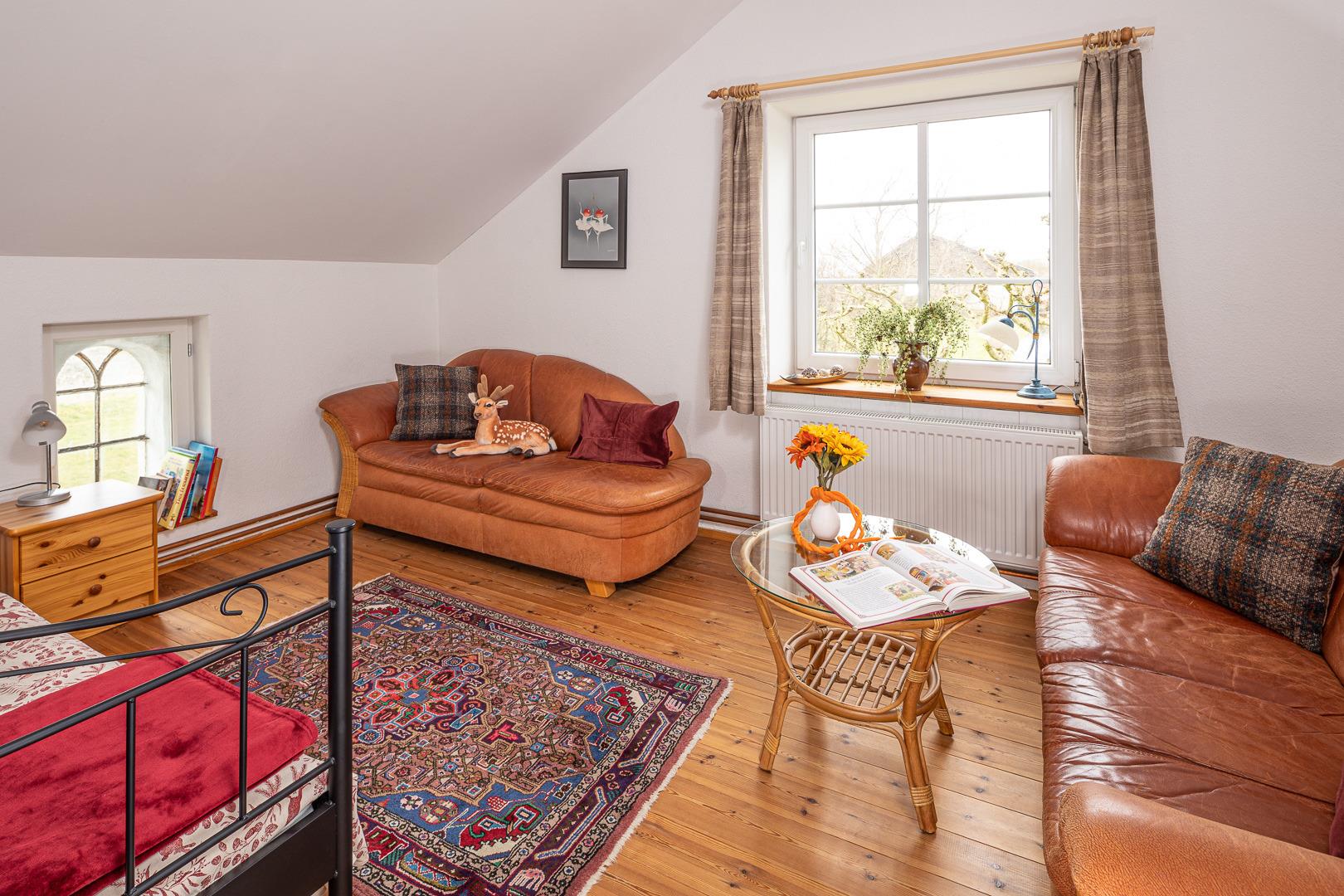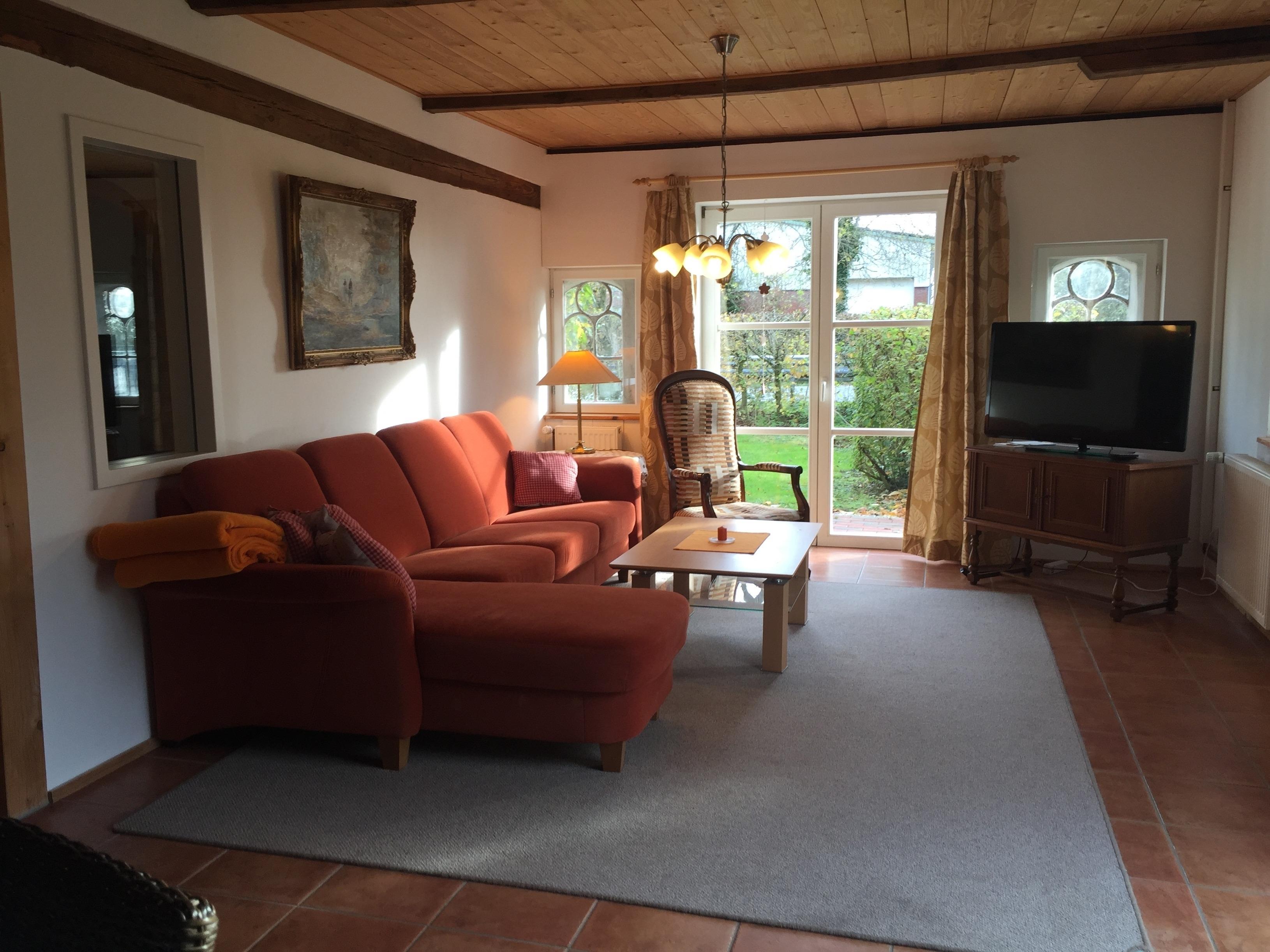 Die große Ferienwohnung ist ausgestattet für 5 Personen. Im Erdgeschoss das offene Wohnzimmer, vereint