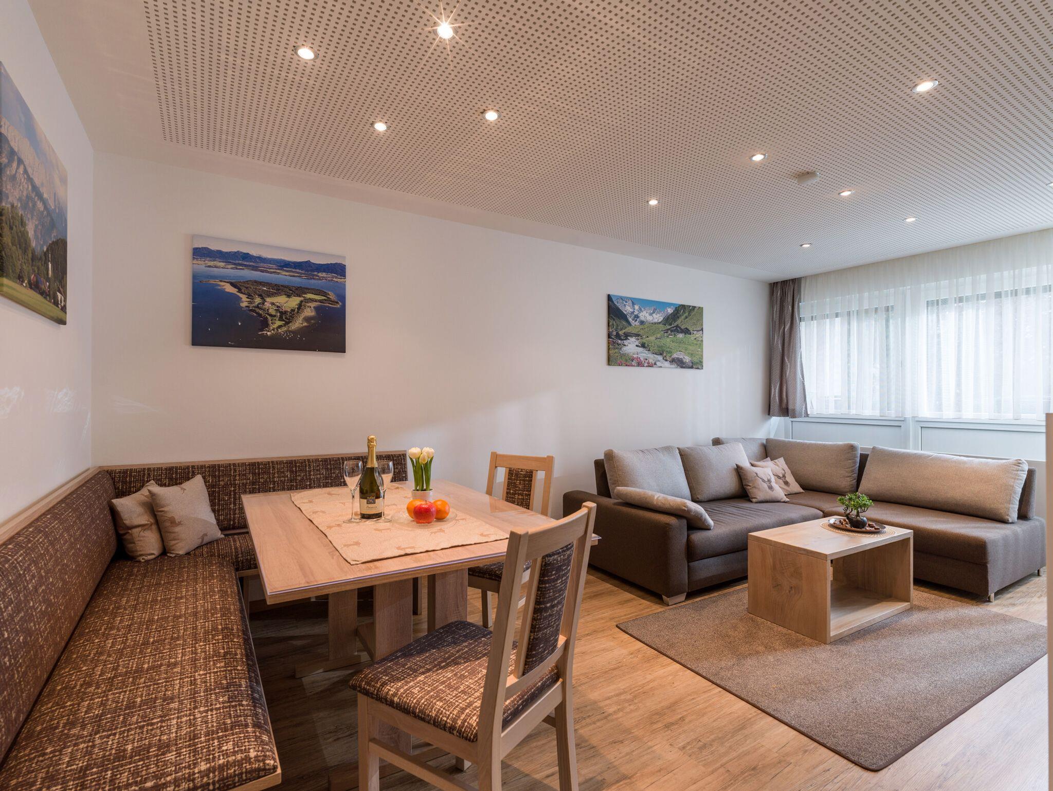 Gemütliche Zweizimmerwohnungen mit Blick nach Süden auf das Kaisergebirge (56 qm, 2 bis 4 Personen) und einer Schlafcouch. Wohnzimmer mit Eckbank und Fernseher. Schlafzimmer mit Doppelbett und Kleiderschrank. Bad mit WC und Wanne. Küche mit 4 Plattenherd, Backofen, Kühlschrank, Mikrowelle, Kaffeemaschine und Toaster. Nach einem ereignisreichen Tag lädt der Balkon zum Entspannen ein. Handtücher und Bettwäsche sind vorhanden. Zur Wohnung gehört eine Tiefgarage.