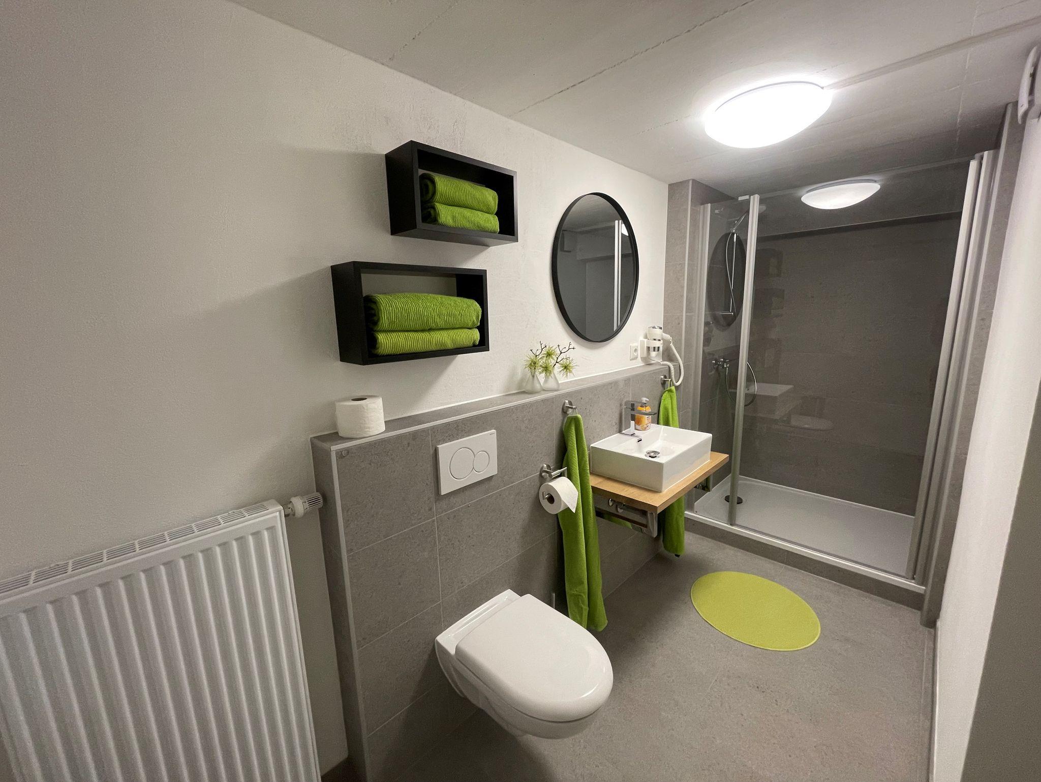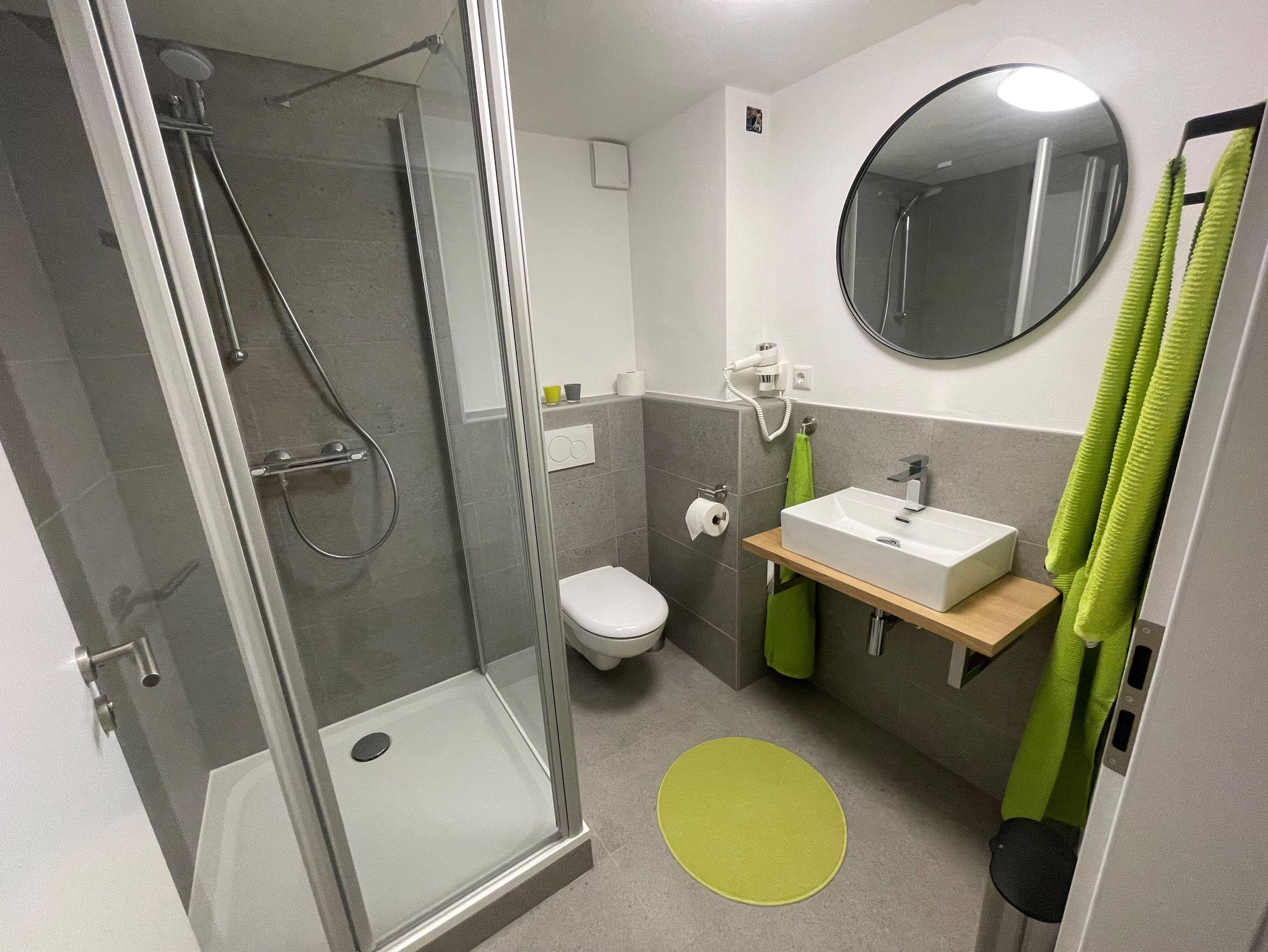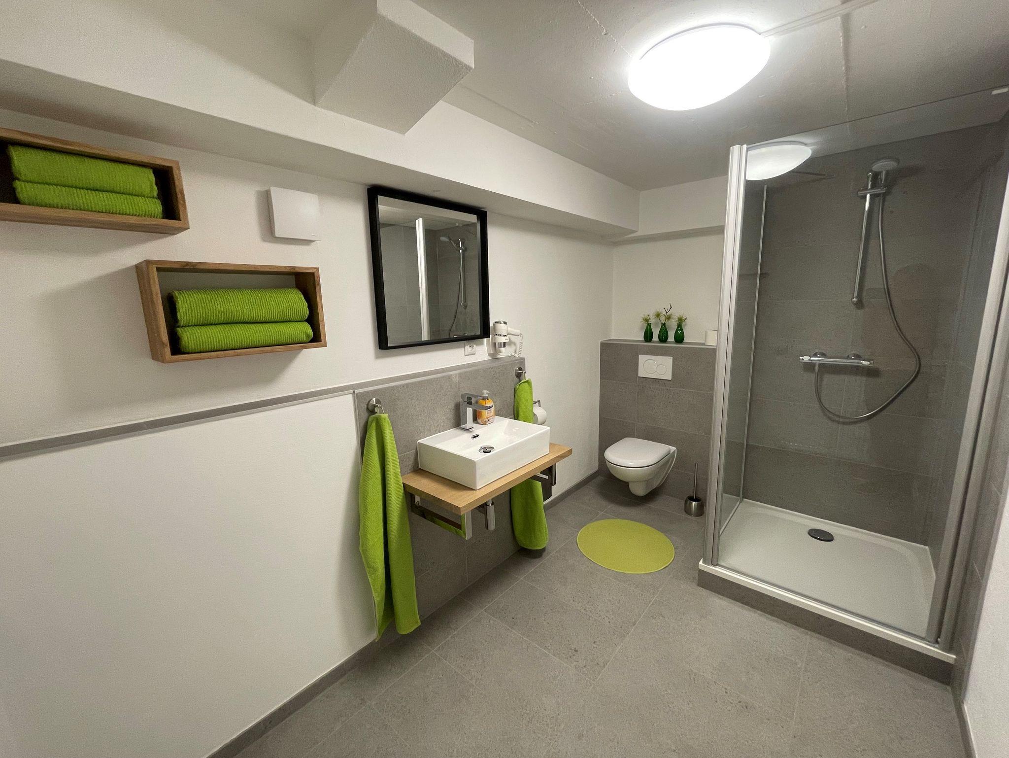 Im Kellergeschoss, das direkt über eine Treppe in der gemieteten Wohnung erreicht wird stehen 3 Duschen mit WC und ein grosses Schlafzimmer mit einem Doppelbett bereit.
