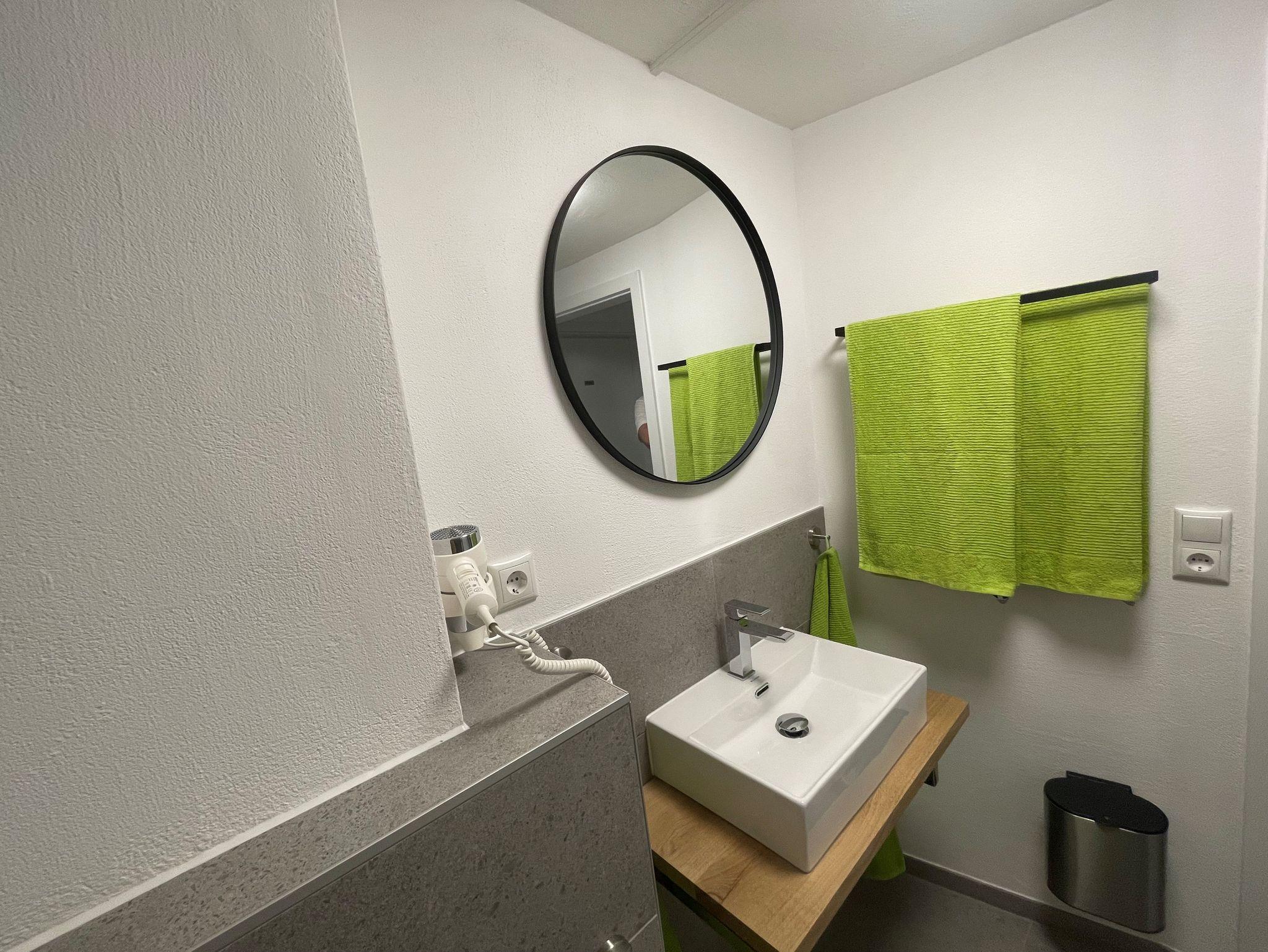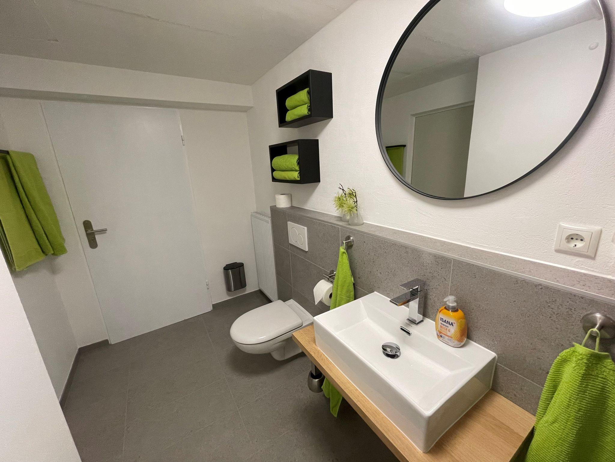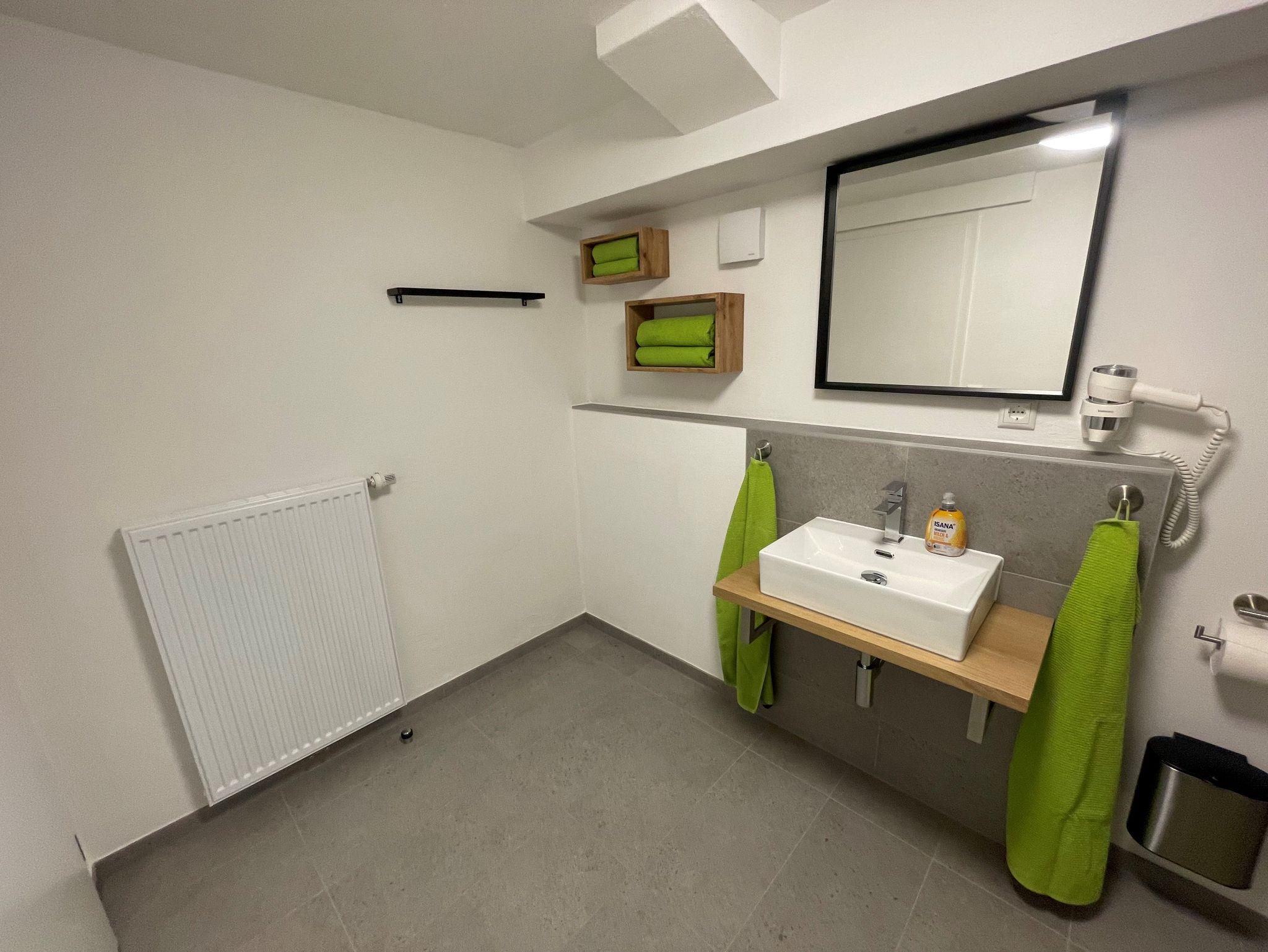 Im Kellergeschoss, das direkt über eine Treppe in der gemieteten Wohnung erreicht wird stehen 3 Duschen mit WC und ein grosses Schlafzimmer mit einem Doppelbett bereit.