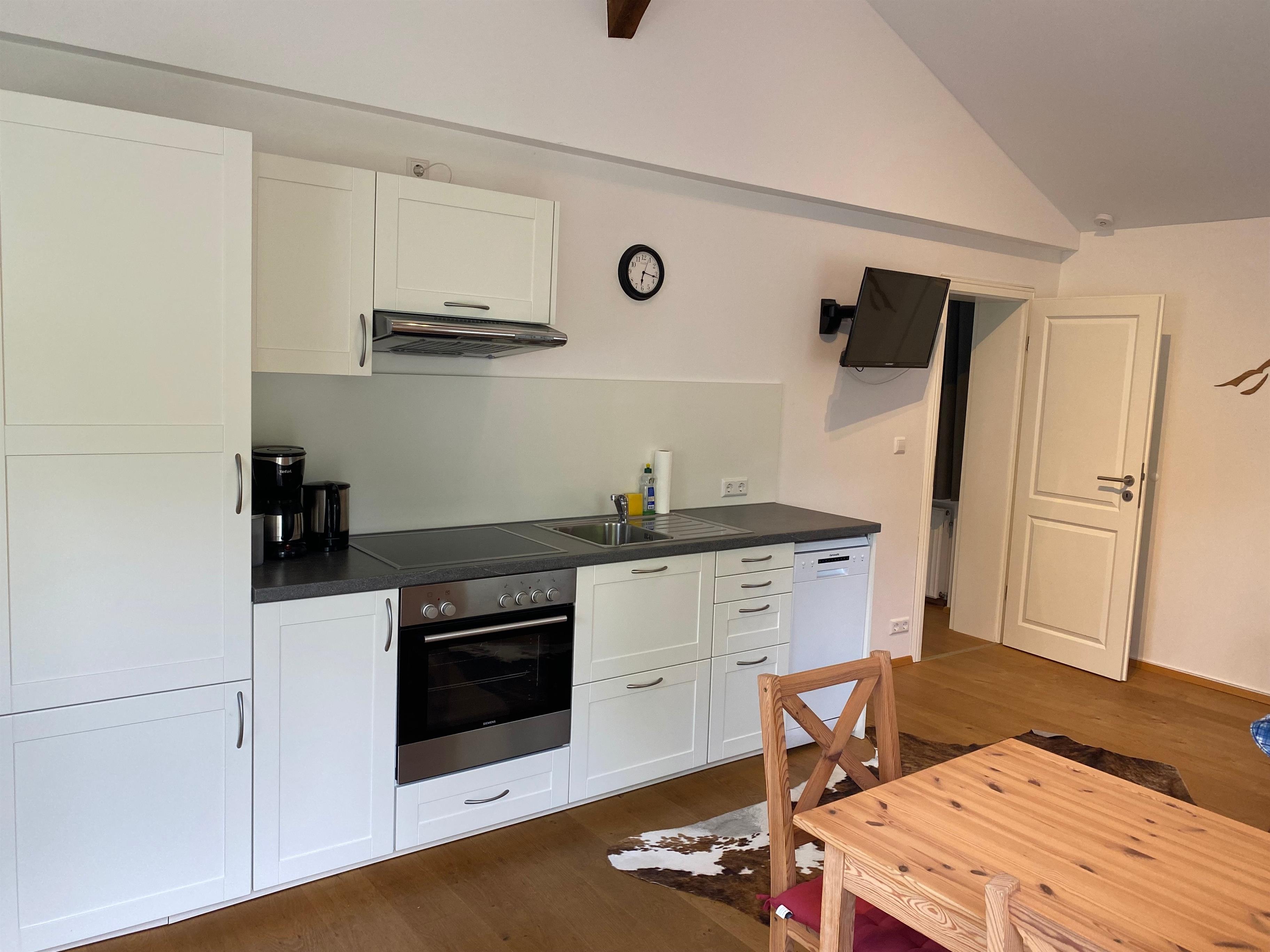 Der Balkon bietet frische Luft und Entspannung direkt an der Ferienwohnung. Im Urlaub kochen? Los geht's, die Küche ist gut ausgestattet, inkl. einer Spülmaschine.