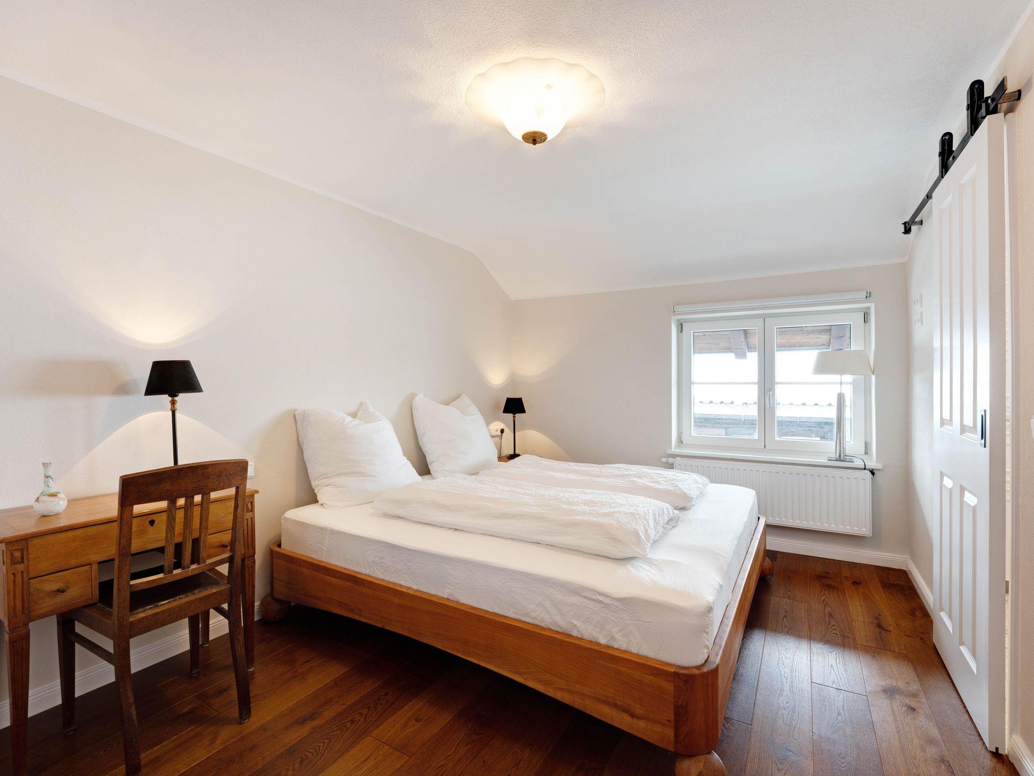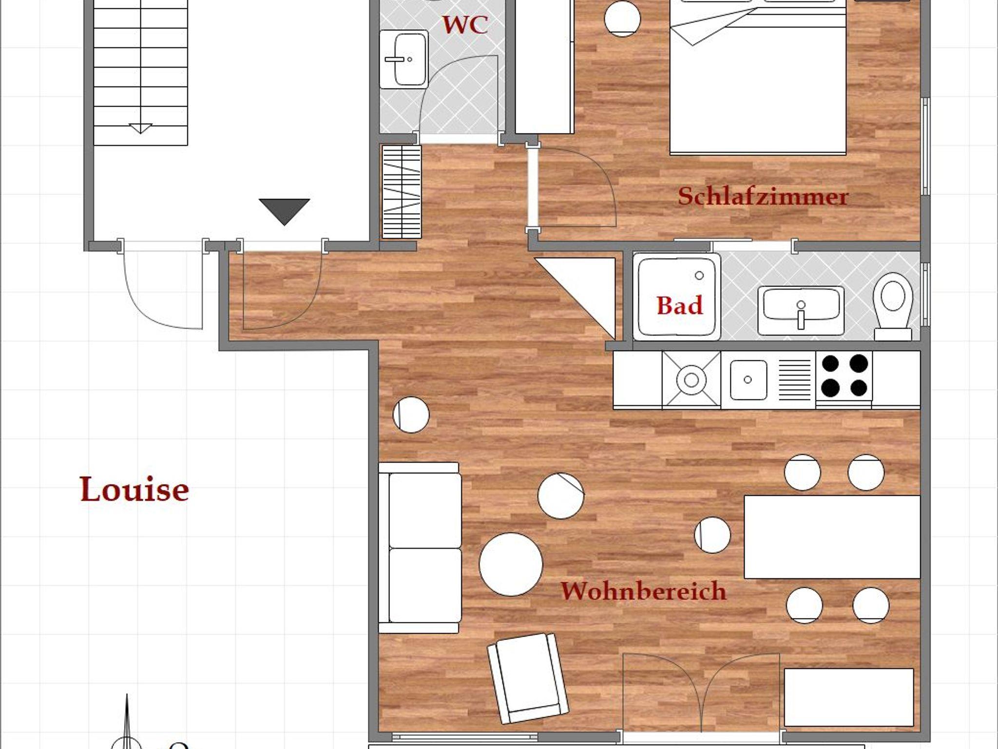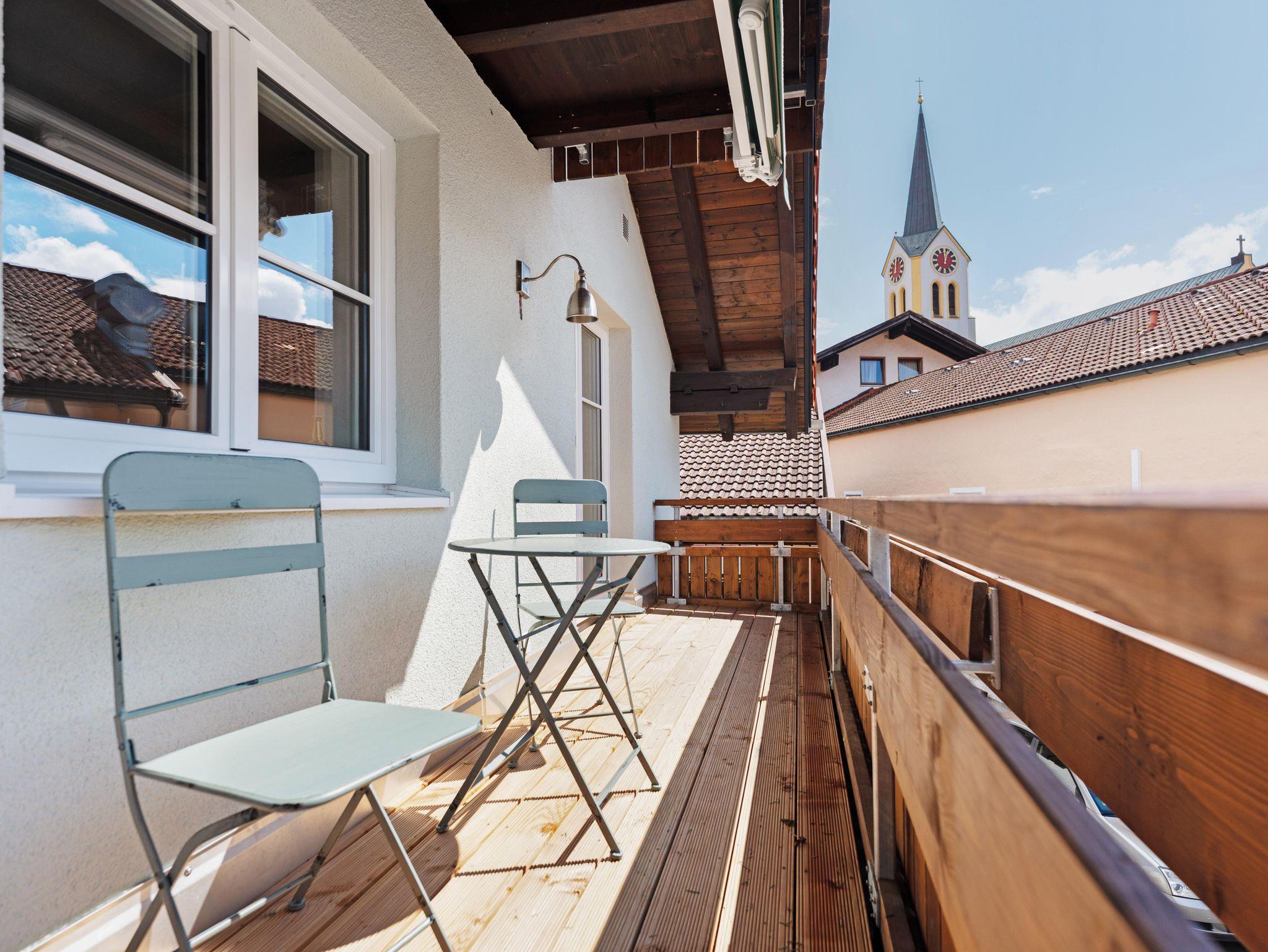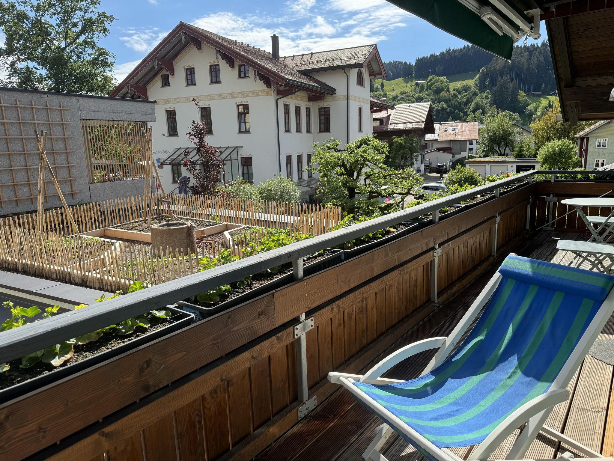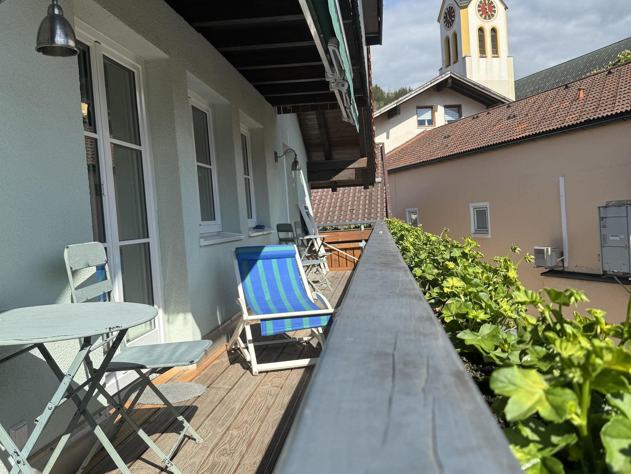 Sowohl der Wohnbereich als auch das Schlafzimmer mit Doppelbett (1,80 x 2,00 m) sind auf den sonnigen Südbalkon ausgerichtet. Von dort haben Sie das Geschehen in der Ortsmitte mit Rathaus, Haus des Gastes und Kirche im Blick.