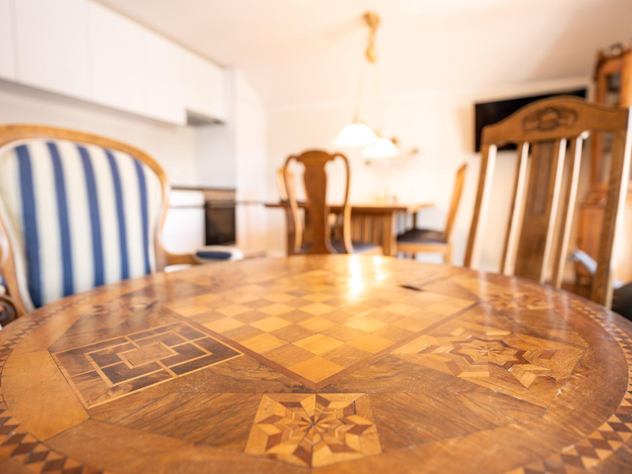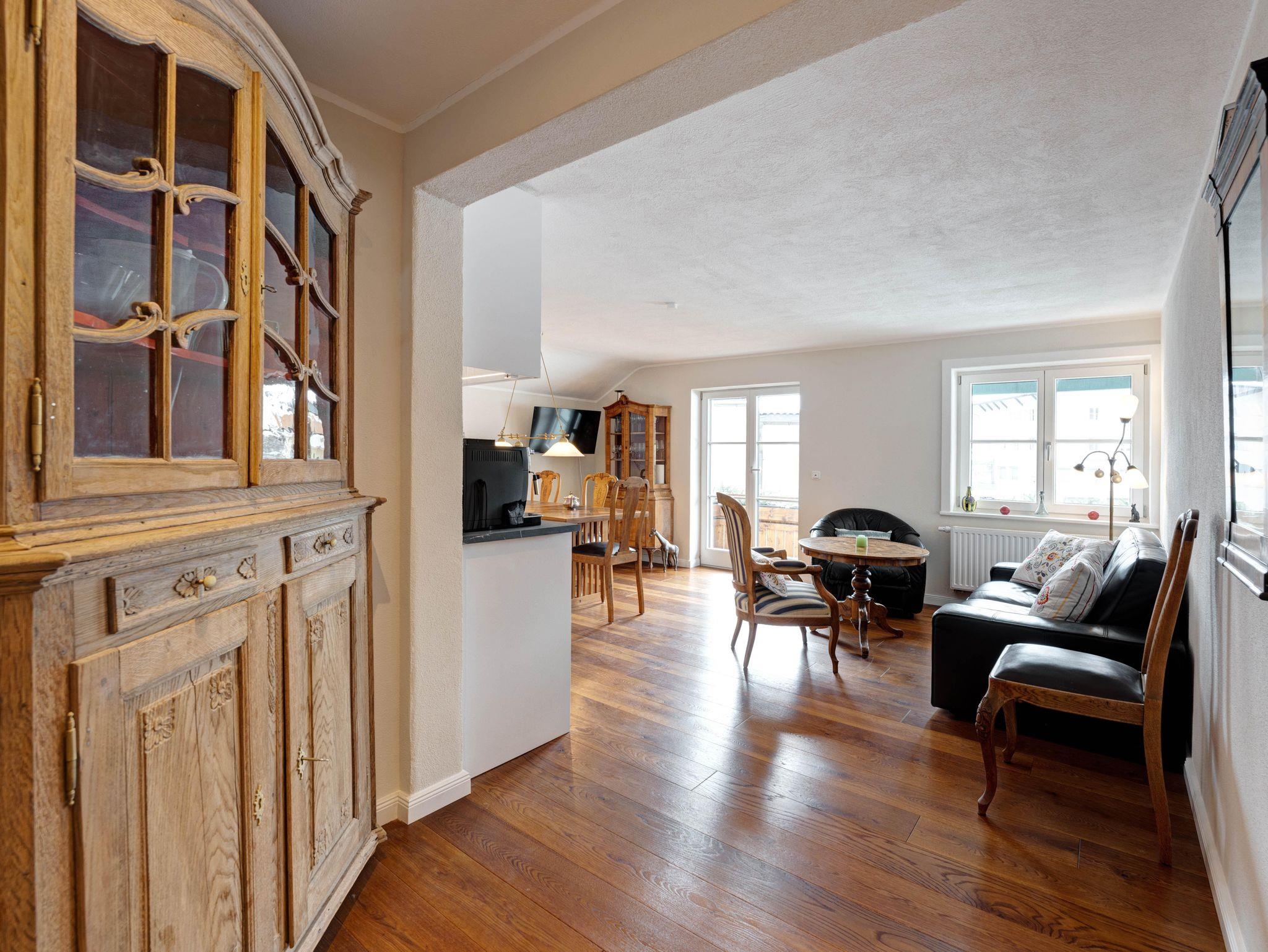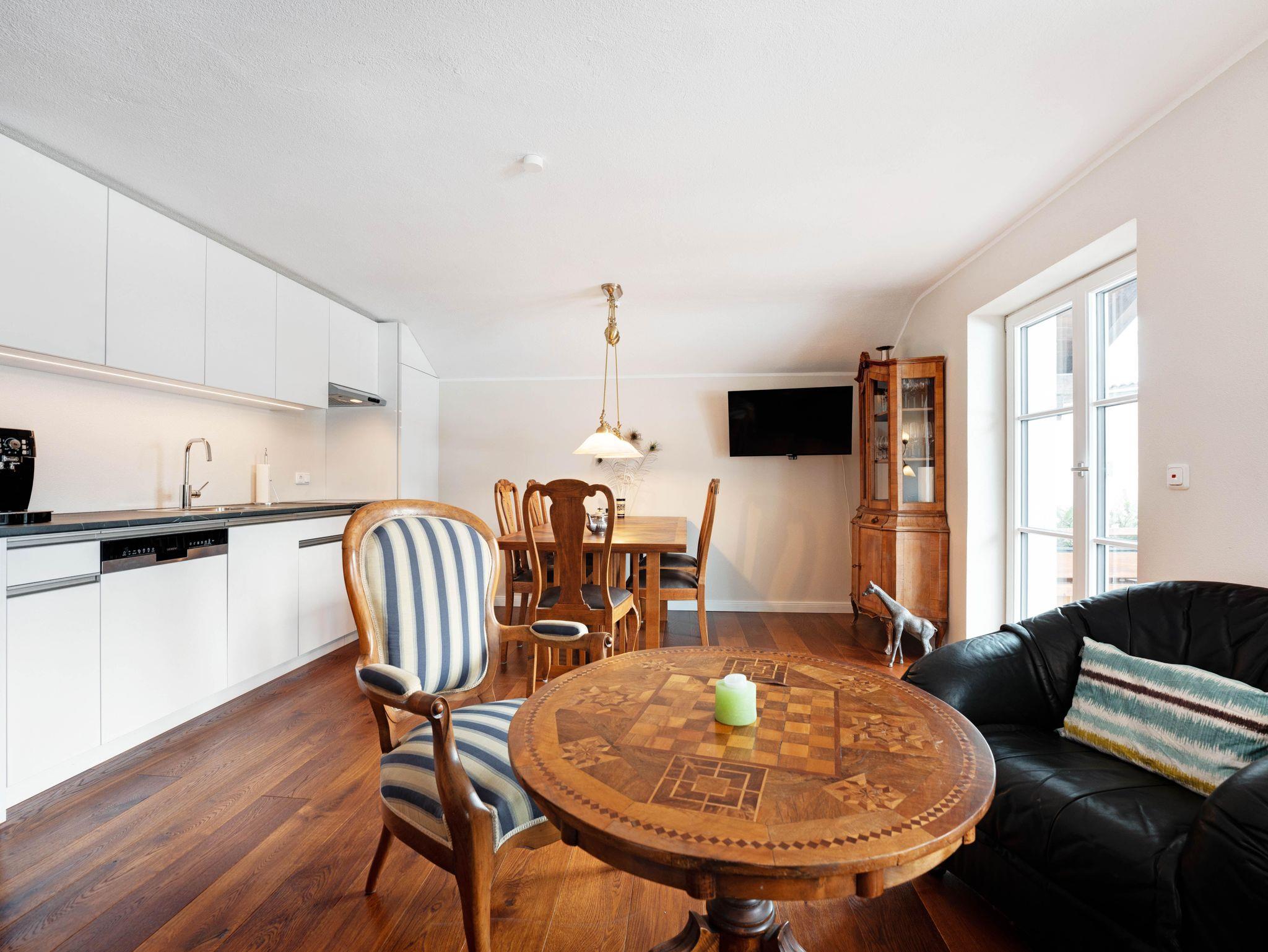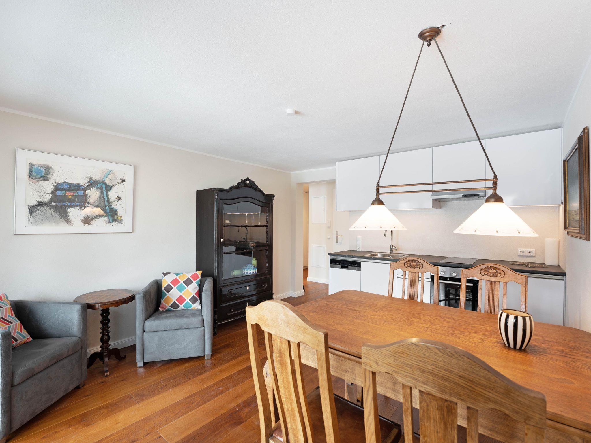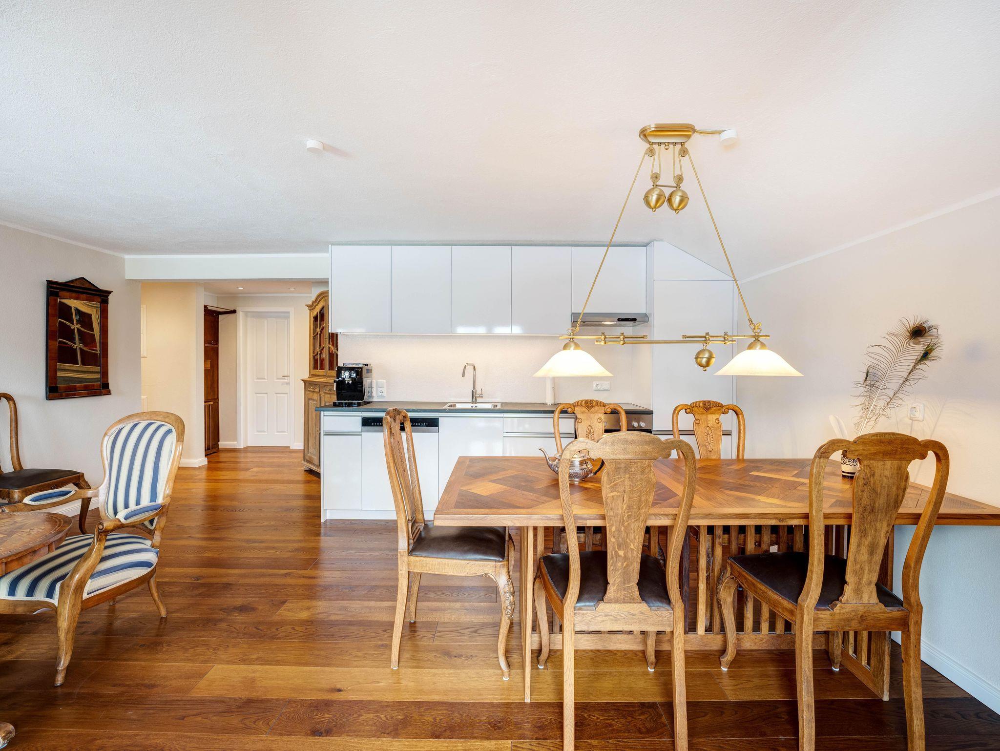 Unser geräumiges 2-Zimmer-Appartement Louise (47 m2) bietet großzügig Platz für bis zu zwei Personen. Die Räume bestechen durch eine warme Atmosphäre, erzeugt durch gepflegtes Parkett und Massivholzmobiliar. Wenn Sie es sich im Wohnbereich auf den gepolsterten Stühlen im Stil des französischen Barock bequem machen, dürfen Sie sich ein bisschen wie ein König oder eine Königin fühlen und sich im Laissez-faire und Savoir-vivre üben. Echte Blickfänge sind der Schrank im Eingangsbereich sowie der antike Spieltisch in der Sitzecke mit Ledergarnitur. Dort und am großen Esstisch können Sie auch in größerer Runde zusammensitzen. Die moderne, voll ausgestattete weiß lackierte Küchenzeile bietet einen stimmigen, leichten Kontrast.