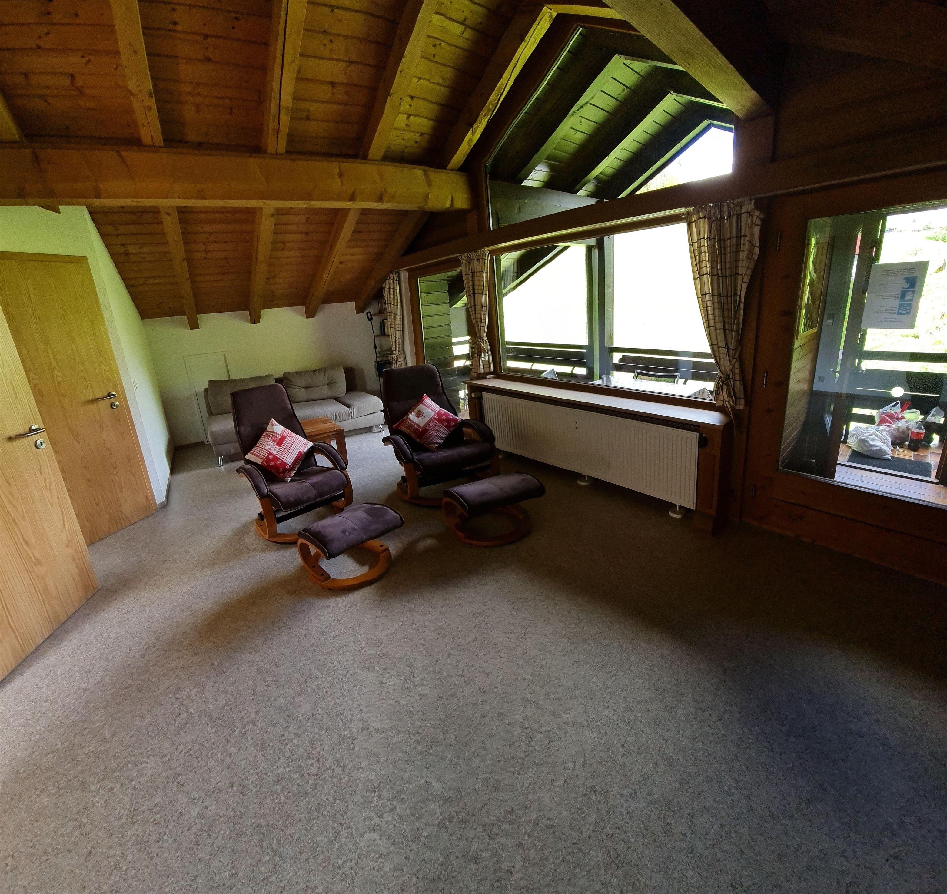 Gemütlich und rustikal eingerichtete Ferienwohnung für 2 bis 6 Personen im Dachgeschoß. 1 Wohnzimmer mit großem Ostbalkon und Panoramafenster mit Blick auf den Waldrand.