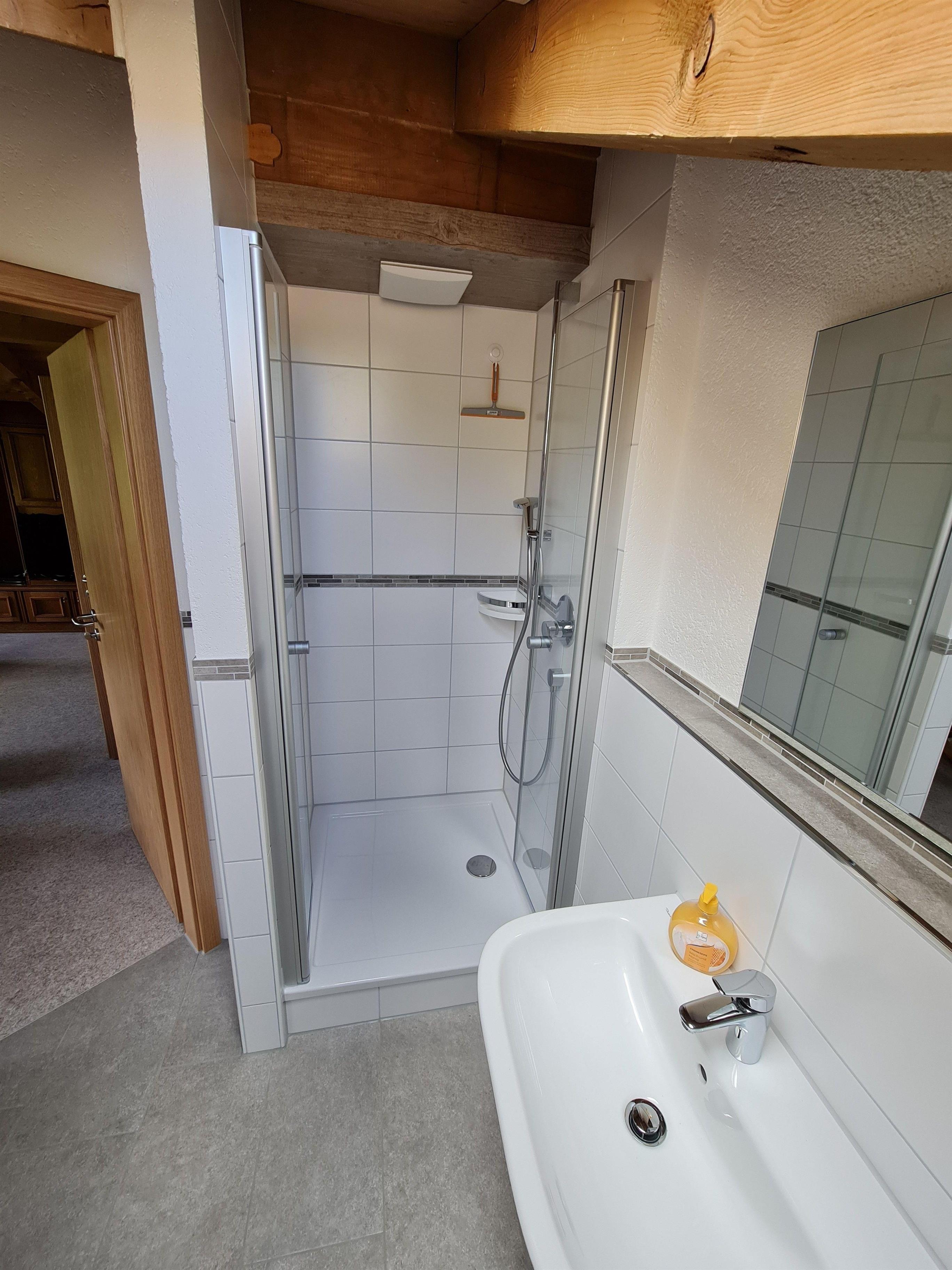 Ein Badezimmer mit Dachschräge ist mit einem Vollbad, Waschbecken und WC versehen. Das 2. Badezimmer ist mit Dusche, Waschbecken und WC.