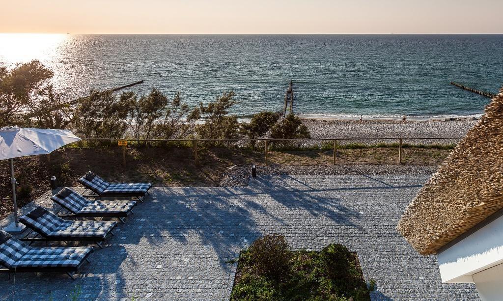 Der Außenbereich begeistert mit einem spektakulären Blick von der Steilküste auf die Ostsee. Dank der Terrasse mit hochwertiger Bestuhlung, Sonnenschirm und Sonnenliegen kannst du bei Wellenrauschen deinen Urlaub mit allen Sinnen genießen. Hier steht einem Frühstück am Meer, entspannten Stunden und einem traumhaften Abendausklang mit den für die Halbinsel so berühmten Sonnenuntergängen nichts mehr im Wege. Dir stehen zwei PKW-Stelllätze zur Verfügung.