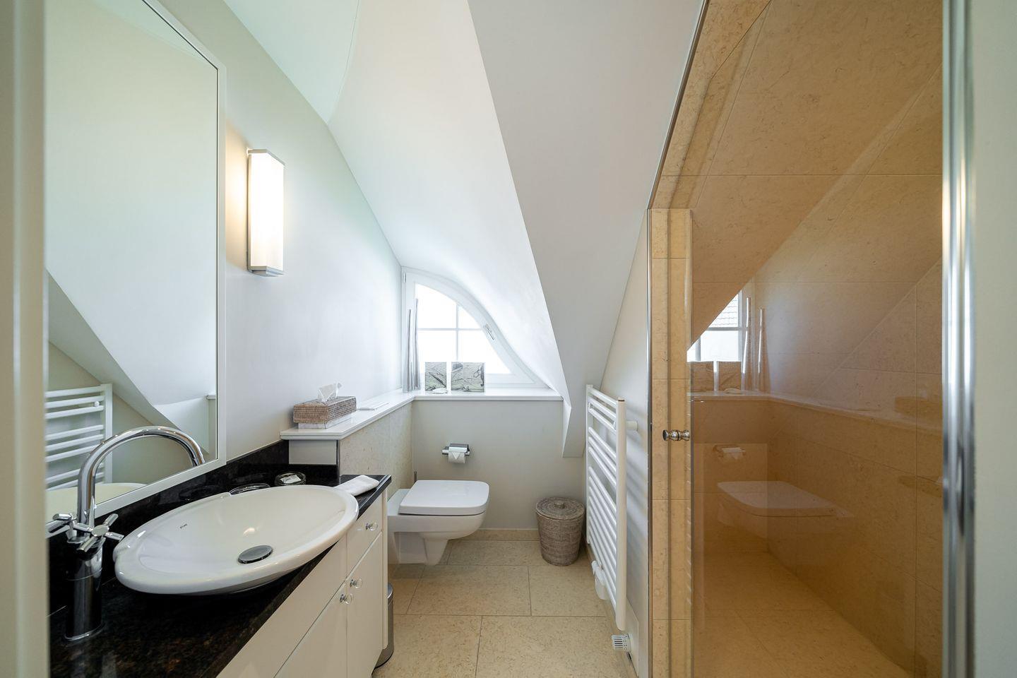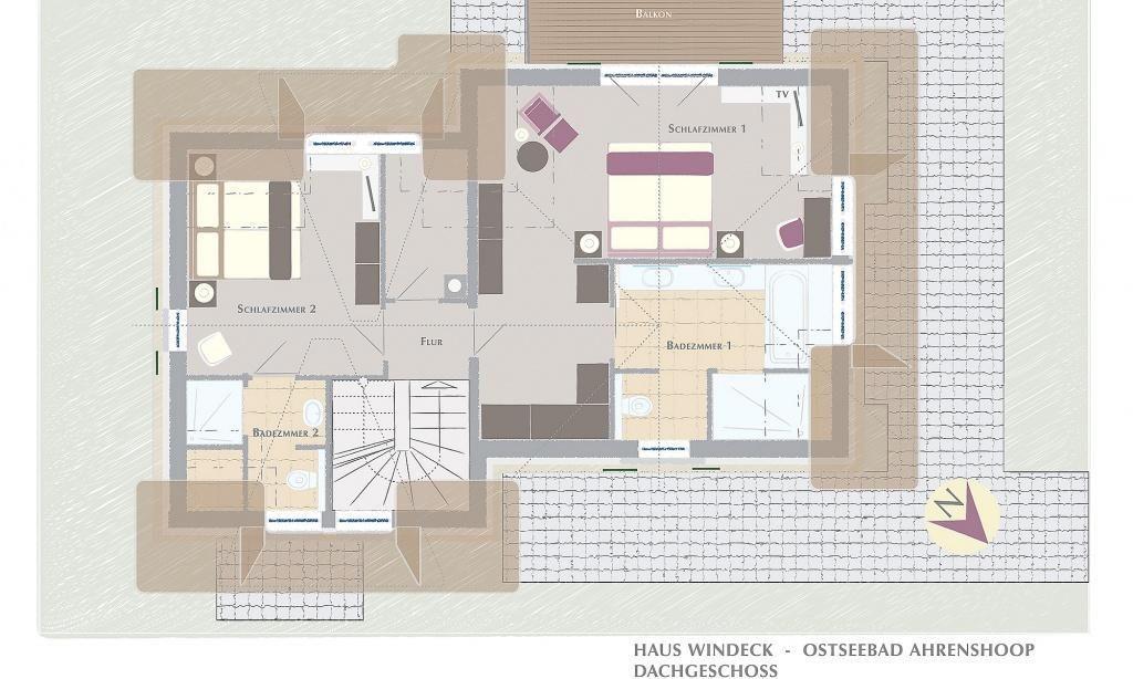Tritt ein - in den Sonnenlicht durchfluteten Wohnraum, der über eine gemütliche Sitzecke am Kamin und einem einladenden Essbereich verfügt. Bereits vom Wohnraum aus genießt du den traumhaften Blick zur Ostsee. Die separate Küche bietet neben der hochwertigen Einbauküche auch einen kleinen Esstisch. Das Gäste-WC und ein Hauswirtschaftsraum befinden sich ebenfalls im Erdgeschoss. Über eine imposante Treppe gelangst du ins Dachgeschoss. Hier angekommen erwartet dich das seeseitig liegende Schlafzimmer mit Doppelbett, TV und einem Sekretär mit tollem Ausblick. Eine eigene Ankleide, ein luxuriöses Bad mit Doppelwaschtisch/ Badewanne/Wellnessdusche/WC sowie ein Balkon sorgen für weiteren Wohnkomfort. Das zweite Schlafzimmer verfügt ebenfalls über ein Doppelbett und einen TV. Das angrenzende Badezimmer ist mit einer Wellnessdusche ausgestattet.