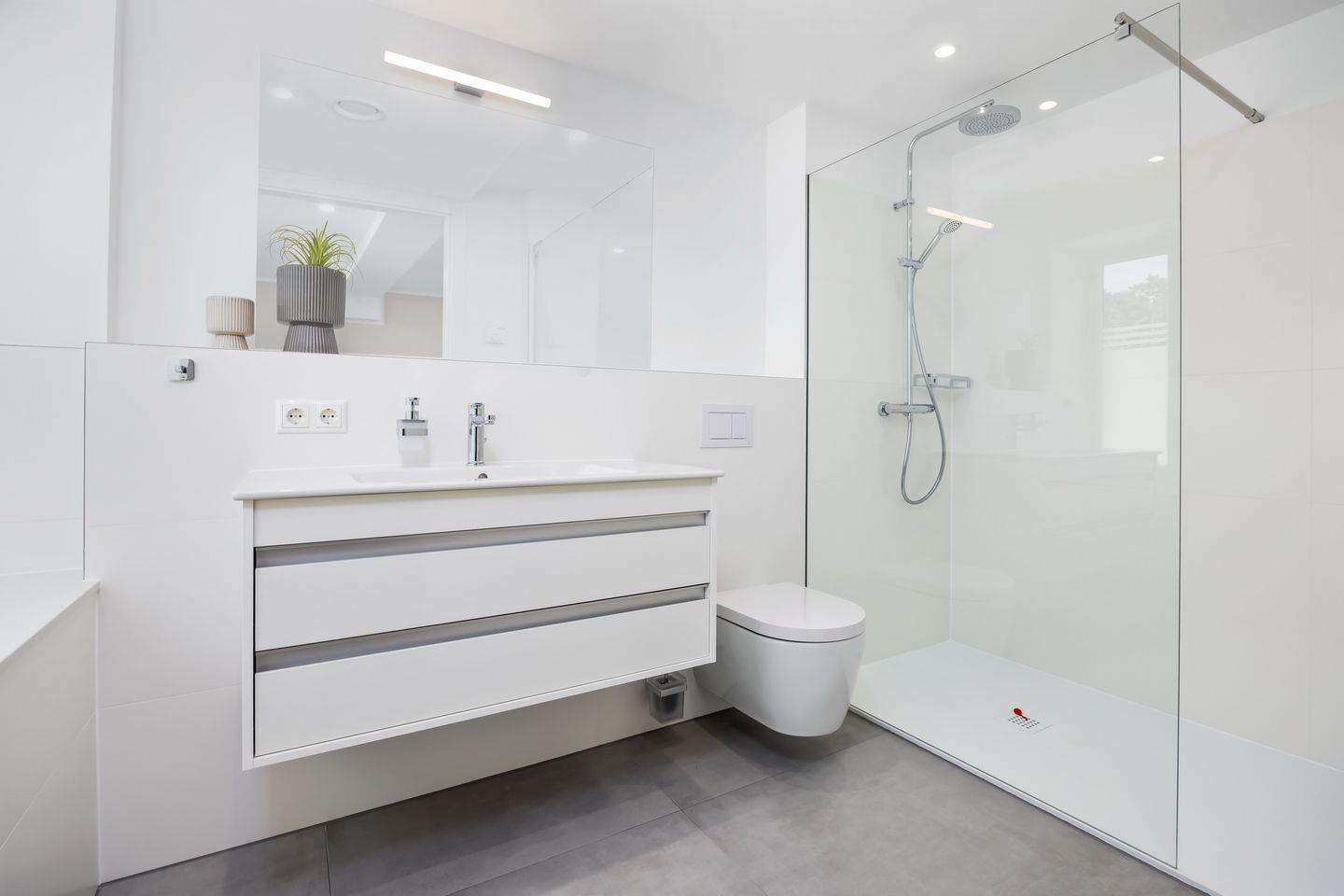 Beide Badezimmer verfügen über Fußbodenheizung, Handtuchwärmer, eine ebenerdige Regendusche, WC, Waschtisch, Föhn und Fenster. Das Apartment verfügt überdies über ein weiteres, separates WC.