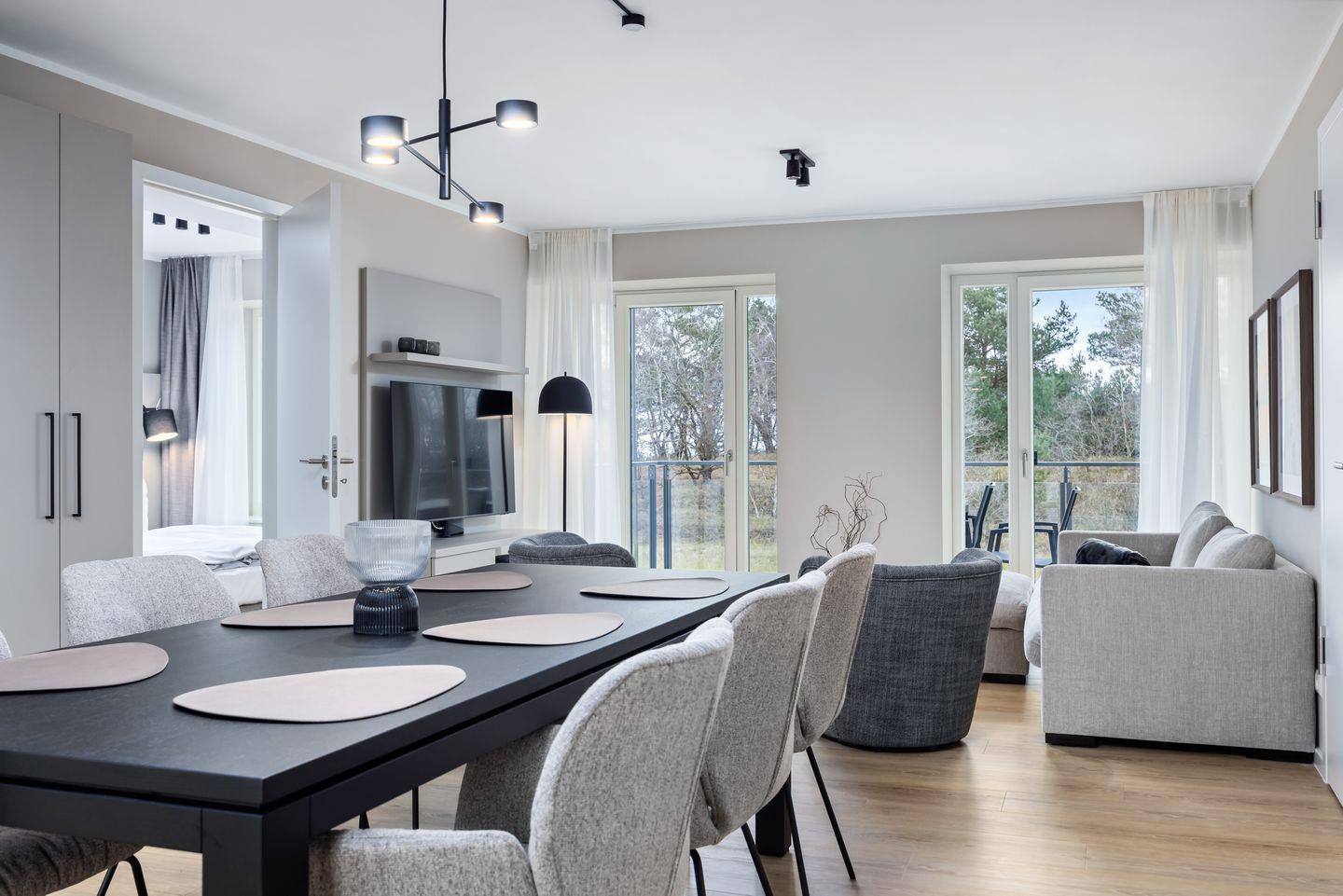 Das geschmackvoll eingerichtete Nichtraucher-Apartment verfügt über Fußbodenheizung, z.T. bodentiefe Fenster, kostenfreies WLAN und eine voll ausgestattete offene Küche mit Geschirrspüler, Kühlschrank mit Gefrierfach, Filterkaffeemaschine, Mixer, Toaster, Wasserkocher, Mikrowelle mit Backofenfunktion und 4-Felder Induktionsherd von BORA sowie über einen behaglichen und großzügigen Wohn-Essbereich. Im Wohnbereich befindet sich ein großer SMART-TV (55 Zoll).