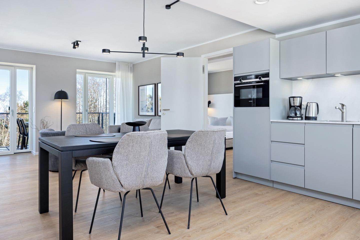 Das geschmackvoll eingerichtete Nichtraucher-Apartment verfügt über Fußbodenheizung, z.T. bodentiefe Fenster, kostenfreies WLAN und eine voll ausgestattete offene Küche mit Geschirrspüler, Kühlschrank mit Gefrierfach, Filterkaffeemaschine, Mixer, Toaster, Wasserkocher, Mikrowelle mit Backofenfunktion und 4-Felder Induktionsherd von BORA sowie über einen behaglichen und großzügigen Wohn-Essbereich. Im Wohnbereich befindet sich ein großer SMART-TV (55 Zoll).