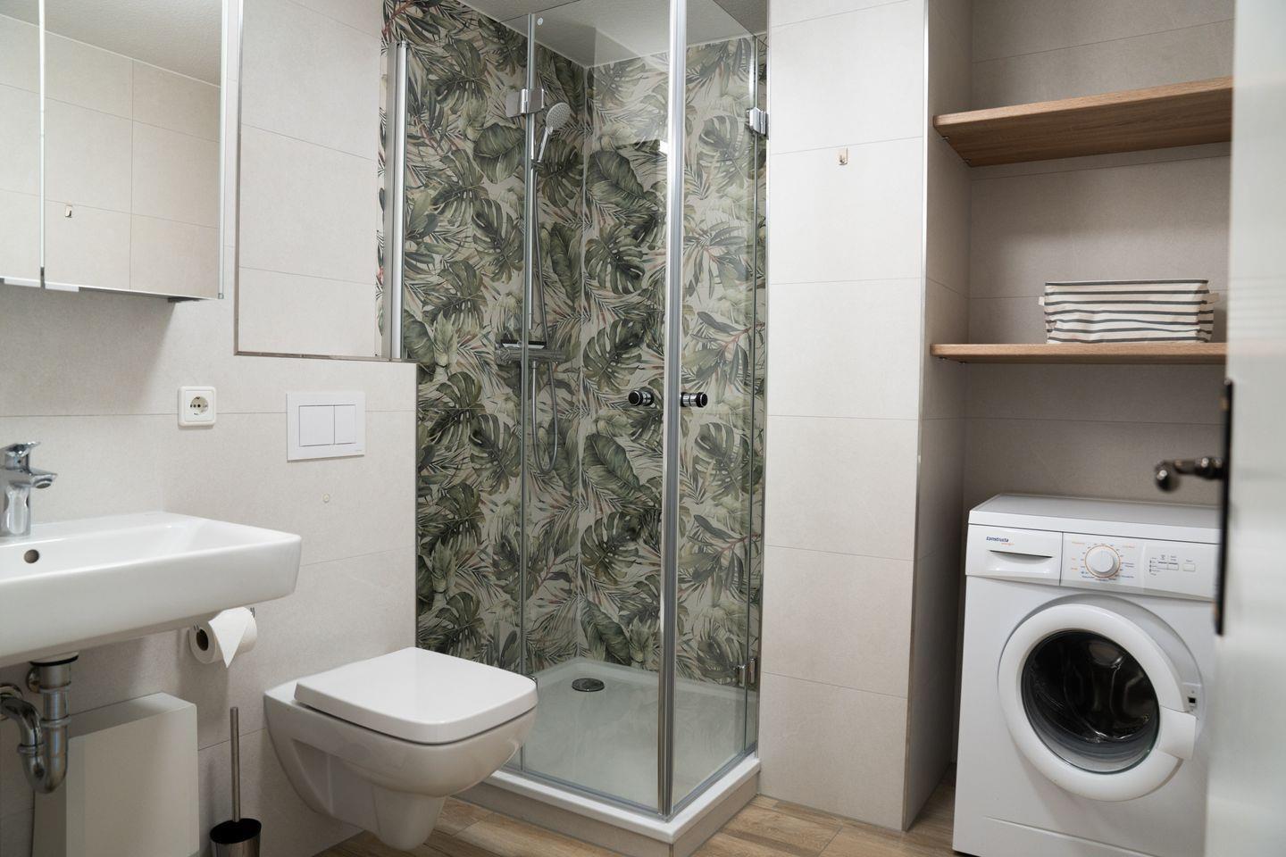 Auf der Wohnebene befindet sich der Wohnraum mit der integrierten Küche, einem Westbalkon, das Bad mit Dusche, WC und Waschmaschine. Nach oben offen auf der Galerie befindet sich das Schlafzimmer mit zwei zusammenstehenden Einzelbetten.