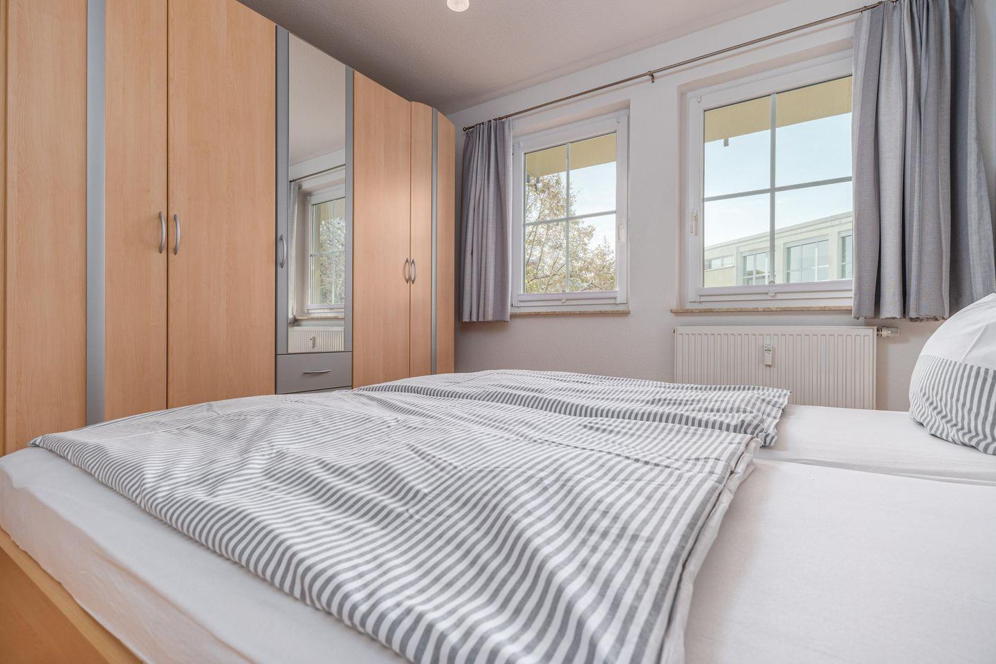 Die 60 m² große Wohnung liegt im 1. Obergeschoss und kann mit maximal 2 Erwachsenen + 2 Kindern angemietet werden. Der Wohnbereich ist aufgeteilt in die integrierte Küche und Essecke sowie einen großzügigen Sitzbereich, von hier aus erreichen Sie auch den Süd-Westbalkon. Es sind zwei Schlafzimmer vorhanden, eines ist mit einem Doppelbett und ein weiteres mit zwei Einzelbetten ausgestattet. Das Badezimmer verfügt über Dusche und WC. Für die Fahrräder steht ein Fahrradschuppen zur Verfügung.