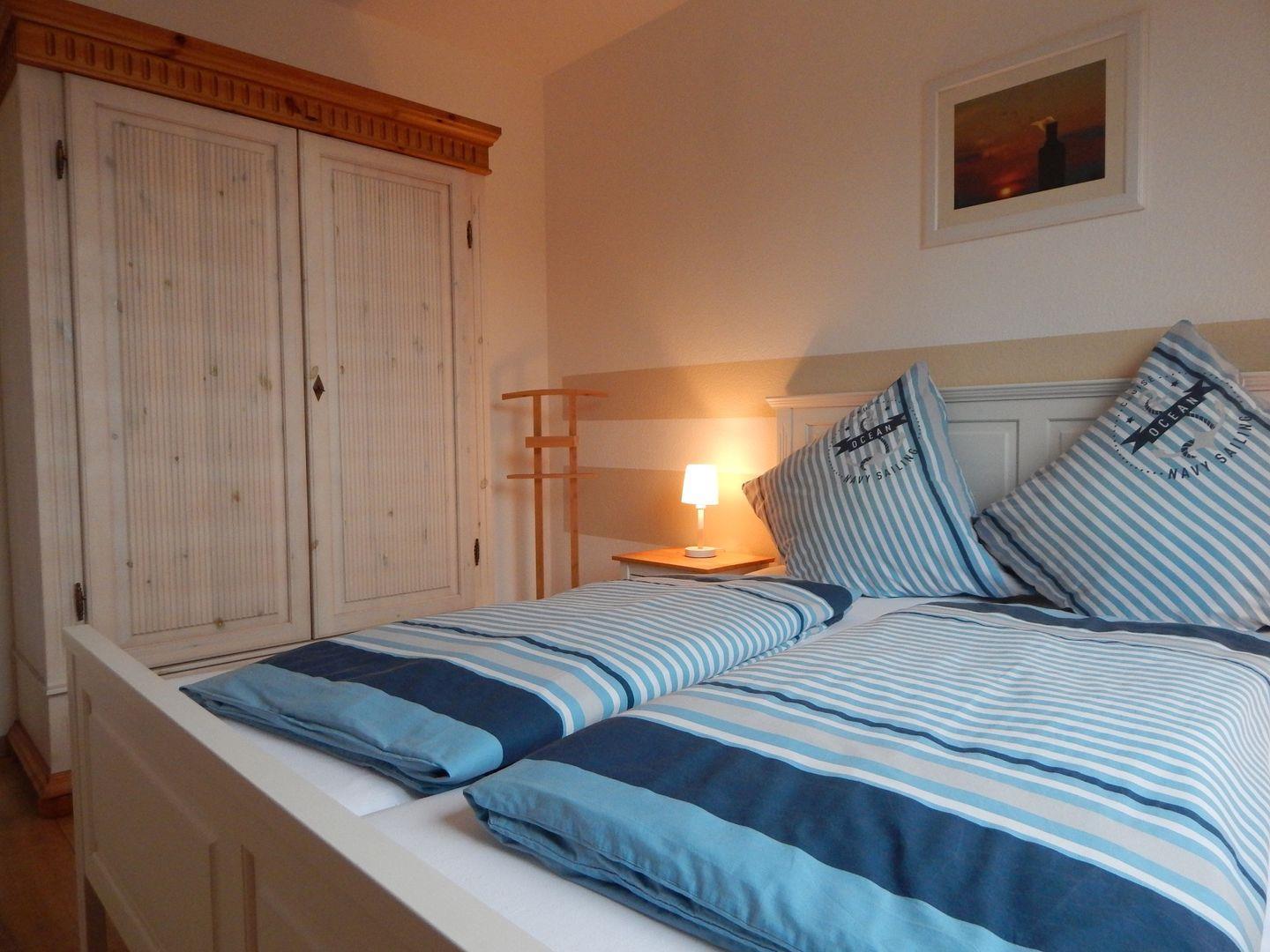 Vom Wohnzimmer aus gelangen Sie in eines der Schlafzimmer, dort stehen für Sie ein Bett (180 x 200 cm) mit zwei getrennten Matratzen und einem Kleiderschrank zur Verfügung.