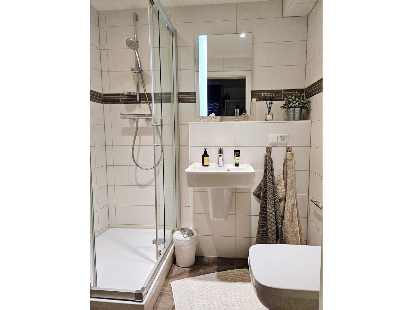 Die Wohnung verfügt über 2 komfortable Schlafzimmer, die jeweils mit hochwertigem Laminatboden ausgestattet sind und für eine entspannte Nachtruhe sorgen. Ein modernes Bad mit Dusche und Badewanne sowie ein weiteres Badezimmer mit Dusche garantieren höchsten Komfort für bis zu vier Gäste. Das großzügige Wohnzimmer mit seinen stilvollen Fliesen lädt zum Verweilen ein und bietet mit einer Sofaecke und einem Esstisch genügend Platz, um nach einem erlebnisreichen Tag zusammenzukommen. Genießen Sie die Unterhaltung durch zwei digitale Fernseher und bleiben Sie dank kostenloses WLAN immer verbunden.