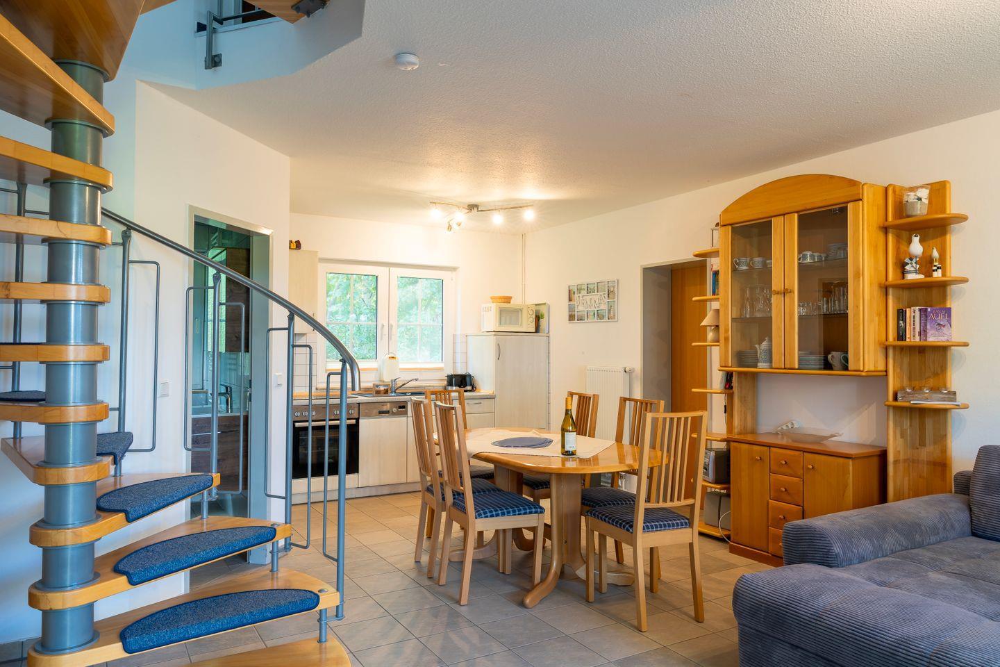 Die offene Küche bietet Ihnen alle Annehmlichkeiten, die Sie von einem komfortablen Ferienhaus erwarten: eine Spülmaschine, Kühlschrank mit Gefrierfach, Ceranherd, Backofen, Kaffeemaschine, Wasserkocher, Toaster sowie umfangreiches Geschirr und Küchenutensilien stehen zur Verfügung. Ein separater Essbereich mit großem Tisch lädt zu gemeinsamen Mahlzeiten ein.