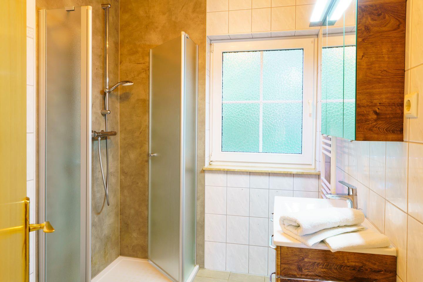 Das Badezimmer verfügt über eine Dusche, Haartrockner und Kosmetikspiegel, zusätzlich ist ein separates Gäste-WC vorhanden. Allergikerfreundliche Gestaltung sowie Fliegengitter an den Fenstern sorgen für bestmöglichen Schutz und Wohlbefinden. WLAN ist selbstverständlich verfügbar.