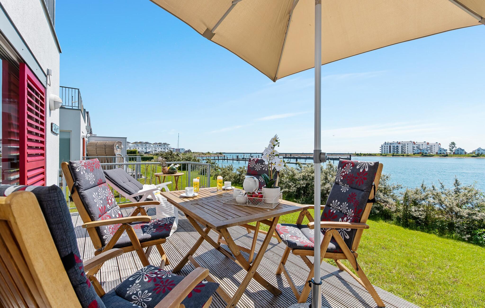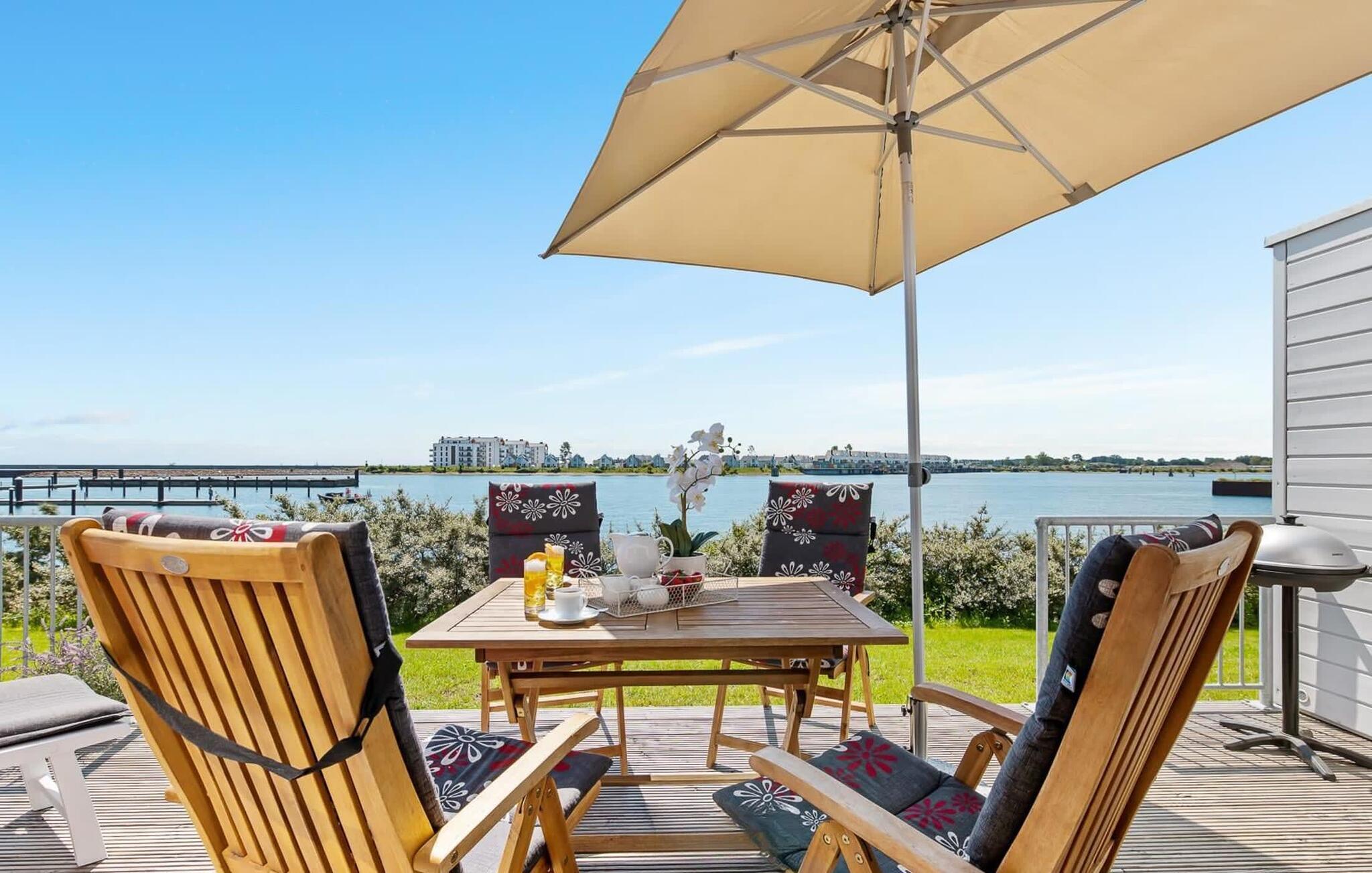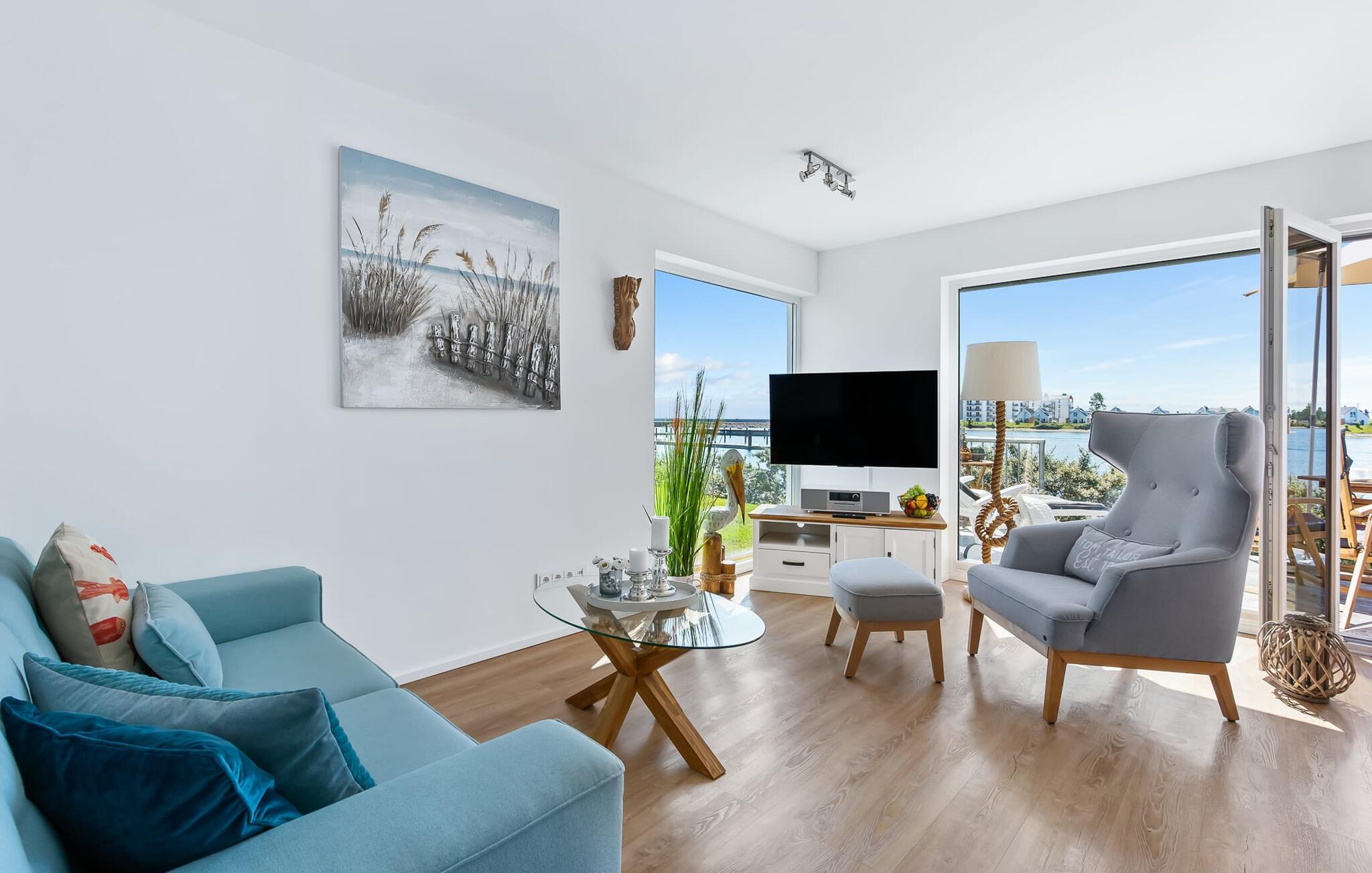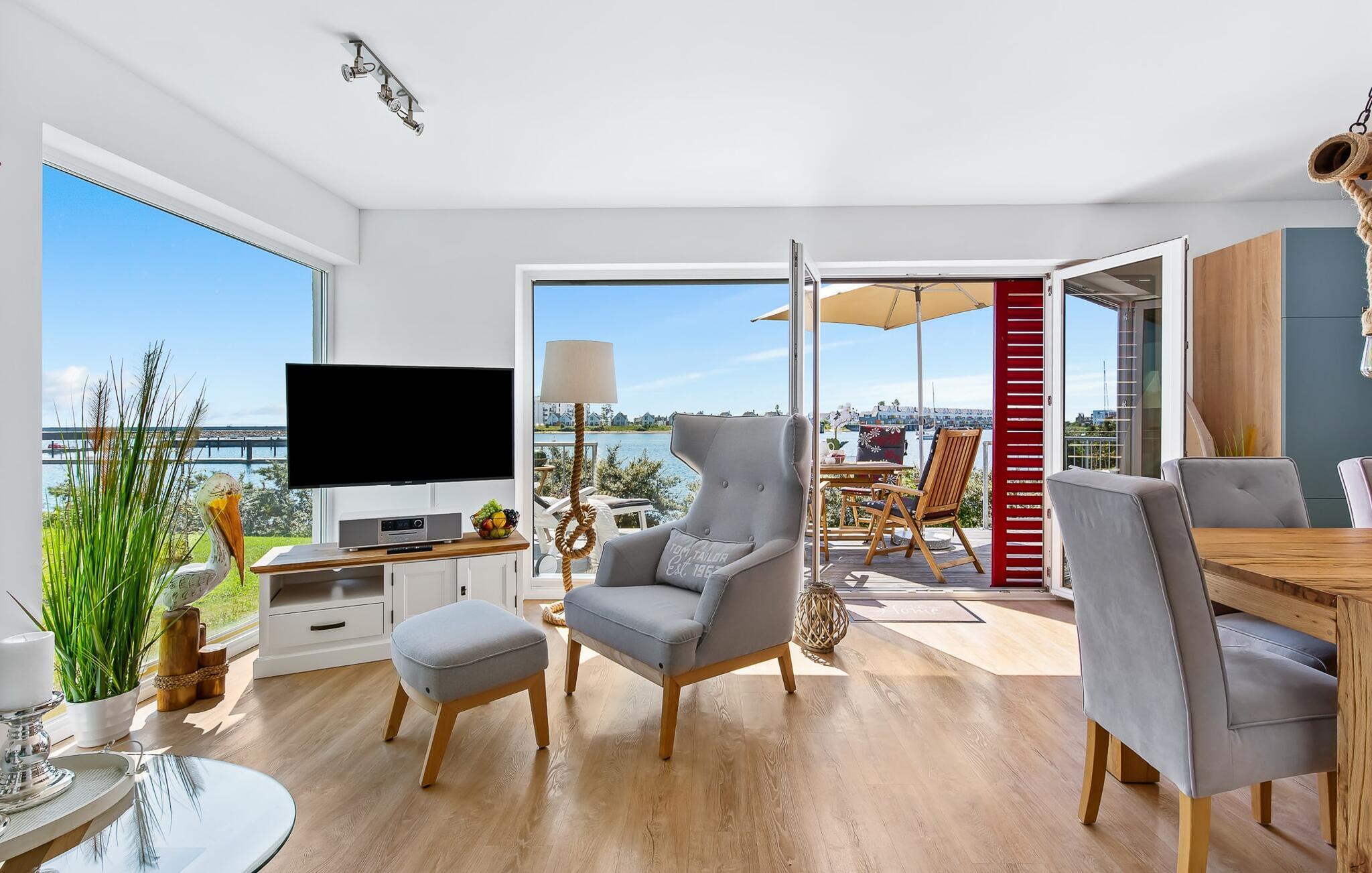 Fantastiska vyer öppnar sig från vardagsrummet och den angränsande terrassen med utsikt över marinan. Hamnbiografen bjuder på underhållning under en trevlig grillkväll eller en romantisk middag med levande ljus.