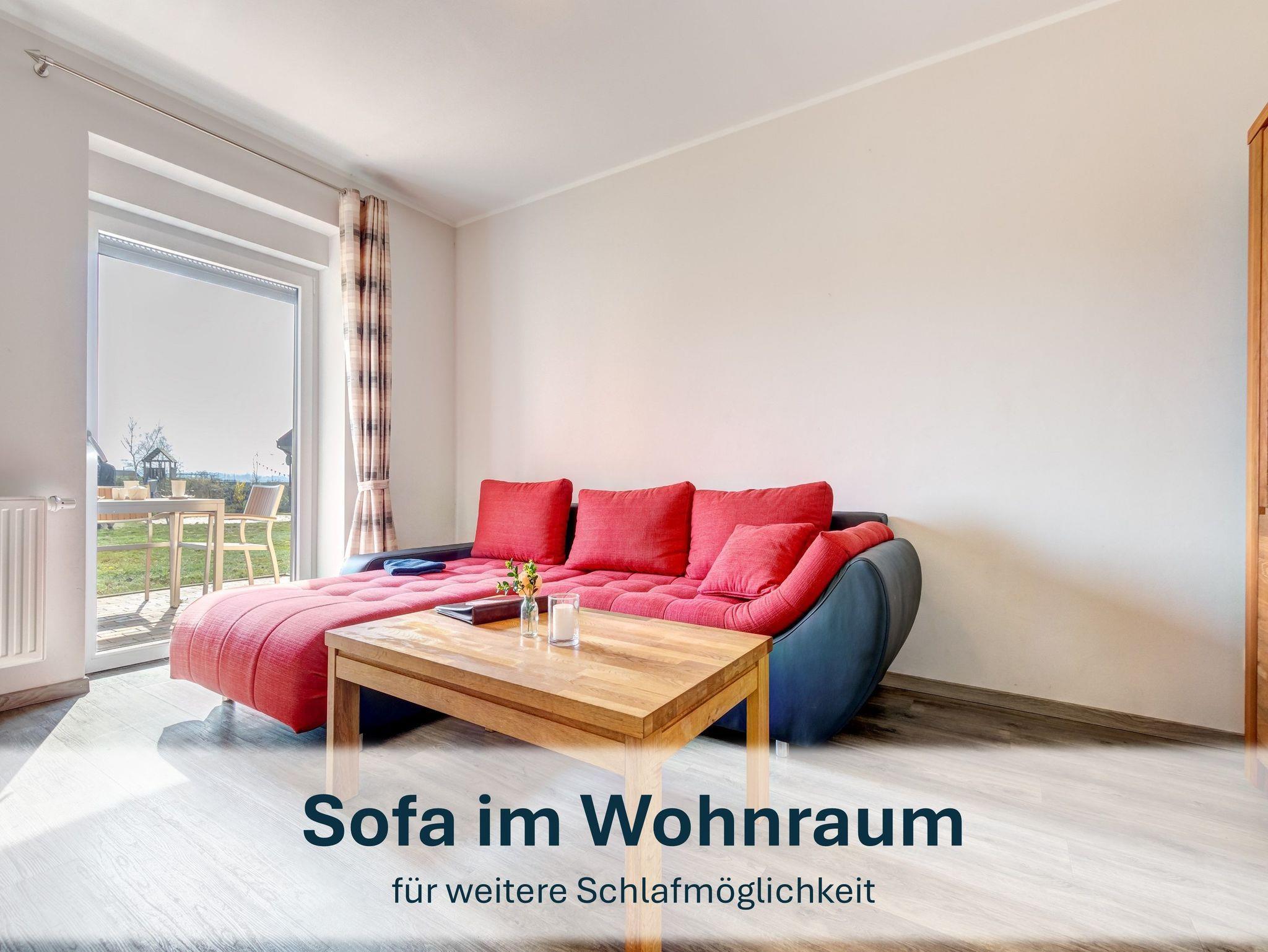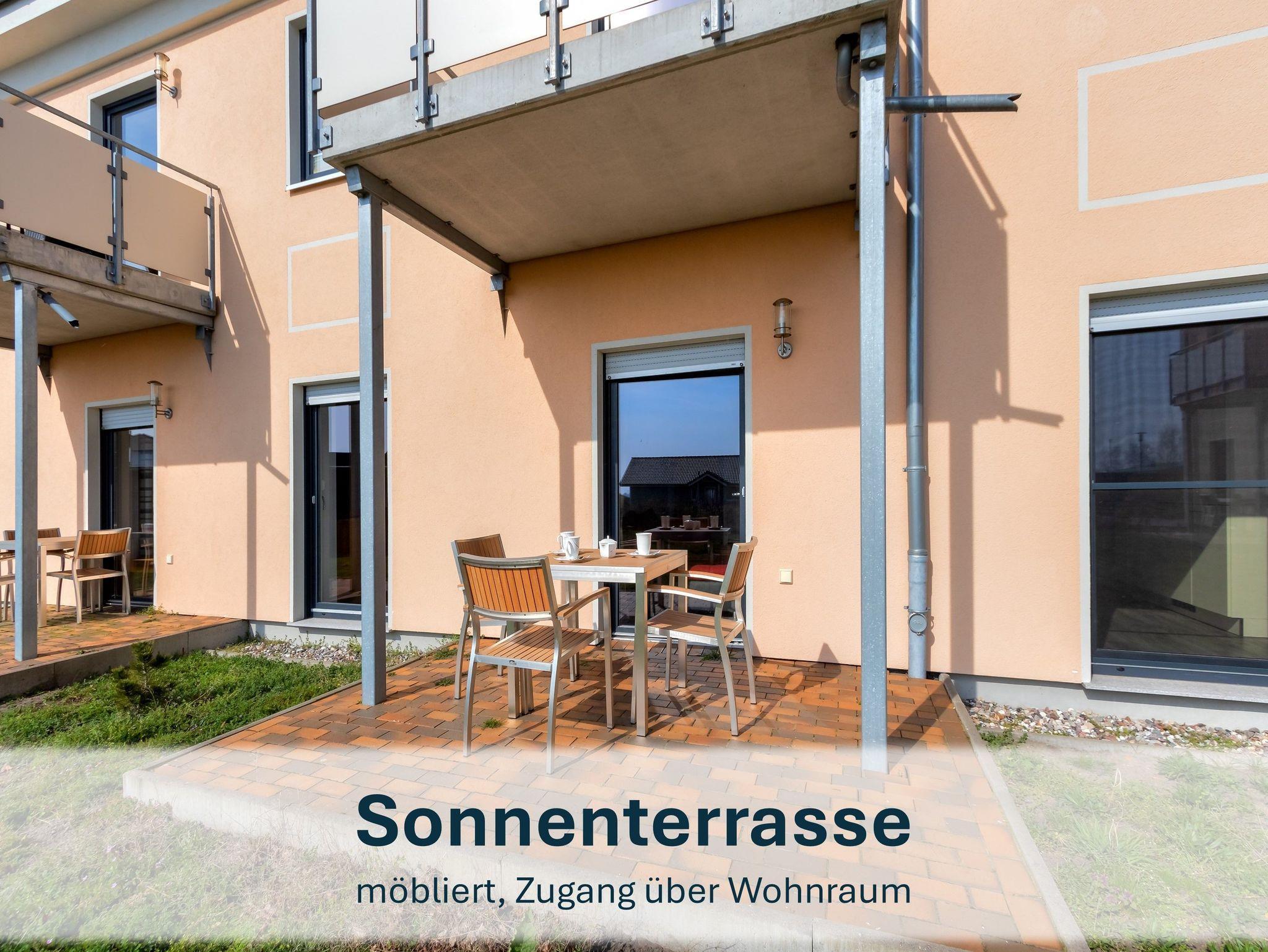 Im großzügigen Wohnbereich erwarten Sie eine Schlafcouch, ein Flat-TV sowie kostenfreies WLAN. Die angrenzende, offene Küche ist voll ausgestattet ? inklusive Spülmaschine, Ceranfeld, Backofen, Mikrowelle, Kühlschrank mit Gefrierfach, Kaffeemaschine, Wasserkocher und Toaster. Das moderne Bad verfügt über eine ebenerdige Dusche. Die möblierte Sonnenterrasse lädt zum Verweilen im Freien ein.