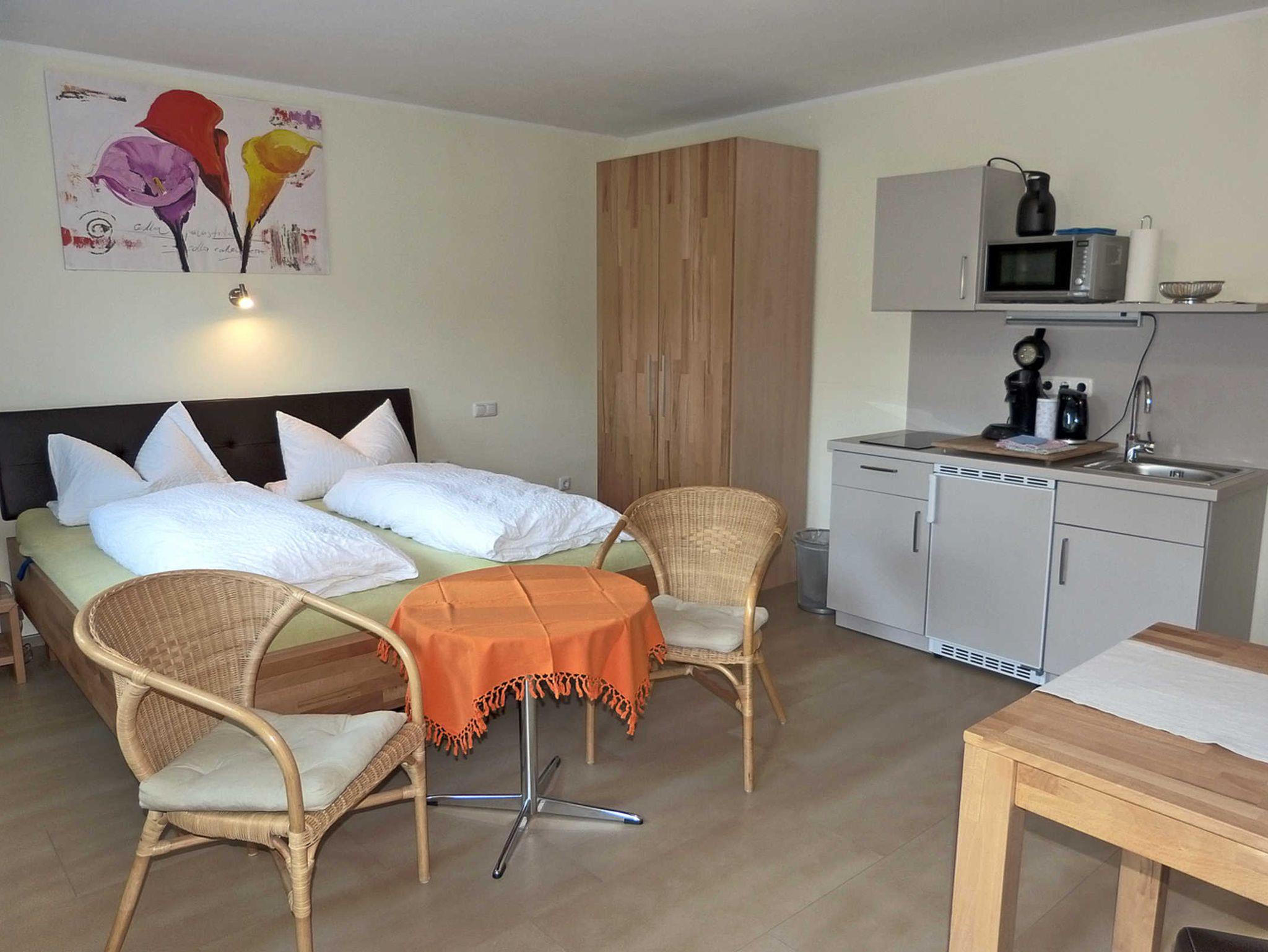 Unser gemütliches Appartement für 2 Personen mit kleiner Küchenzeile und barrierefreiem Bad befindet sich im früheren Kuhstall.