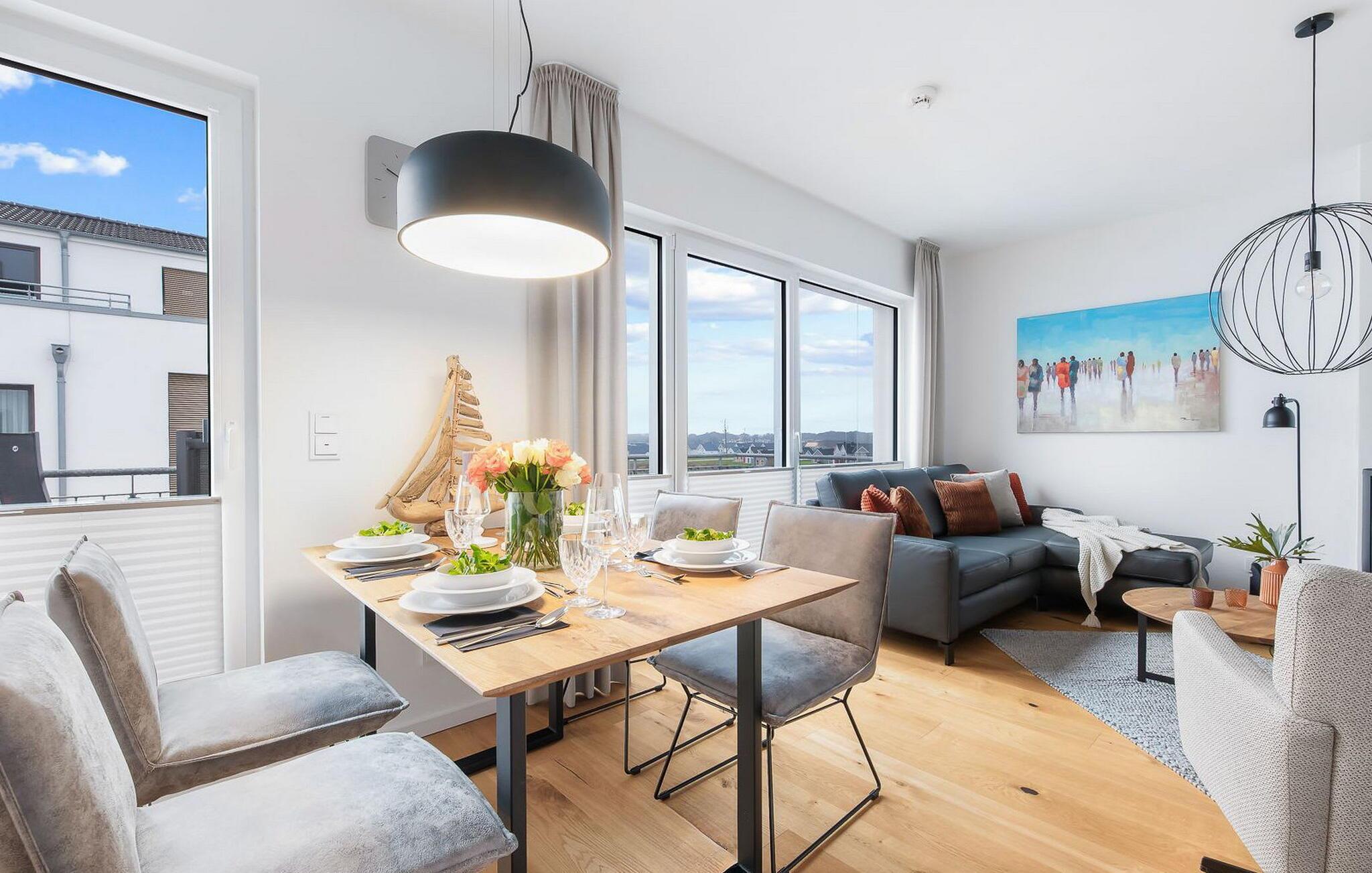 Semesterlägenheten PEILDECK har ett rymligt vardagsrum/matsal med parkettgolv i äkta trä. Fönstren från golv till tak skapar en trevlig och ljus atmosfär. Den angränsande balkongen i söderläge inbjuder dig att koppla av och dröja dig kvar. Här kan du titta på de underbara solnedgångarna över OstseeResort Olpenitz med ett glas vin.