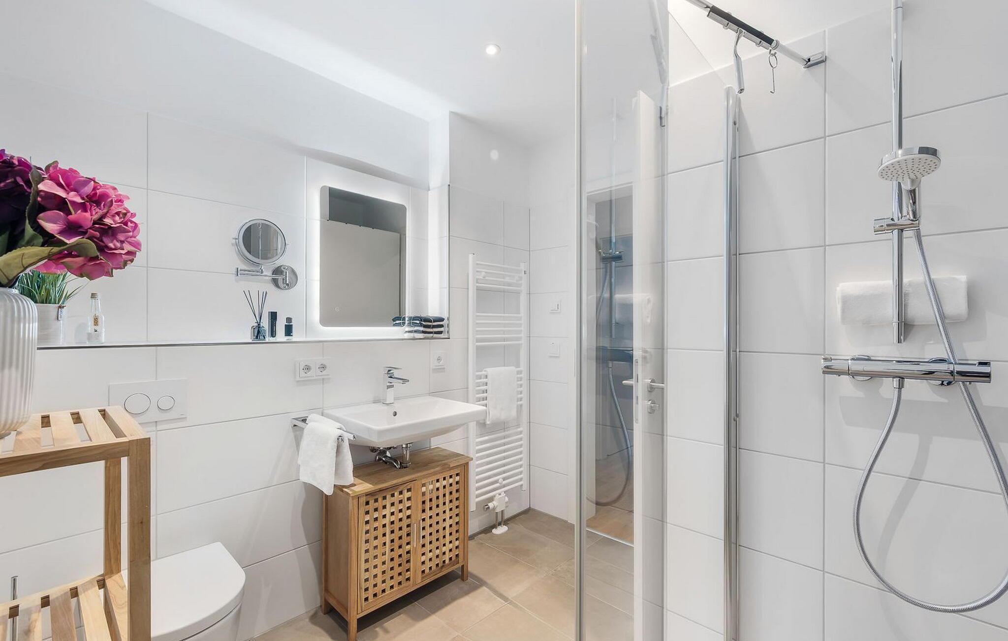 Den högkvalitativa och stilfullt inredda semesterlägenheten lämnar inget övrigt att önska och skämmer bort sina gäster även under obekväma nordiska dagar med en sprakande öppen spis och golvvärme, som förvandlar vardagsrummet till en absolut oas av välbefinnande. Kryp upp i den bekväma skinnsoffan och titta på det grova havet från sidoutsikten över havet. 3 platt-TV-apparater med underhållningsprogram för hemmet ger underhållning i huset. En hiss tar dig också enkelt direkt till dörren till ditt semesterhus på 3:e våningen.
