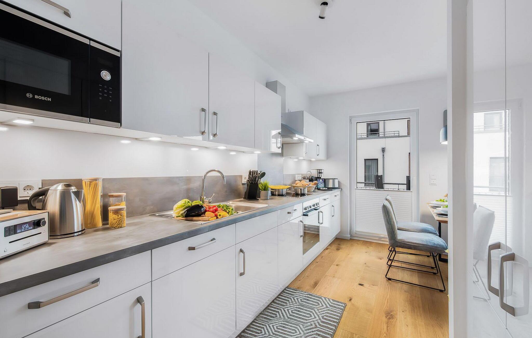 Det integrerade köket med sin perfekta utrustning kommer att få även självutnämnda icke-kockar att sitta upp och lägga märke till och se till att de mest utsökta skapelserna hamnar på balkongbordet. Och allt smakar bra mot den här bakgrunden!