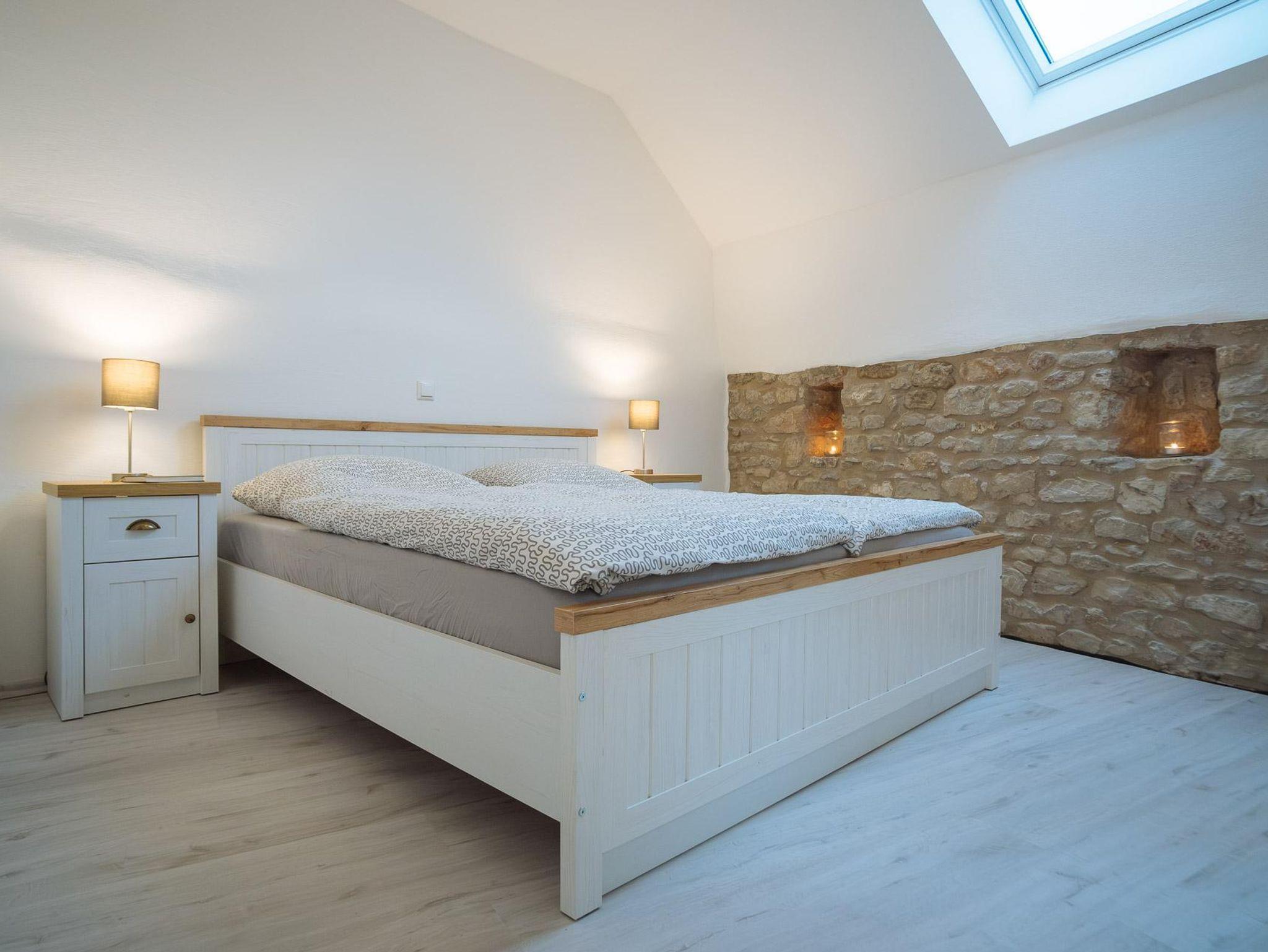 Diese liebevoll eingerichtete Ferienwohnung im ersten Obergeschoss einer umgebauten Bruchsteinscheune (Baujahr 1807) verbindet rustikalen Charme mit moderner Einrichtung und Komfort. Die 40-Quadratmeter-Wohnung hat ein traumhaft schönes, großzügiges Schlafzimmer (Bett 180 cm breit) mit einer Bruchsteinwand und einem Fenster mit Aussicht auf den Himmel.Daneben befindet sich ein helles Duschbad mit Tageslicht. In der Wohnküche befindet sich eine moderne Einbauküche mit Backofen, Spülmaschine und allem, was man zum Kochen braucht. Auf dem gemütlichen Sofa können Sie es sich mit einem Buch bequem machen. Oder vor dem Fernseher, der einen Satelittenanschluss hat und auch ans Internet angeschlossen ist. Von der Wohnküche gehen Sie direkt auf Ihre 20 Quadratmeter große, eigene Terrasse (Sonnenseite), die mit einem großen Sonneschirm und Gartenmöbel ausgestattet ist. Von der Terrasse kommen Sie über eine Treppe direkt in auf eine große Wiese, wo ein Holzhaus für Kinder steht und sich ein großer, überdachter Grill-/Feuerplatz befindet. Kinder dürfen auch im Garten vor der Terrasse zelten.