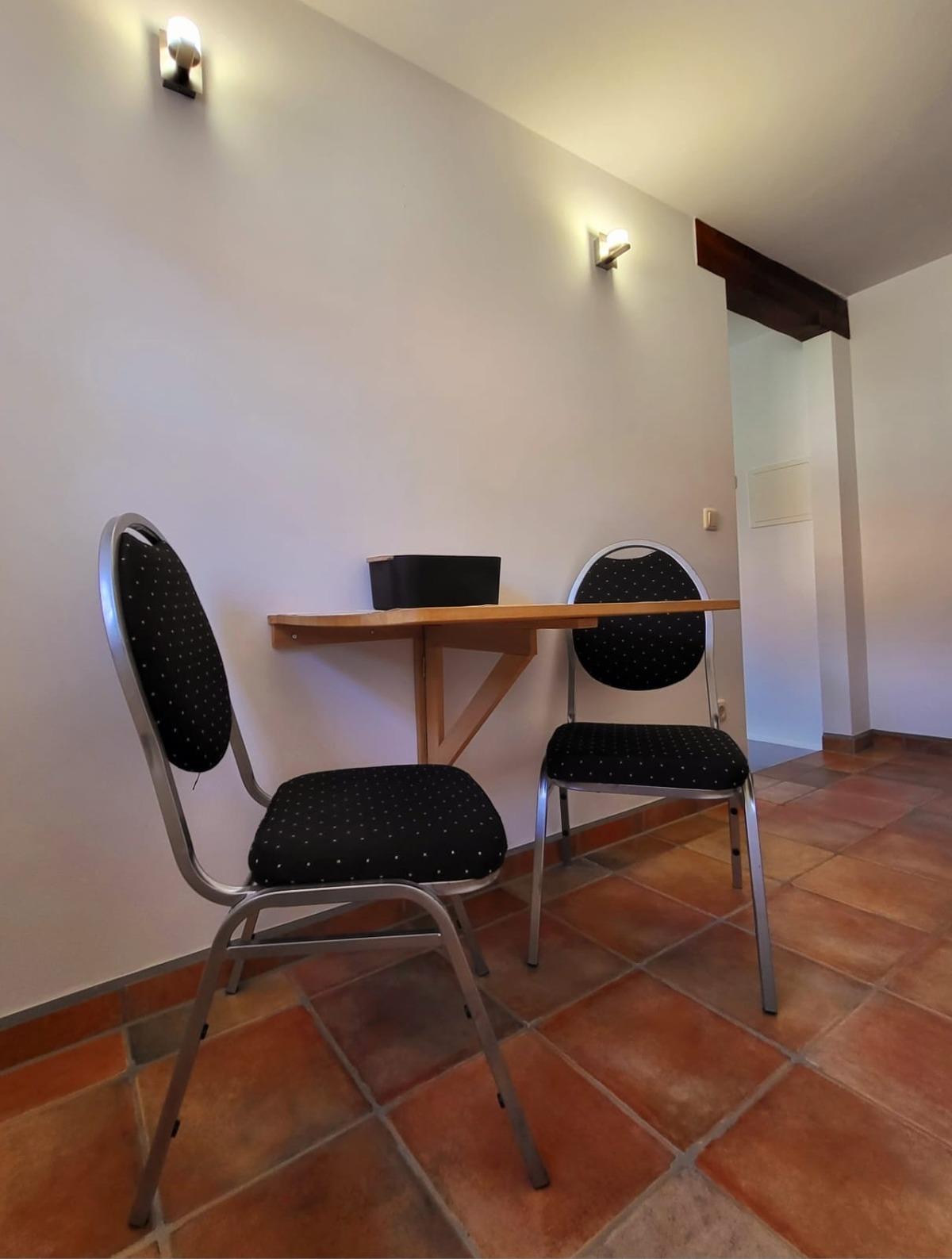Die Ausstattung beinhaltet einen Kühlschrank mit Gefrierfach. Zudem ein Herdplatte mit 2 Platten, Kaffeemaschine, Wasserkocher, Toaster, ausreichend Geschirr, Gläser, Besteck, Töpfe und Pfannen.