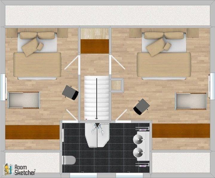 Im Dachgeschoss befinden sich 2 Schlafzimmer mit je einem Doppelbett. Babybetten können in beiden Zimmern zugestellt werden. Auch im modernen Bad im DG sorgt eine el. Fußbodenheizung für wohlige Wärme.