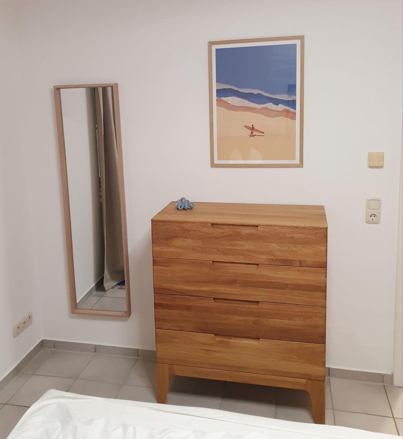 Die 56 m² große Ferienwohnung im Erdgeschoss bietet ein Schlafzimmer, ein modernes Bad und eine offene Küche zum Wohnbereich. Genießen Sie entspannte Stunden auf der überdachten Terrasse mit Gartenblick. Die Unterkunft verfügt über WLAN, Waschmaschine, Privatparkplatz, Fußbodenheizung und kinderfreundliche Ausstattung. Der Strand ist 4 km entfernt, Einkaufsmöglichkeiten erreichen Sie in 500 m.