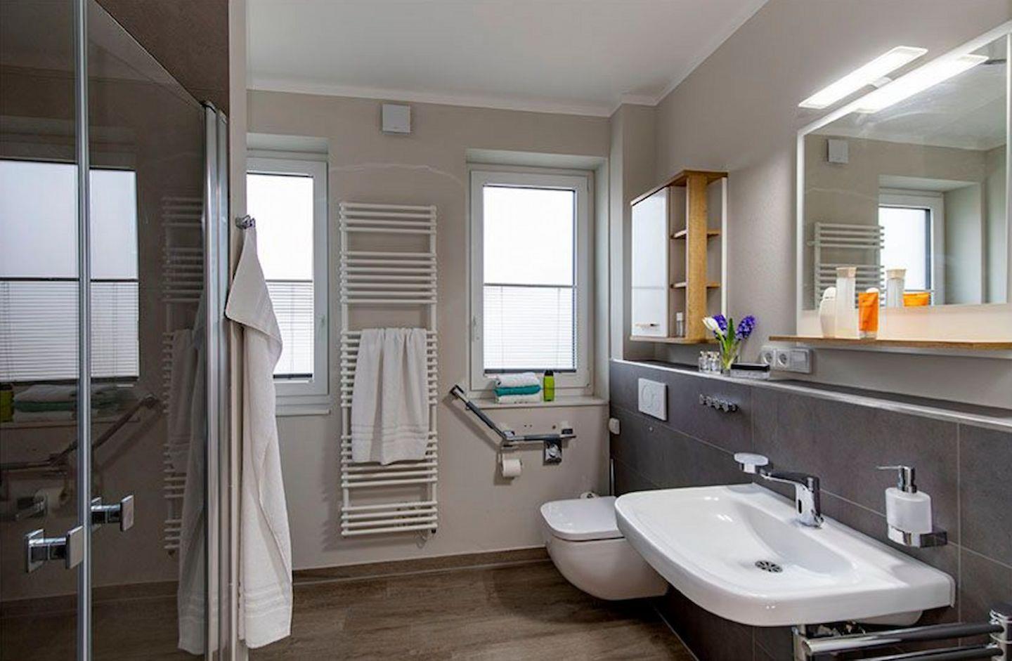 Das Bad besitzt eine ebenerdige breite Dusche mit einer ca. 1,20m breiten Tür. Eine Waschmaschine und ein Wäscheständer sind ebenfalls vorhanden.