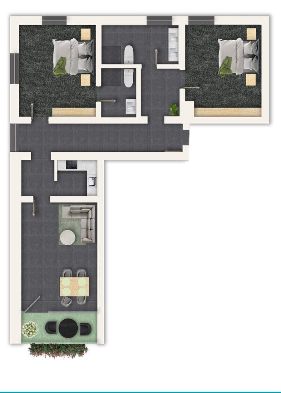 • zwei Schlafzimmer mit Doppelbett und Schlafcouch im Wohnzimmer
