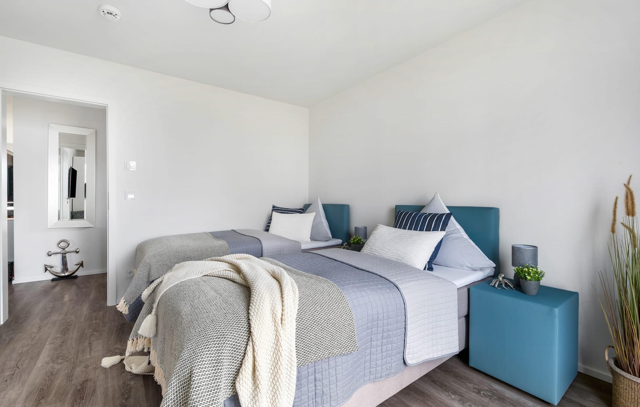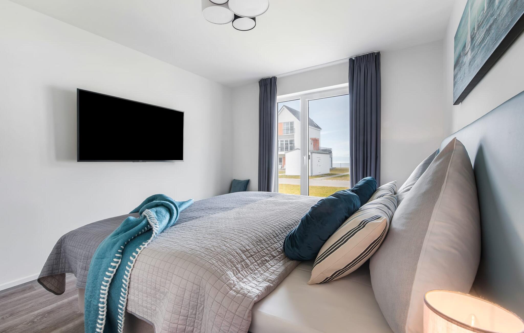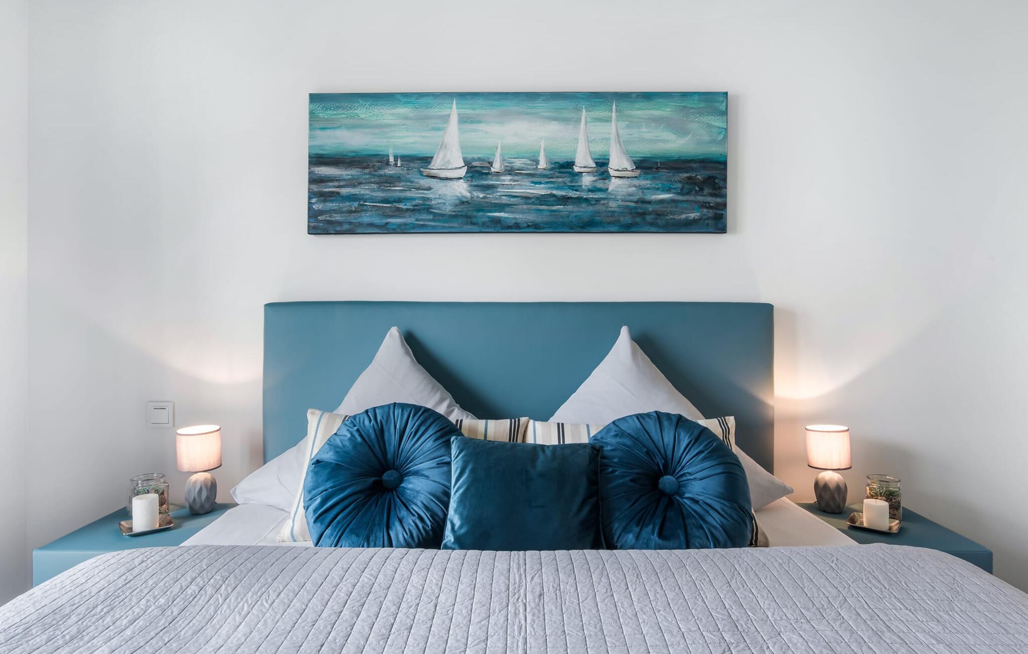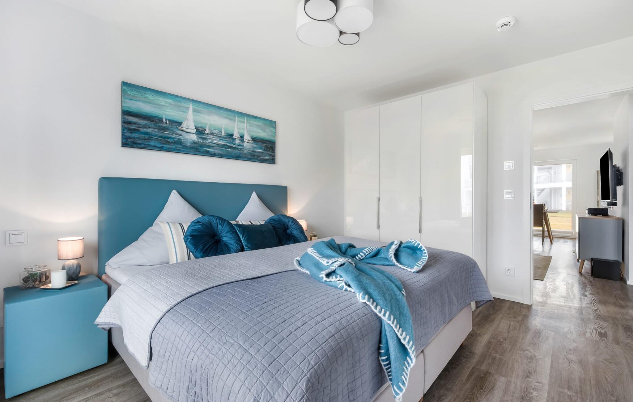 De två sovrummen är utrustade med högkvalitativa boxspring-sängar och har en vacker utsikt över hamnen. Det finns ytterligare en TV i varje sovrum för mysiga TV-kvällar. Det finns gott om förvaringsutrymme i garderoberna.