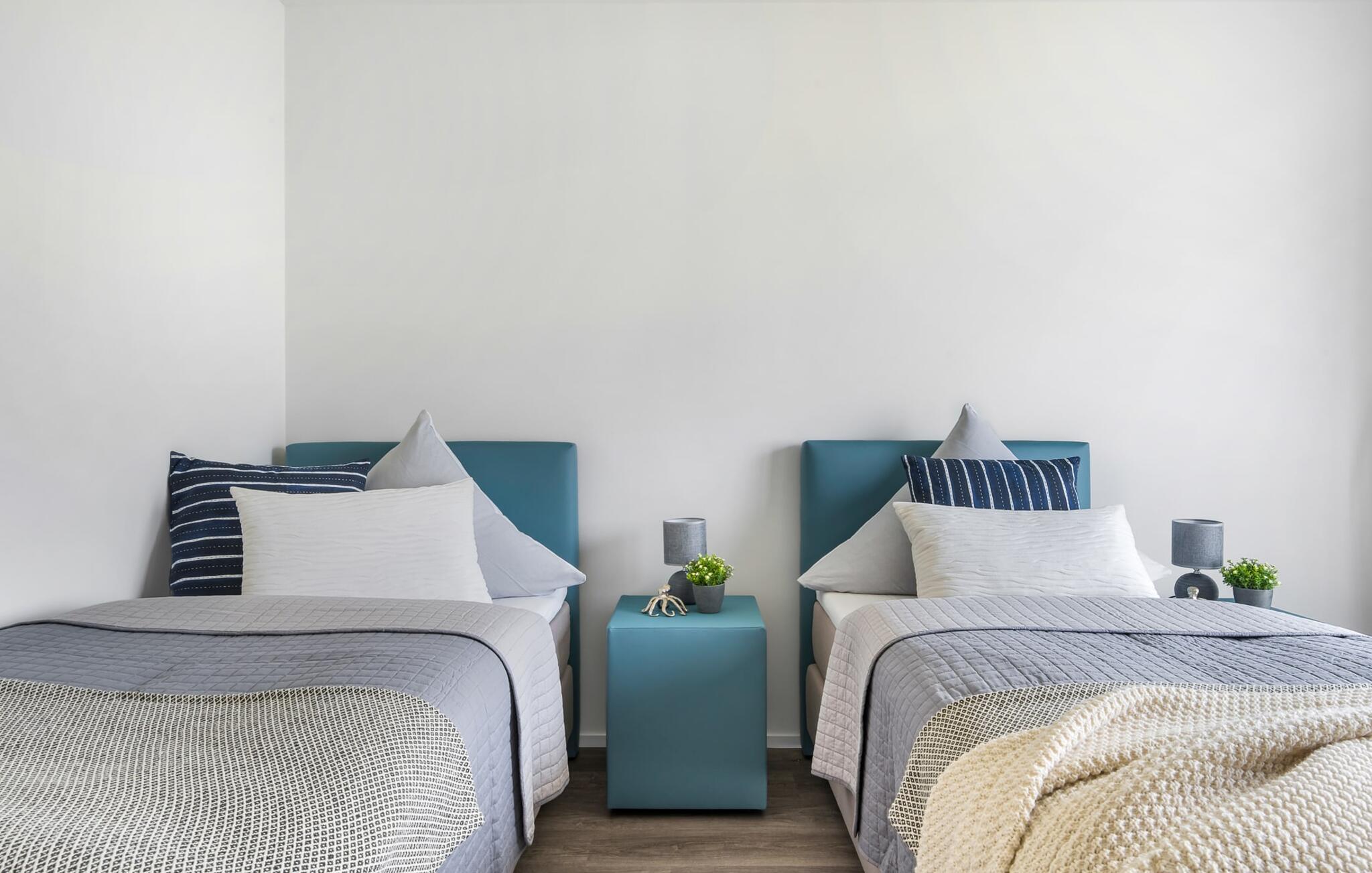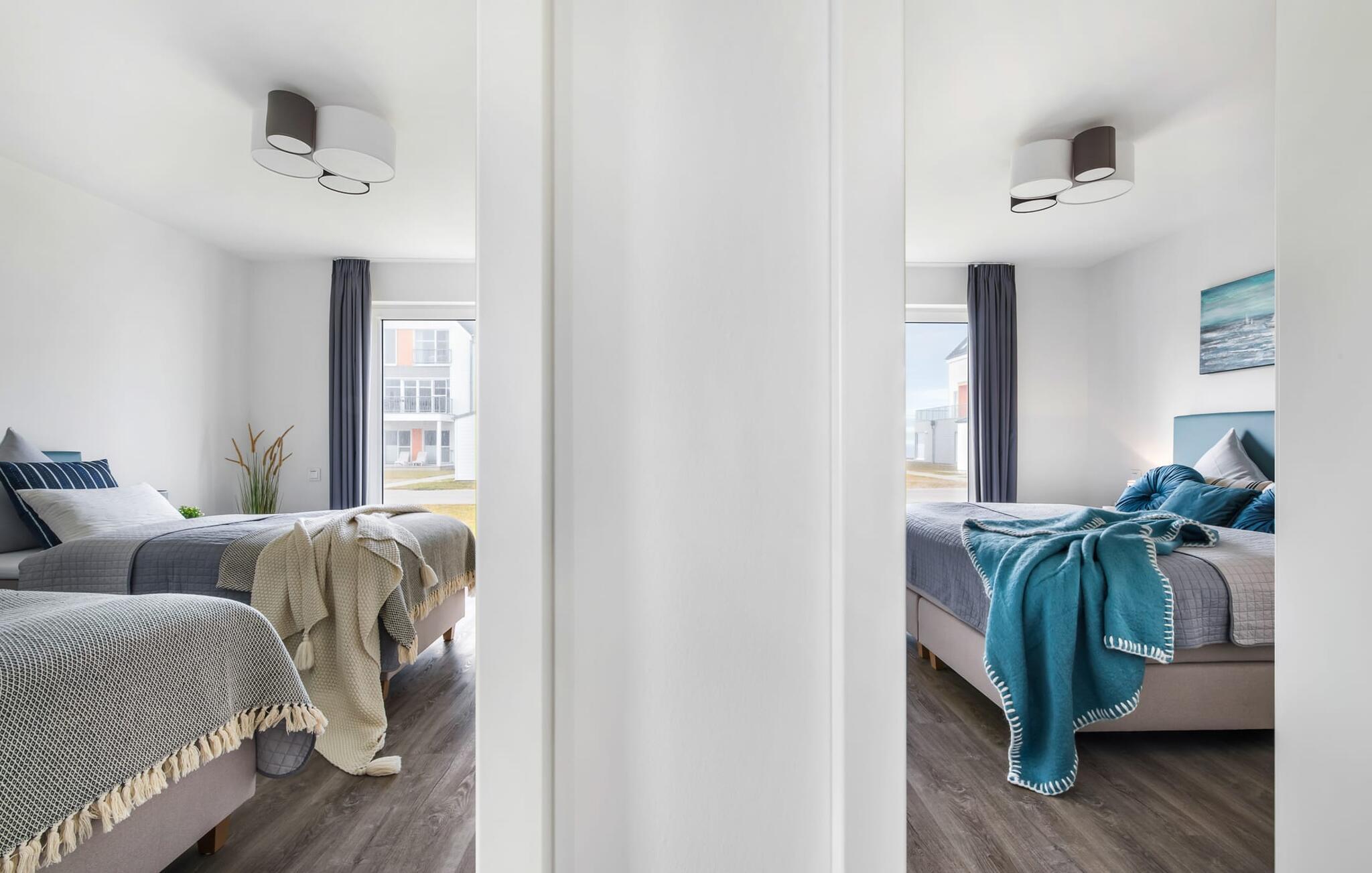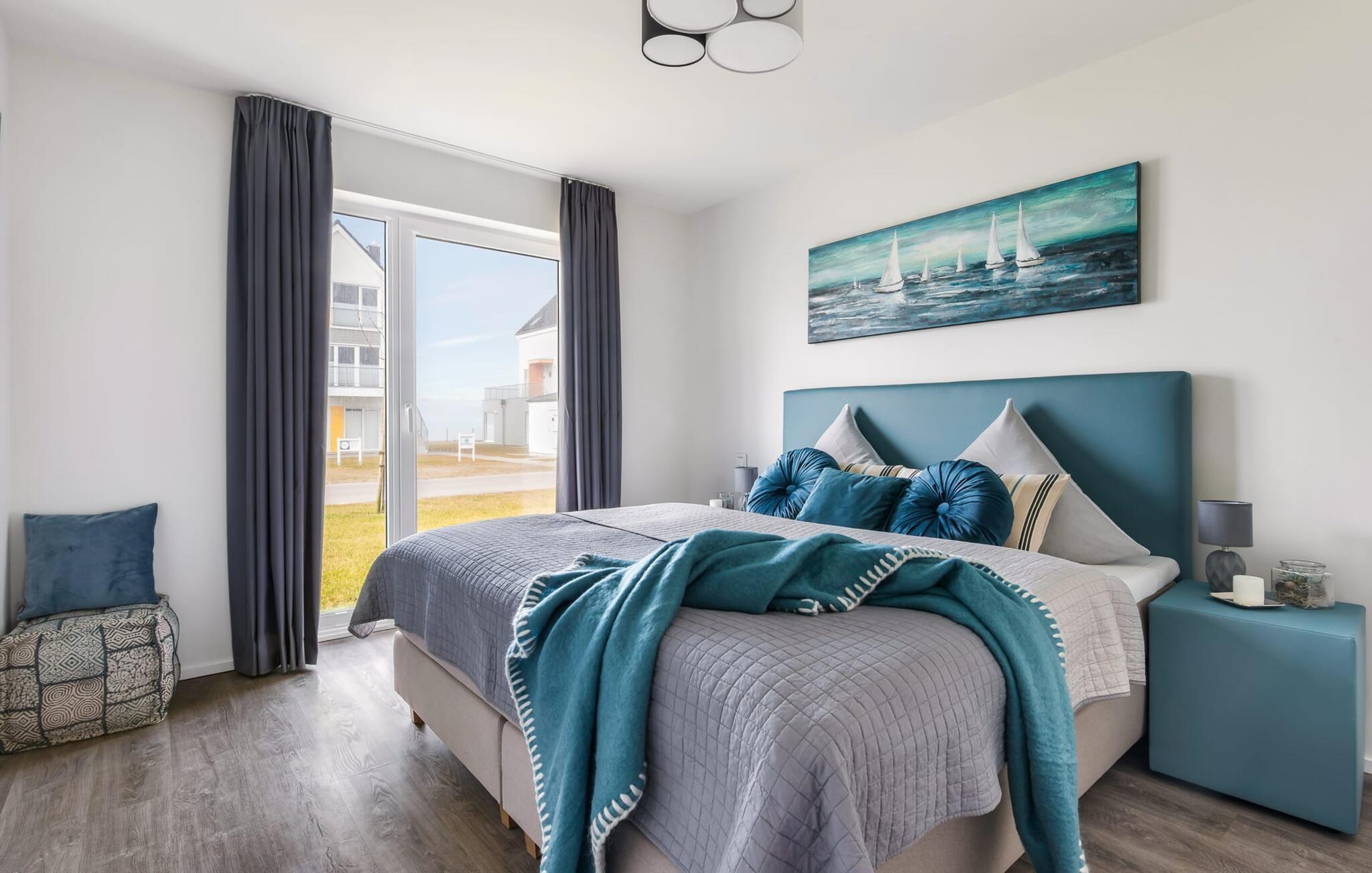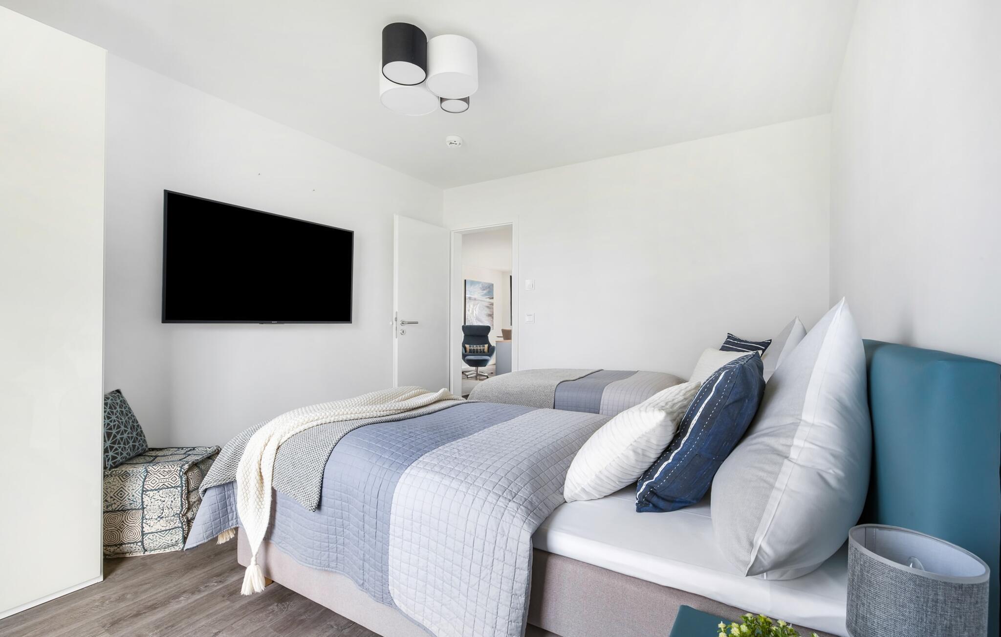 De två sovrummen är utrustade med högkvalitativa boxspring-sängar och har en vacker utsikt över hamnen. Det finns ytterligare en TV i varje sovrum för mysiga TV-kvällar. Det finns gott om förvaringsutrymme i garderoberna.