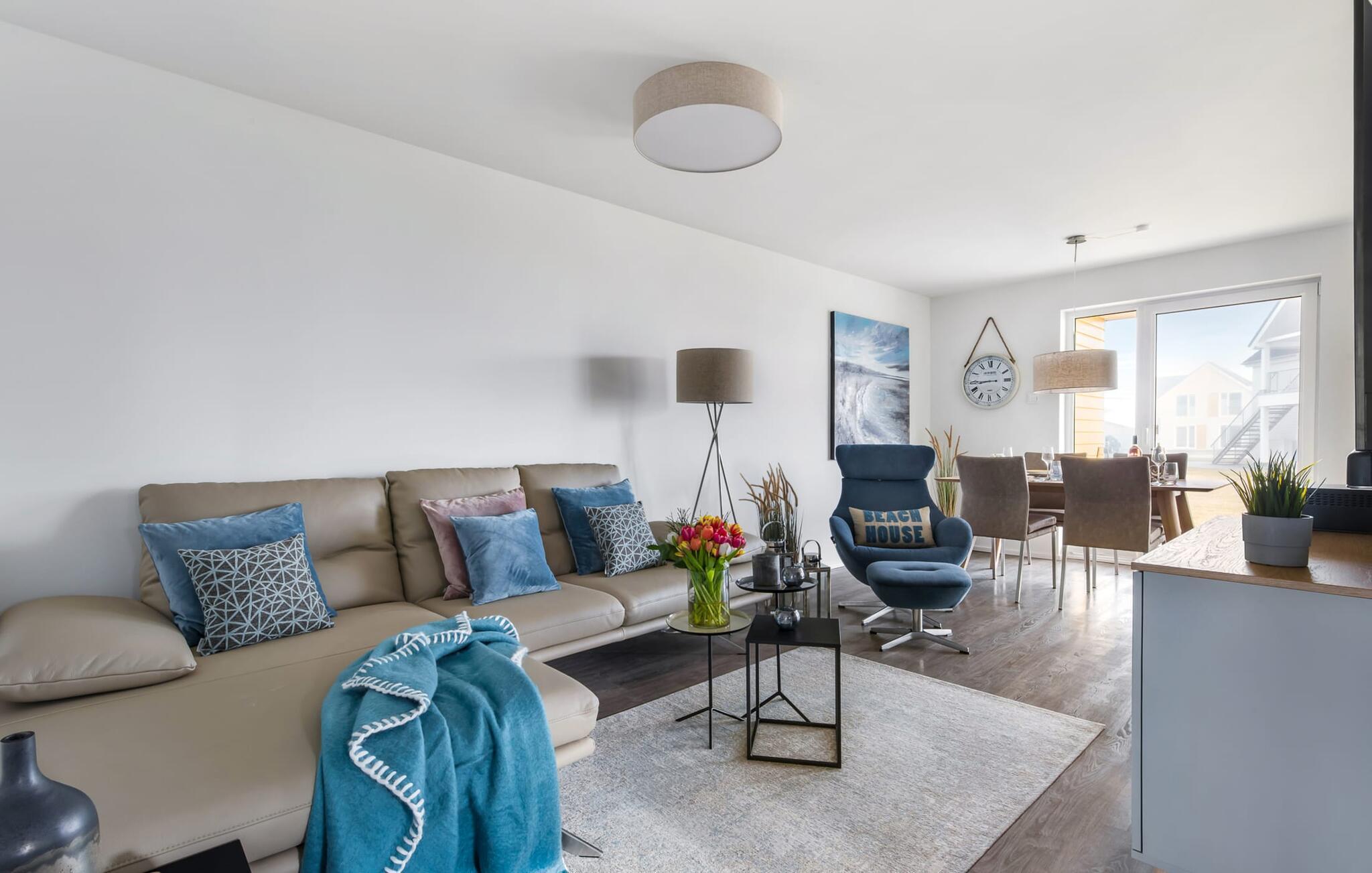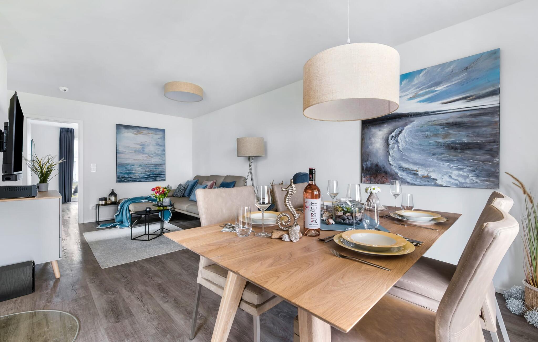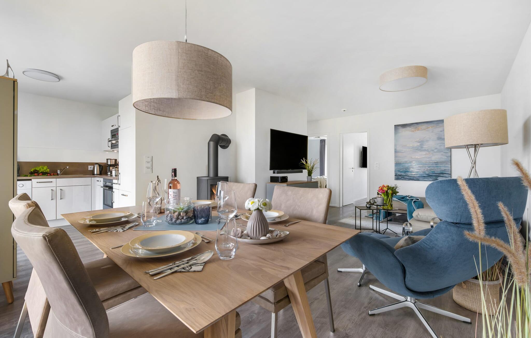 Det kombinerade vardagsrummet/matsalen med öppen planlösning är utformad i maritim stil och är översvämmad av ljus och mysig tack vare fönstren från golv till tak. Den rymliga solterrassen i sydostläge ligger i direkt anslutning till matplatsen. Här finns sol från gryning till skymning och här kan du umgås utomhus med trädgårdsmöbler och grill.
