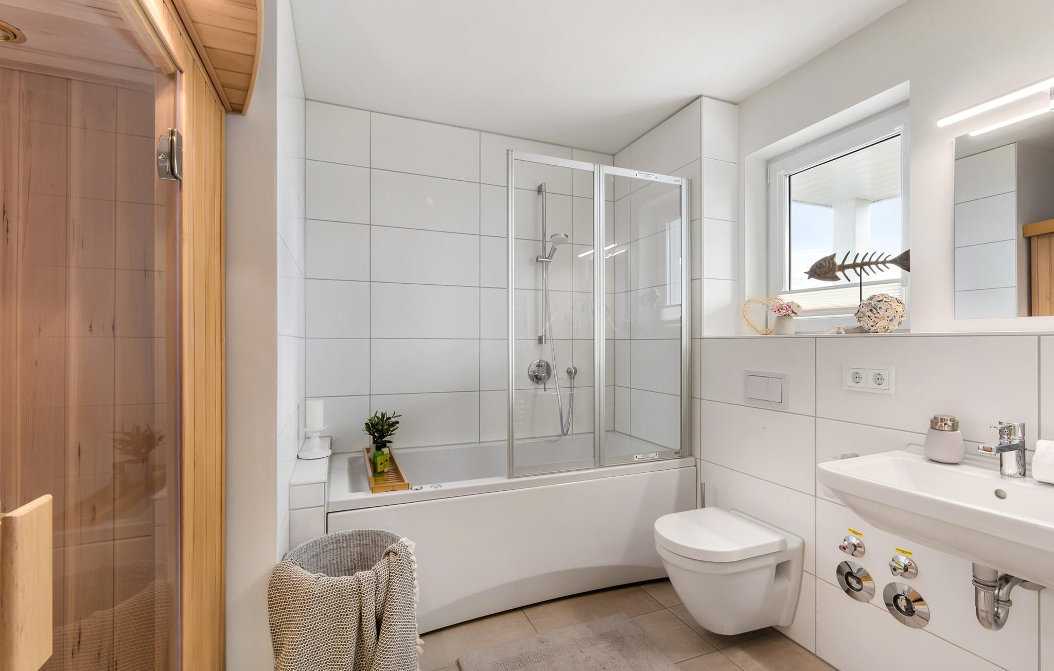 Badrummet är en liten wellness-oas! Ett bubbelbadkar och en infraröd bastu förgyller även de dagar då vädret inte riktigt vill som det ska och blir nordiskt.