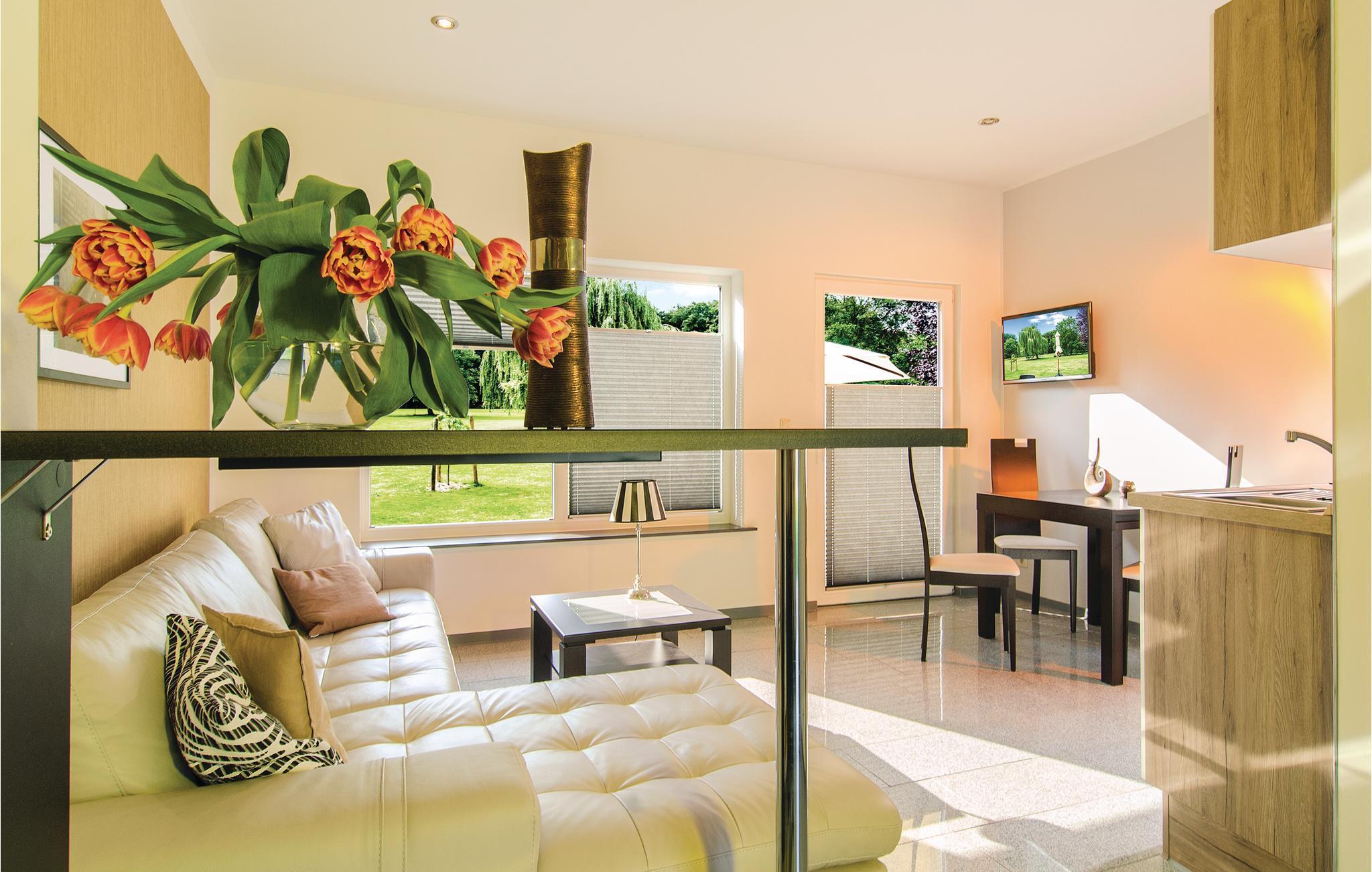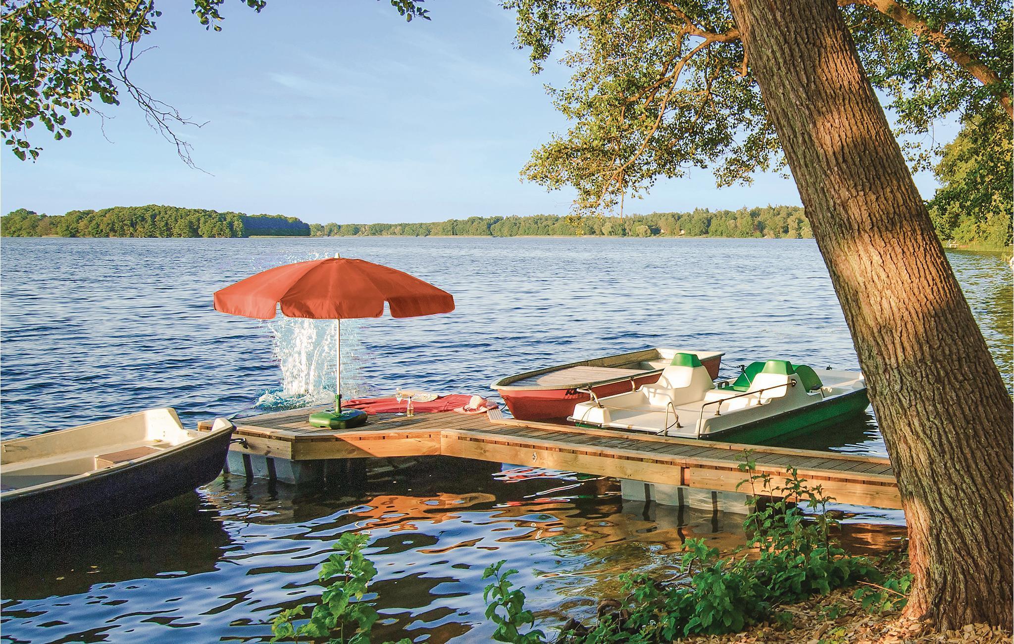 Det modernt inredda vardagsrummet övertygar med ett öppet kök och en bred glasfront. Härifrån har du tillgång till den öppna terrassen med gräsmatta. De två sovrummen ligger i den övre delen av huset. Det finns en badplats med brygga inom synhåll från sjön Pinnow. Cyklar finns tillgängliga mot en avgift i receptionen. En roddbåt kan också hyras.