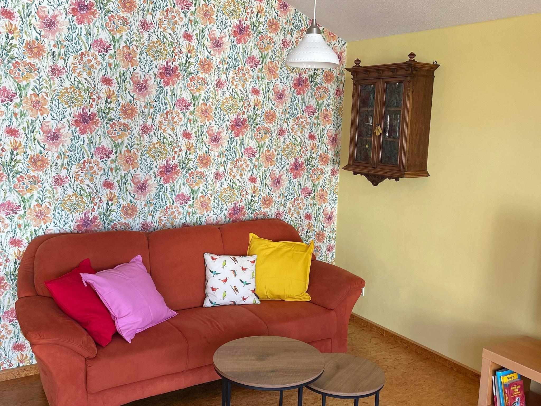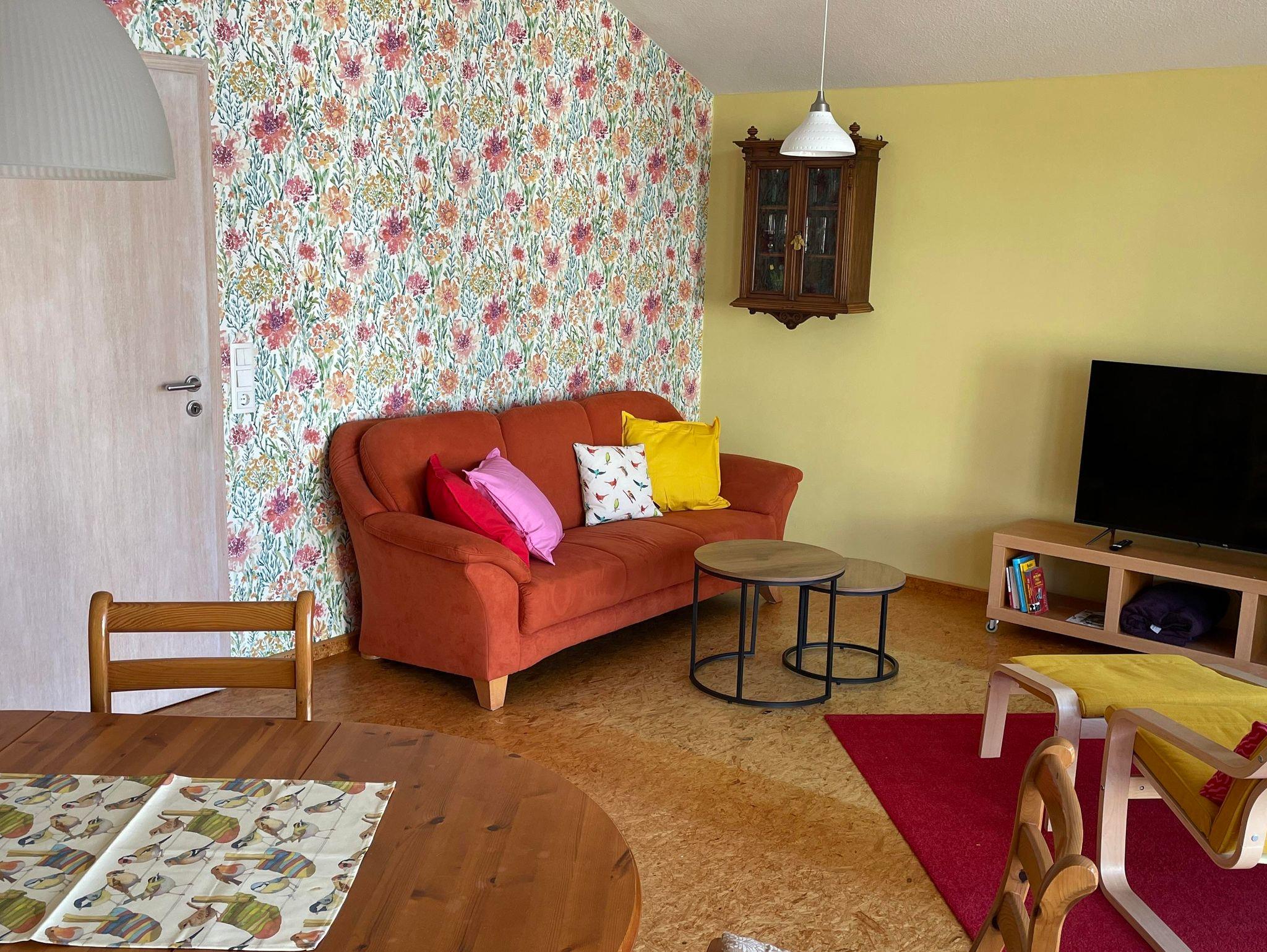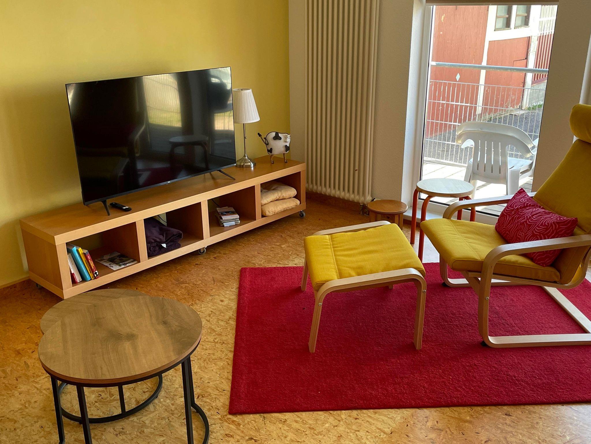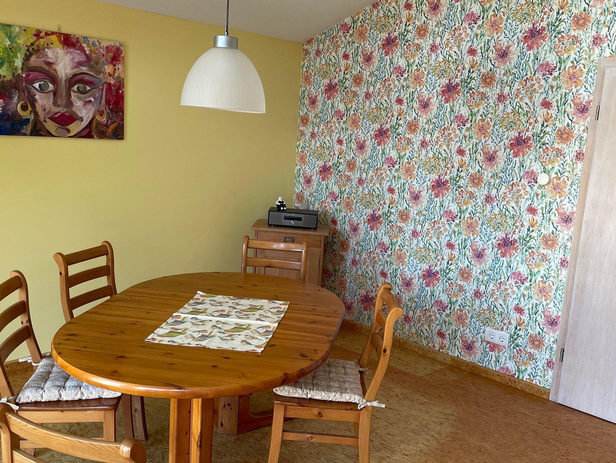 Wir haben ein großzügiges, helles Wohnzimmer für Euch. Die Couch, ein gemütlicher Sessel und ein großer Smart-TV- Fernseher laden zum Chillen ein und ein gemütlicher Esstisch für bis zu acht Personen bietet Platz zum entspannten Sitzen.