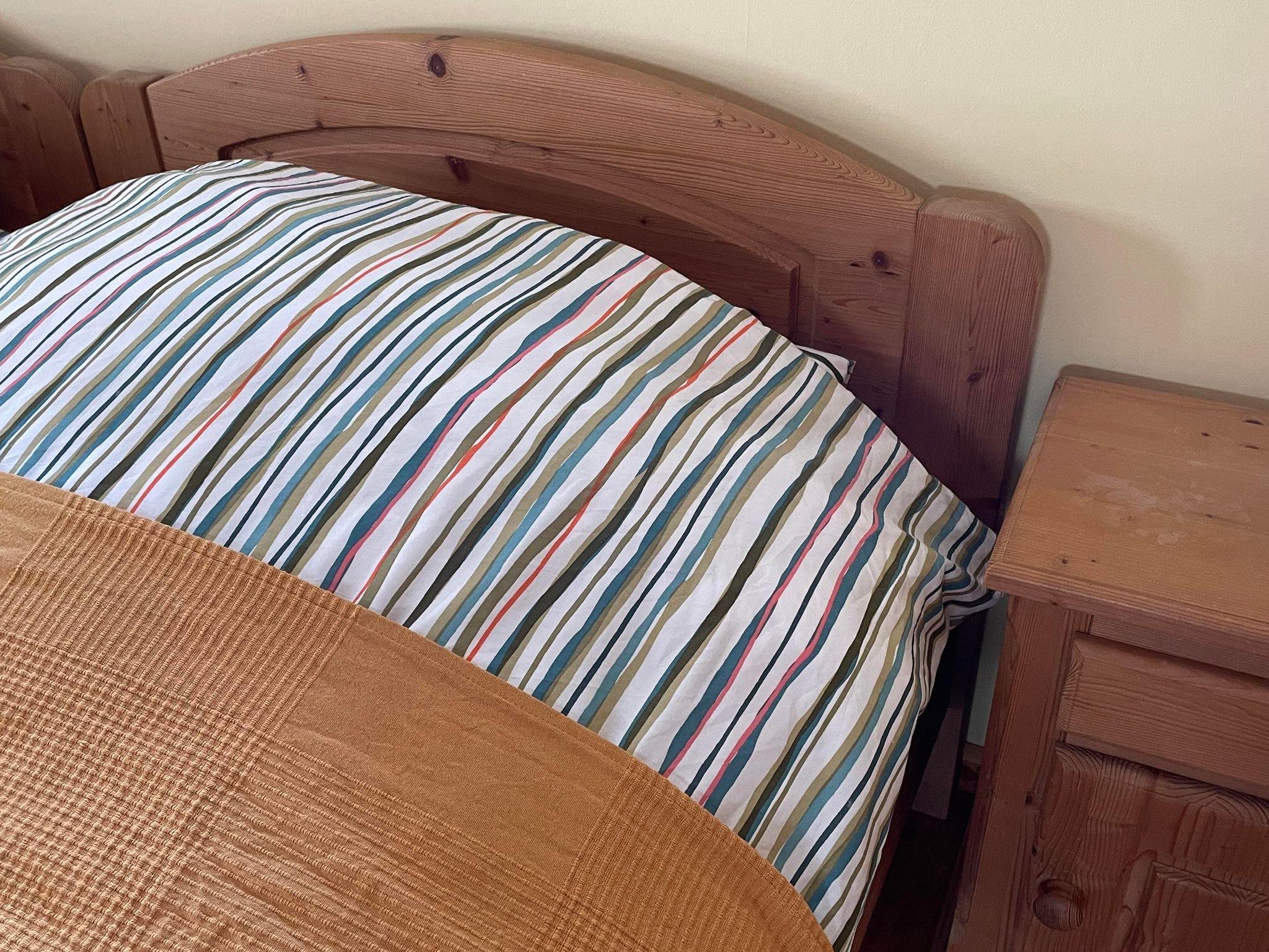 Ein großer Kleiderschrank, eine Kommode und zwei Nachttische mit Lampen bieten Komfort und Platz für Kleider und Utensilien.
