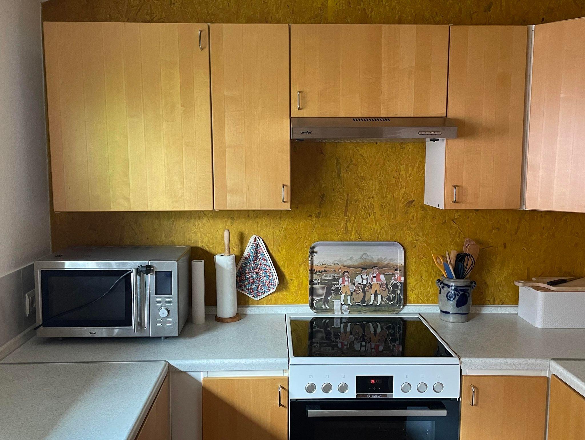 Die Küche ist voll eingerichtet mit Kochtöpfen, Geschirr, Gläsern, Wasserkocher, Kaffeemaschine, Pad-Maschine, Teeutensilien, Mikrowelle, Herd, Backofen, Kühlschrank, Spülmaschine, ...